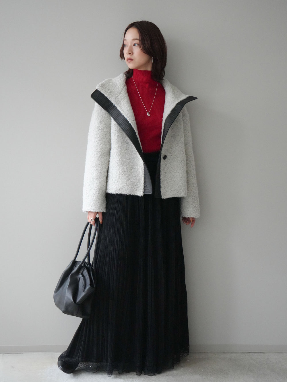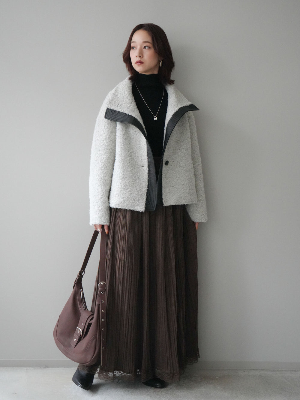 [SET]レザー切替ブークレブルゾン+袖ボタンボトルネックリブニットトップス+裾レーススウェードプリーツマキシスカート(3set)