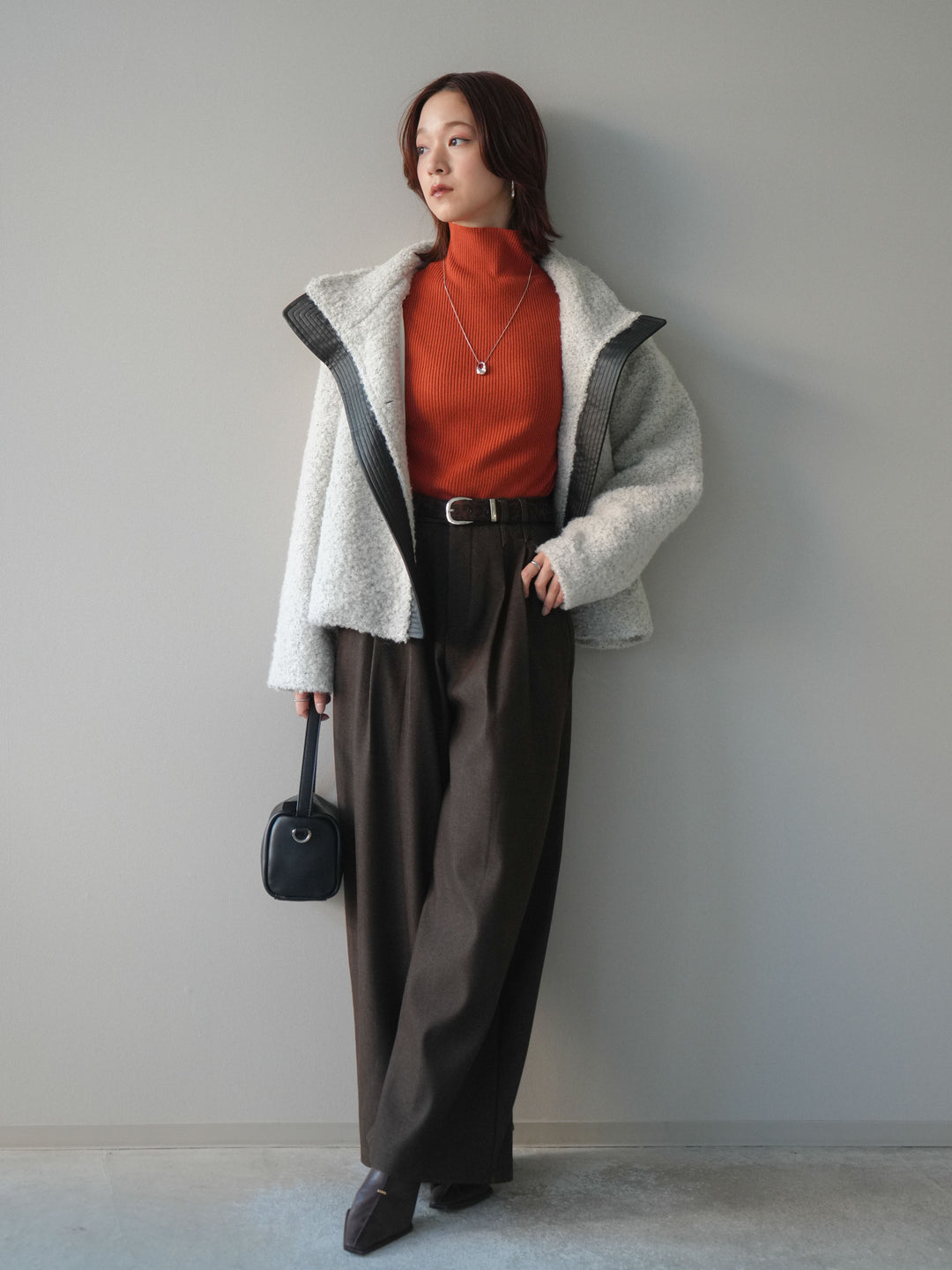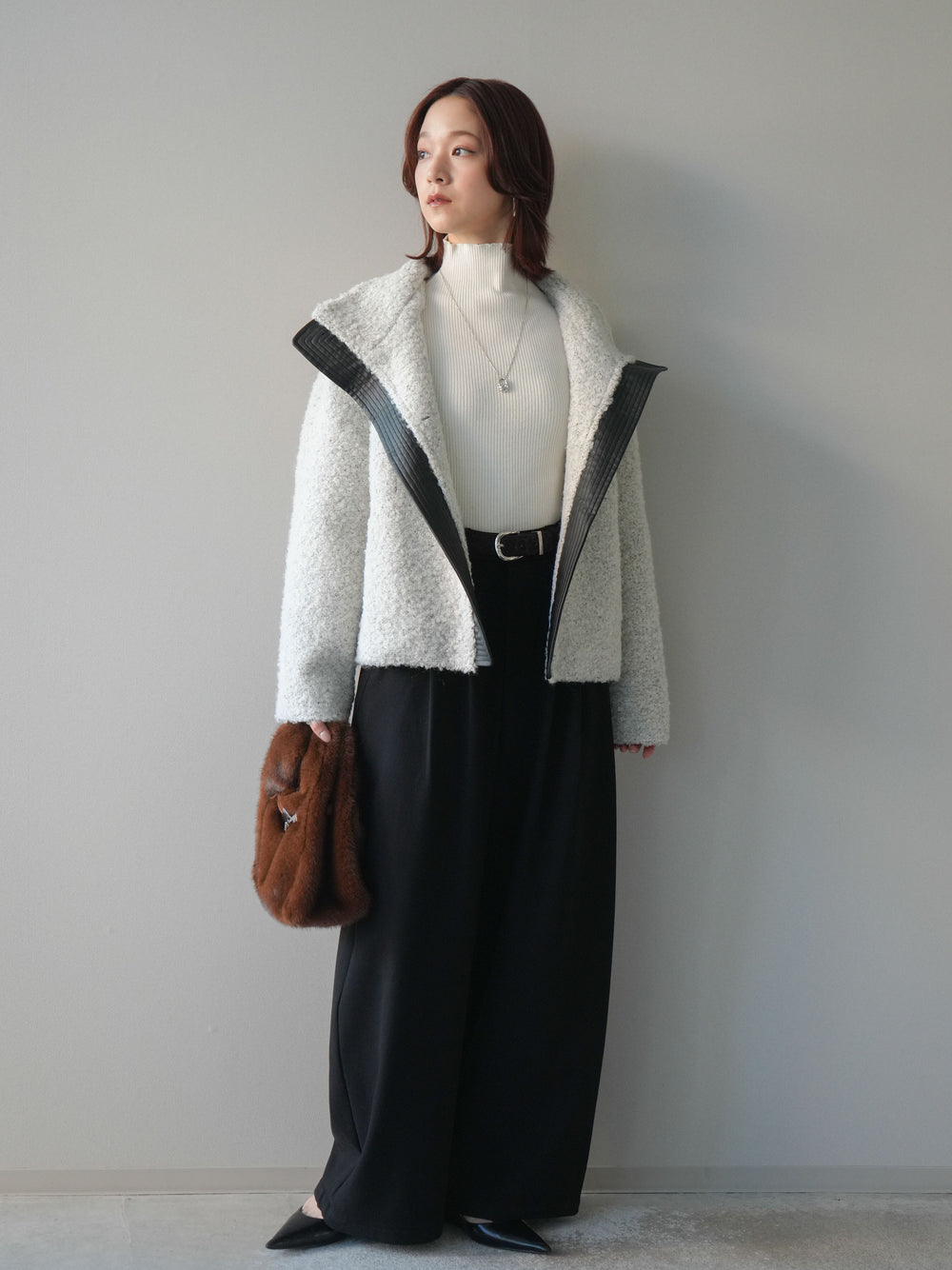 [SET]レザー切替ブークレブルゾン+袖ボタンボトルネックリブニットトップス+アニマル柄ベルト付きウールタッチワイドパンツ(3set)