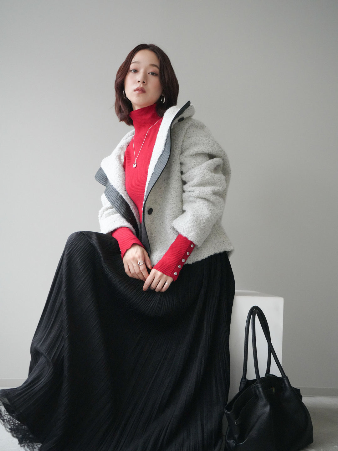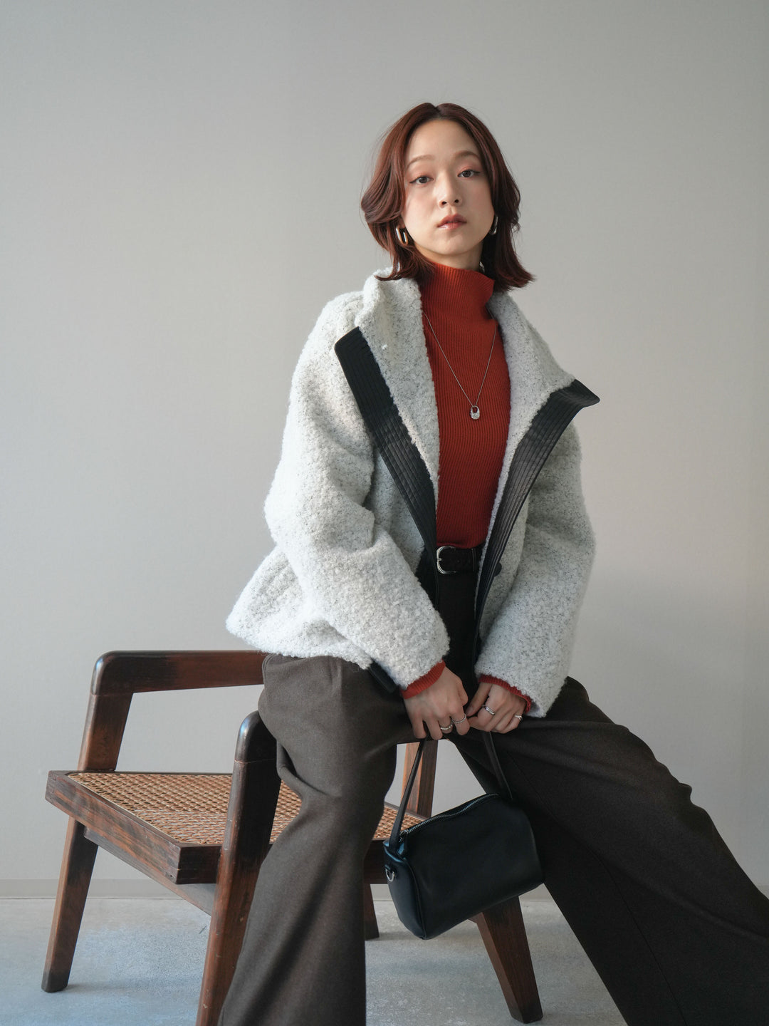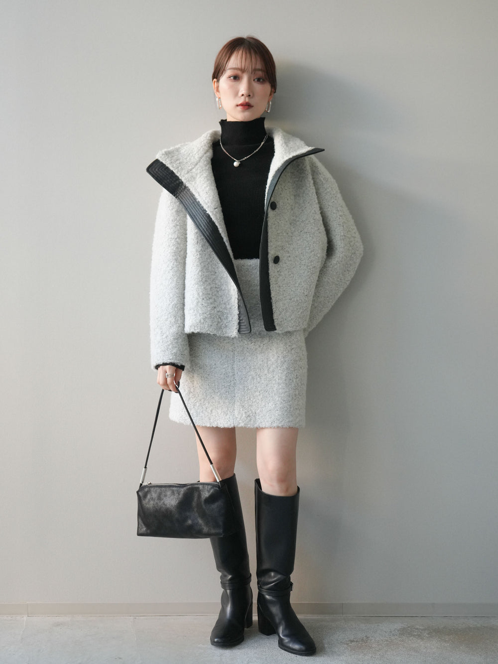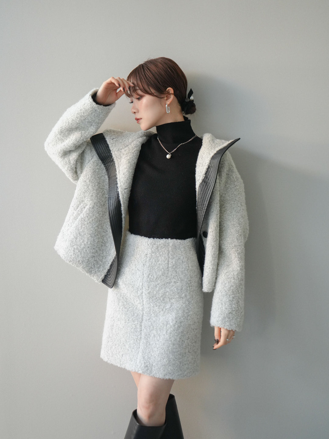 [SET]レザー切替ブークレブルゾン+袖ボタンボトルネックリブニットトップス+ブークレミニスカート(3set)