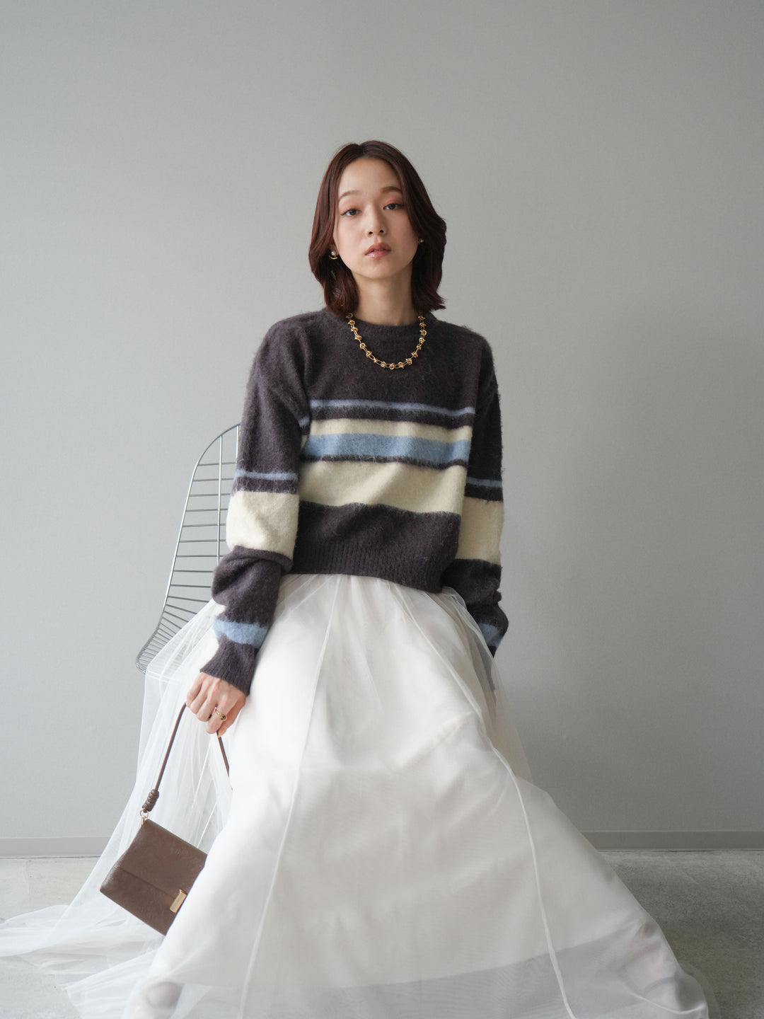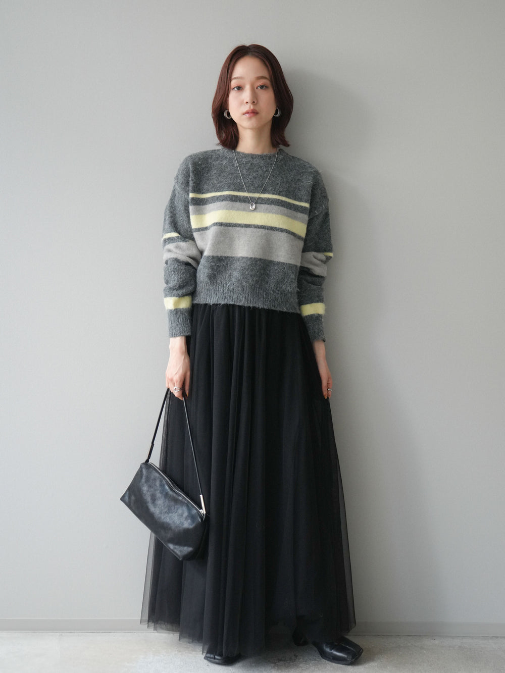 [SET]ソフトタッチボーダークロップドニットプルオーバー+チュールボリュームスカート(2set)