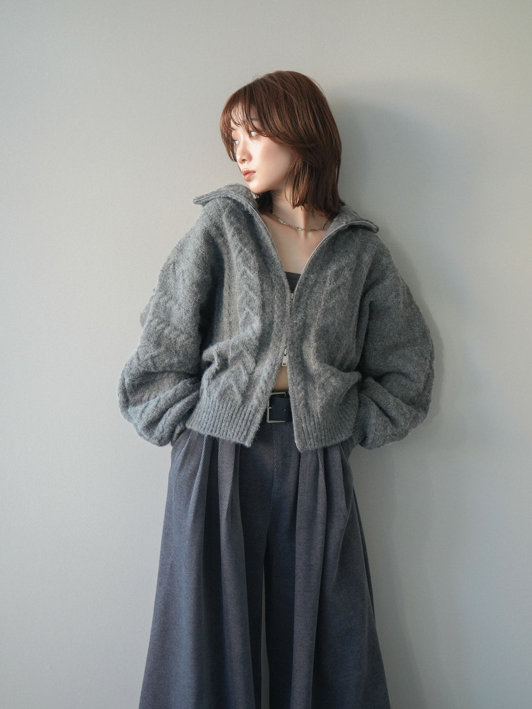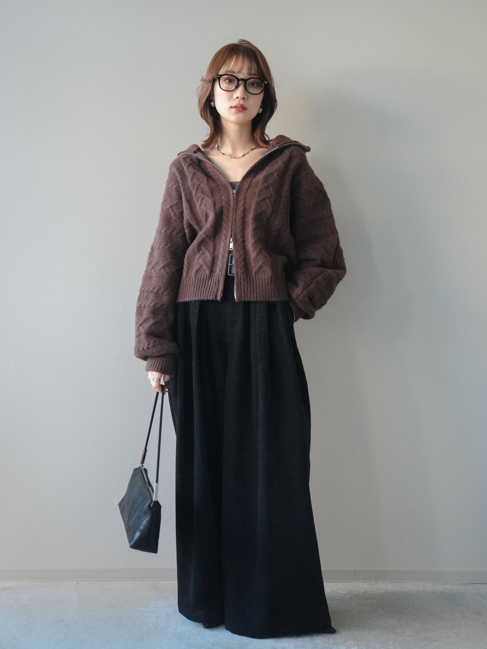 [SET]ケーブル編みハイネックZIPニットカーディガン+アニマル柄ベルト付きウールタッチワイドパンツ(2set)