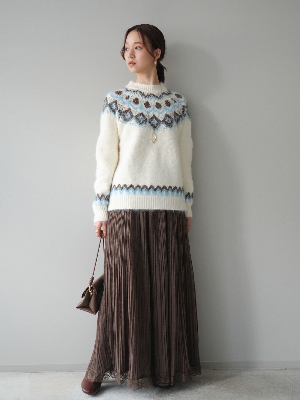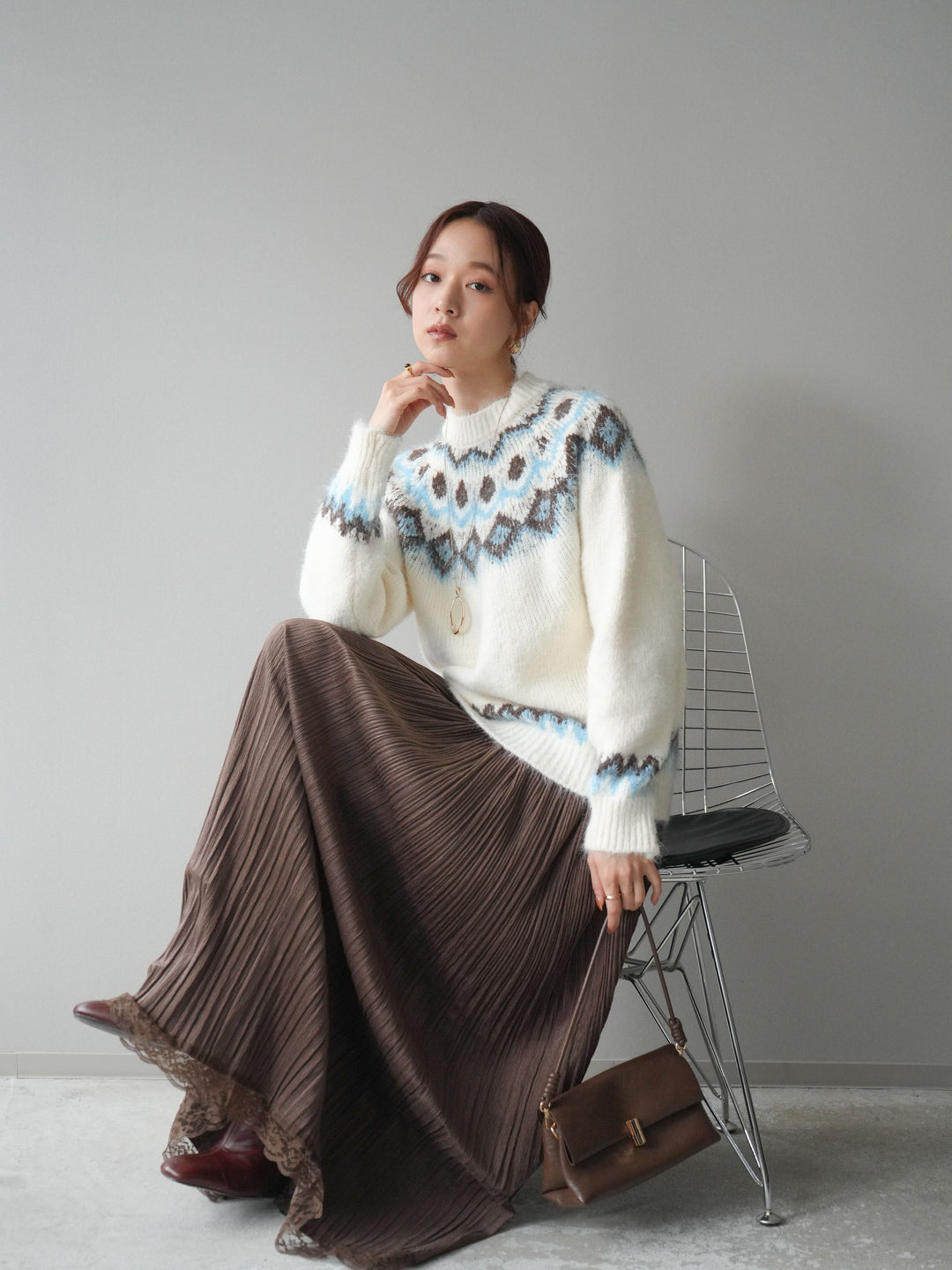 [SET]ソフトタッチ求心柄ニットプルオーバー+裾レーススウェードプリーツマキシスカート(2set)