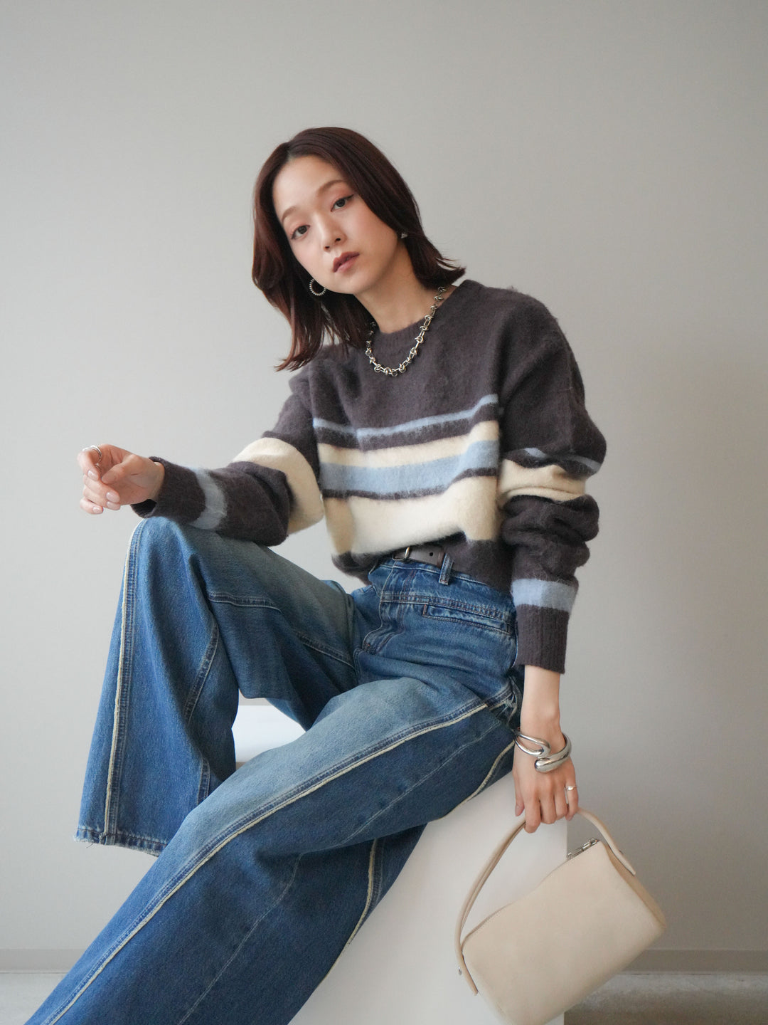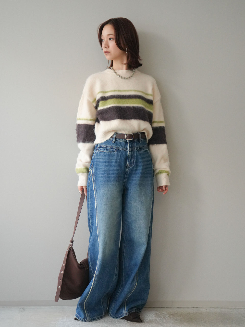 [SET]ソフトタッチボーダークロップドニットプルオーバー+サイドフリンジワイドデニムパンツ(2set)