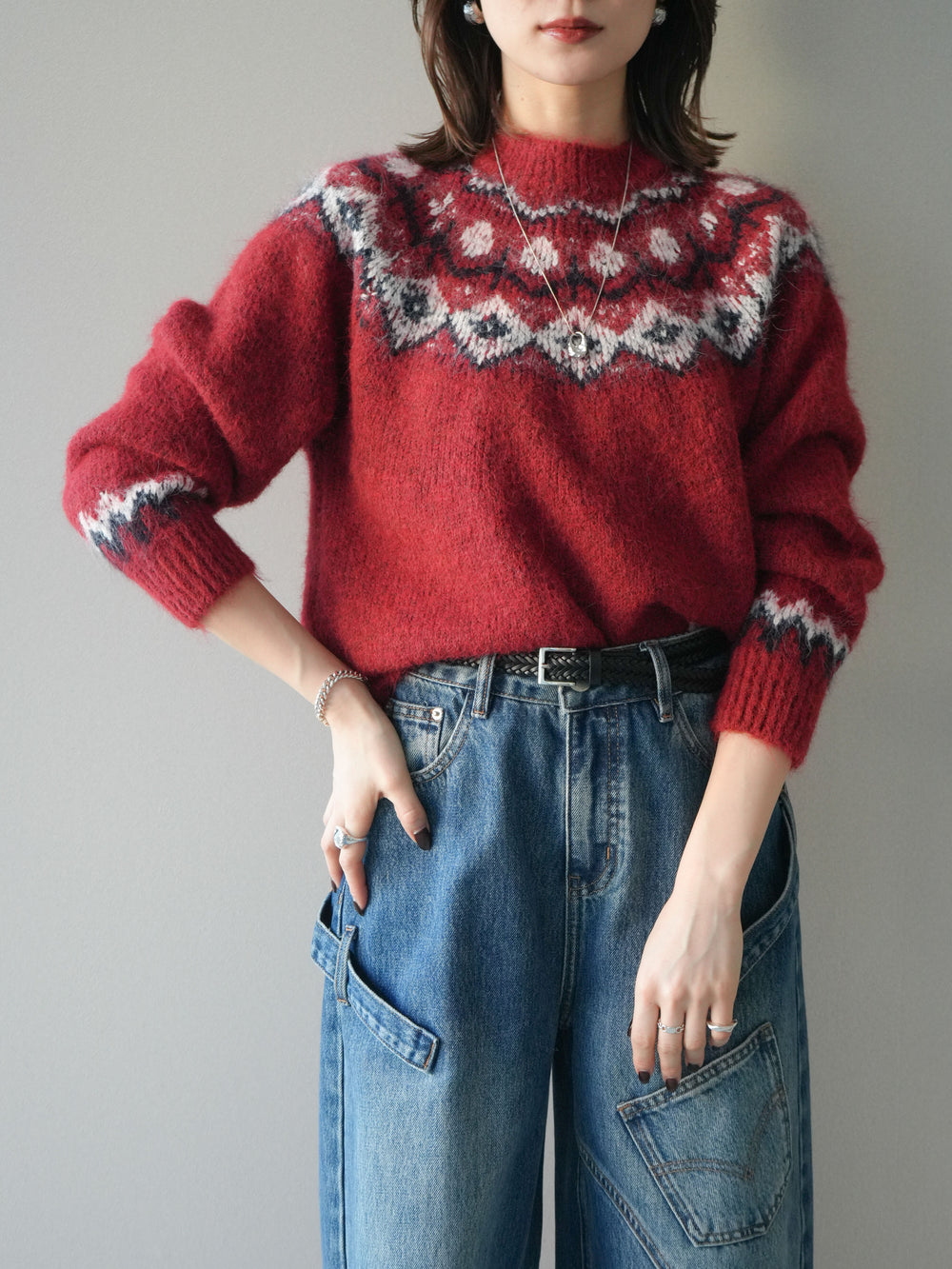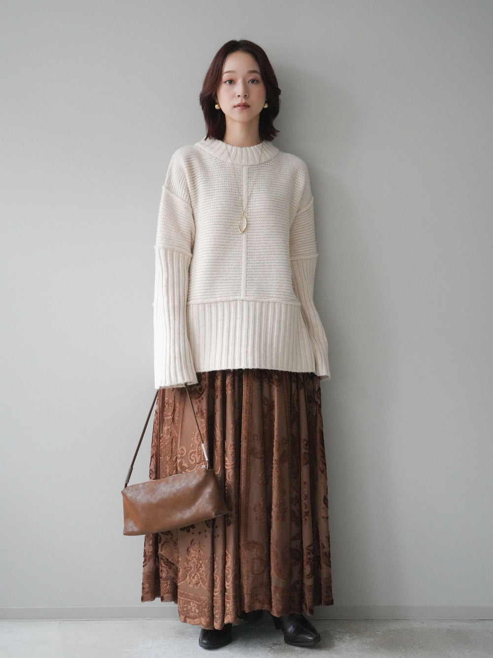 [SET]編み地切替ボトルネックニットプルオーバー+アンティーク柄フロッキーマキシスカート(2set)