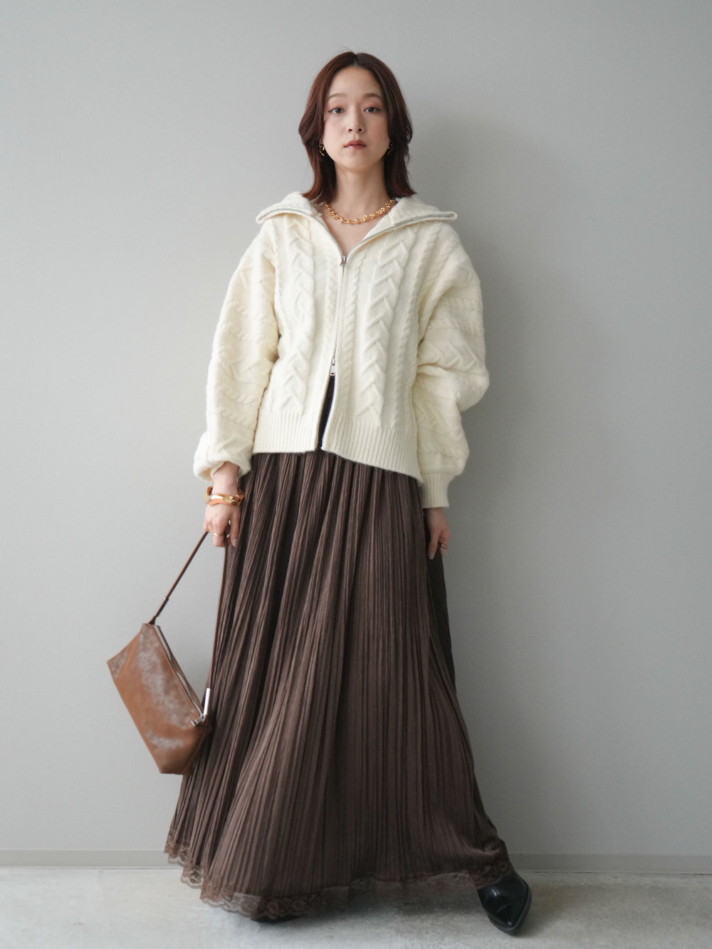 [SET]ケーブル編みハイネックZIPニットカーディガン+裾レーススウェードプリーツマキシスカート(2set)