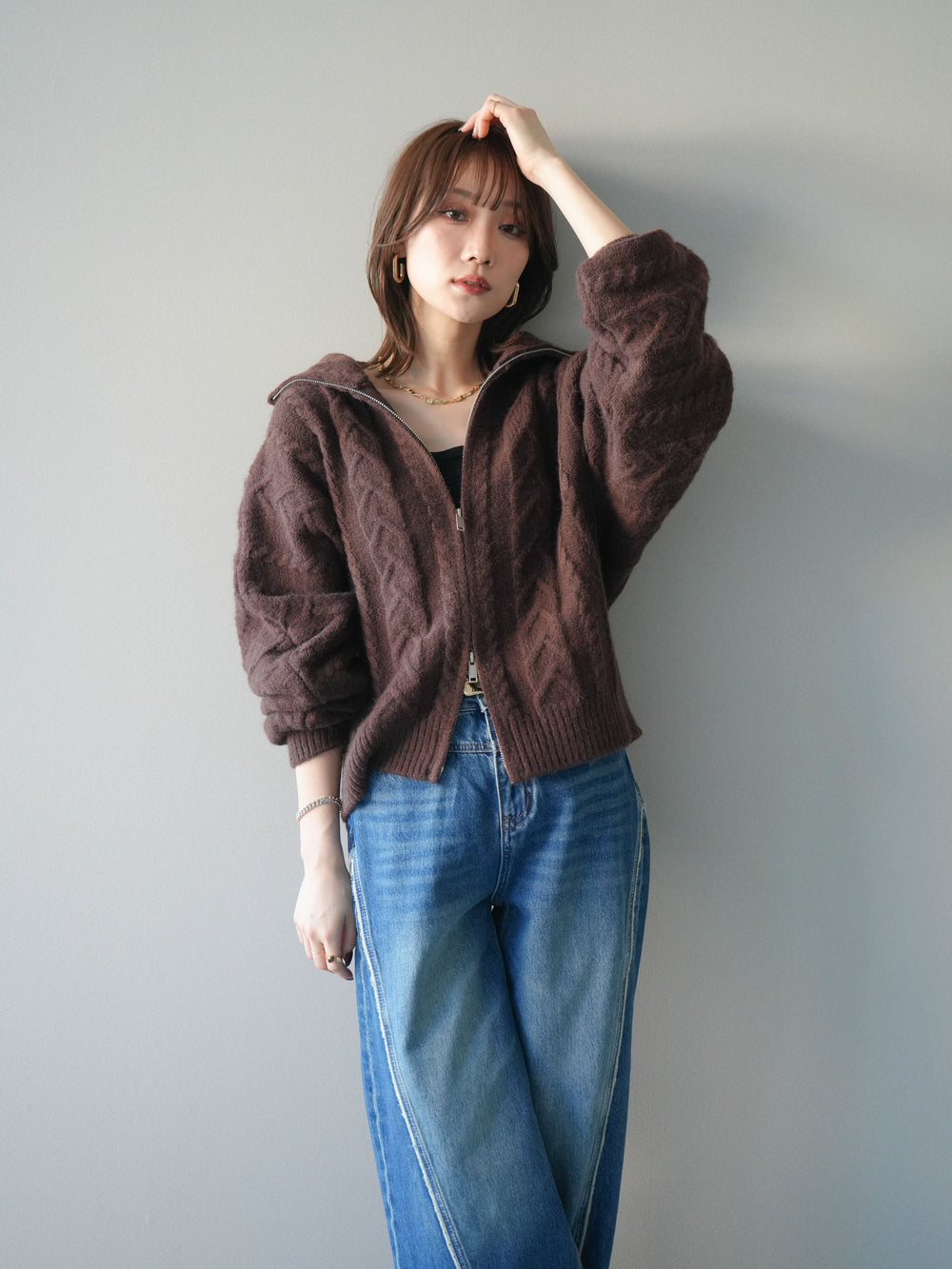 [SET]ケーブル編みハイネックZIPニットカーディガン+サイドフリンジワイドデニムパンツ(2set)