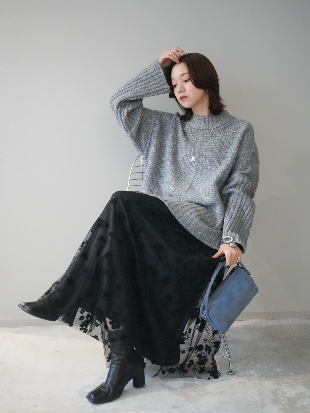 [SET]編み地切替ボトルネックニットプルオーバー+フラワーフロッキーチュールプリーツスカート(2set)