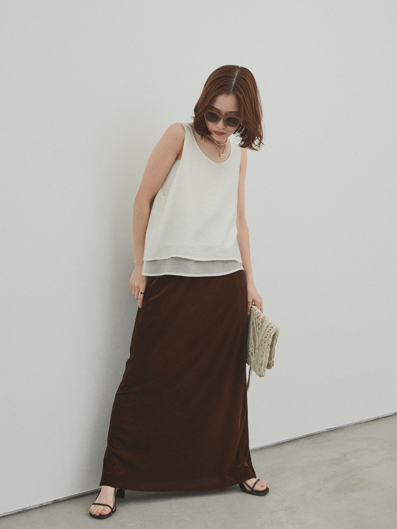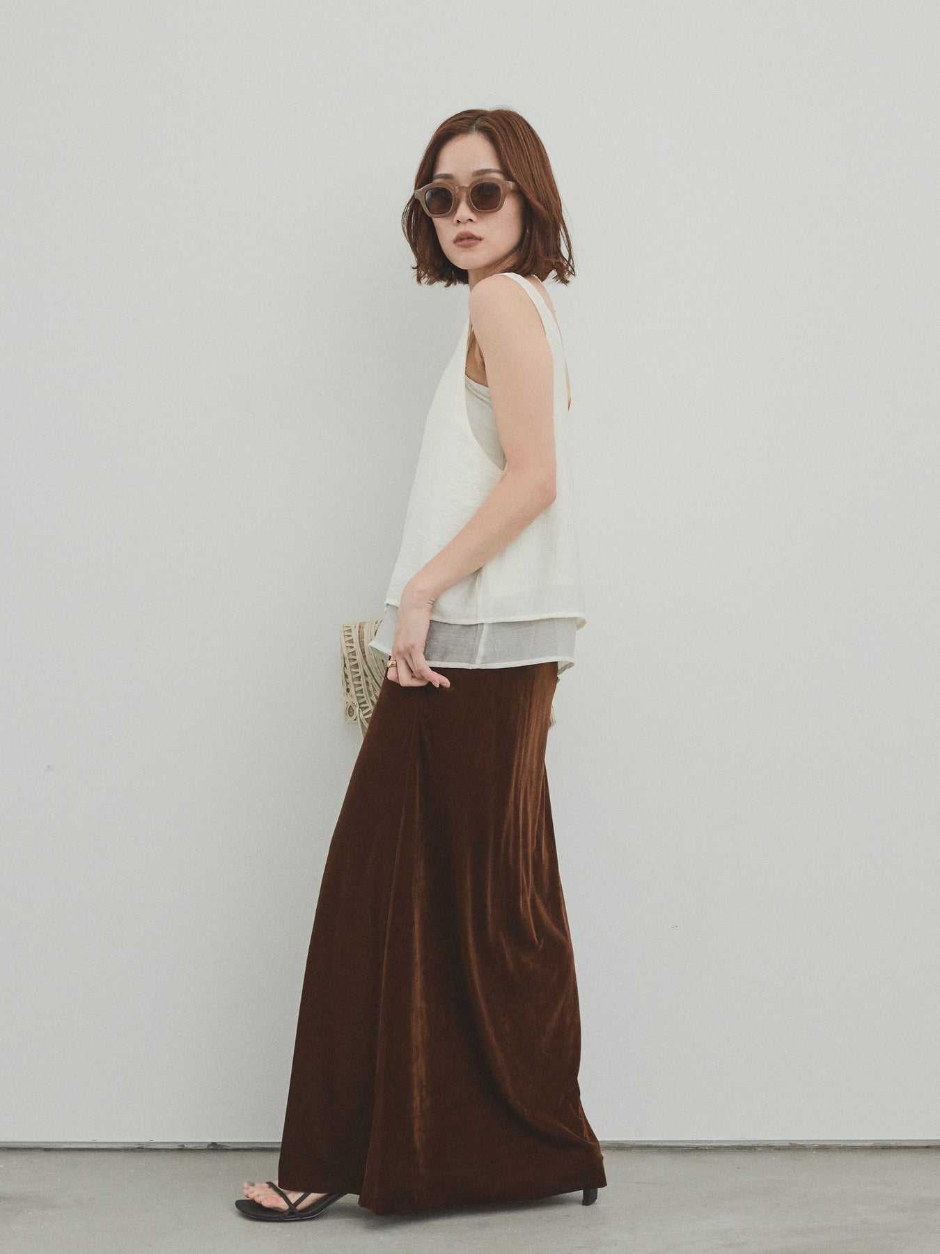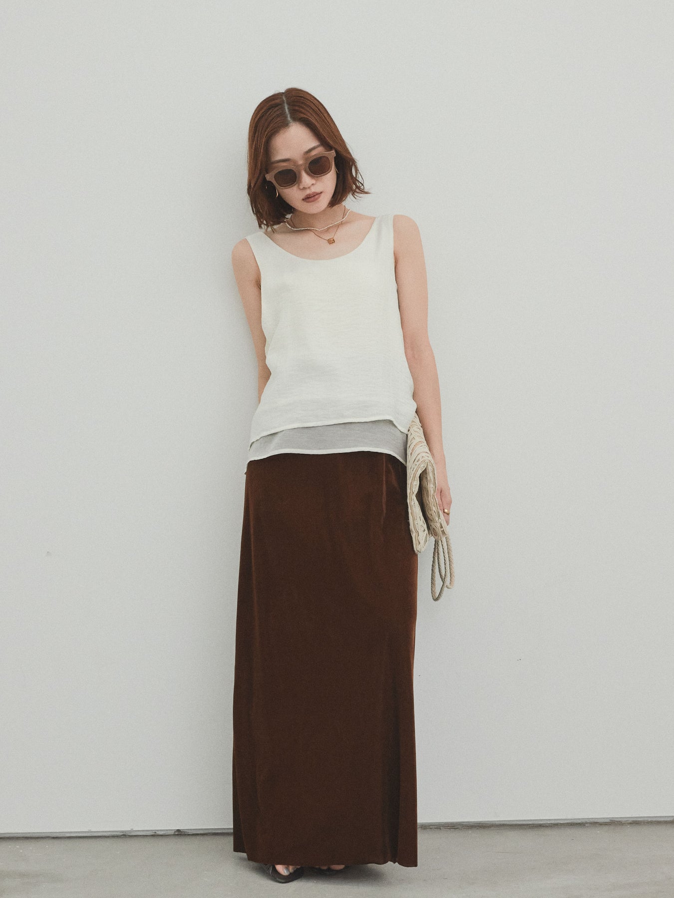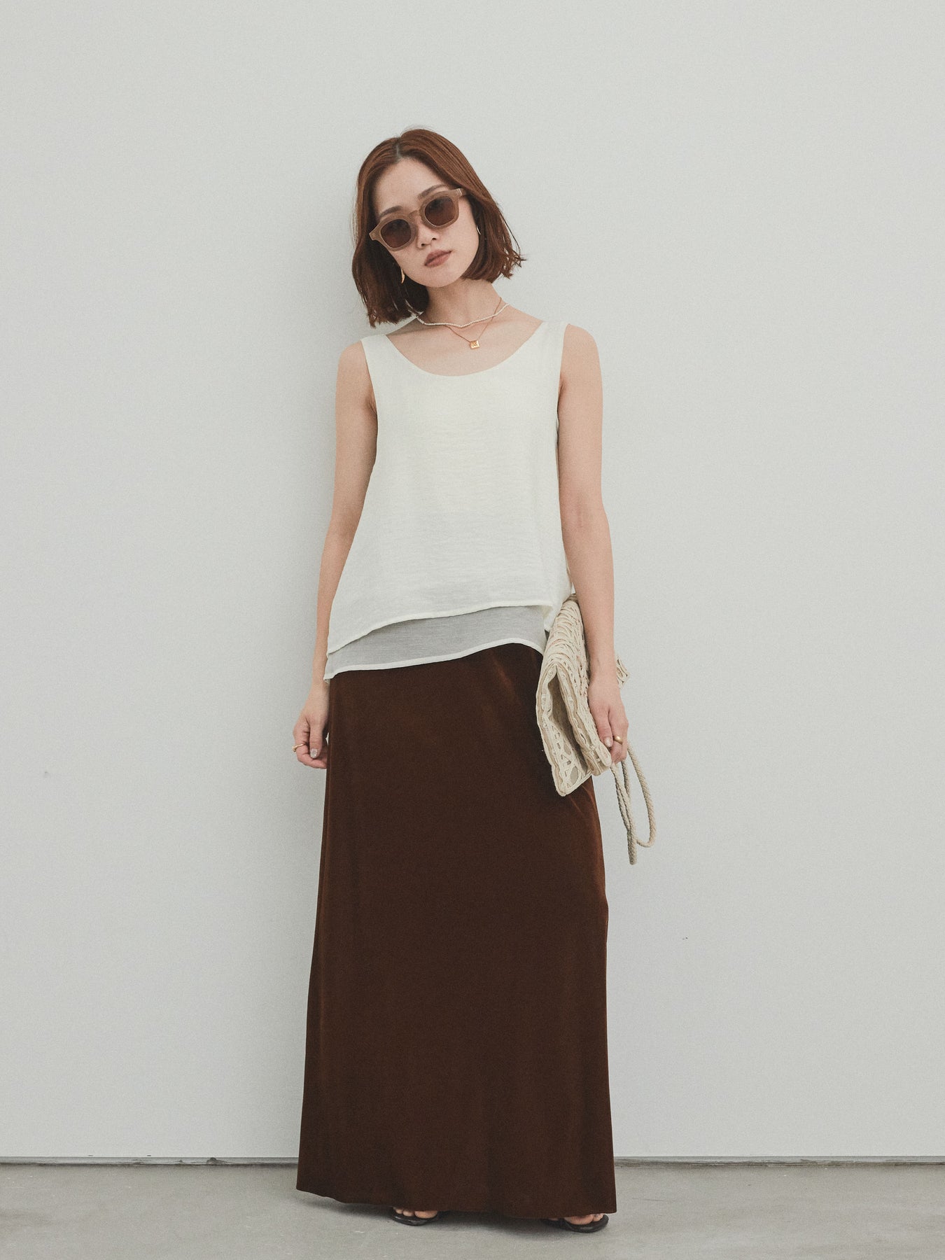 [SET]ワッシャーサテンシアーレイヤードタンクトップ+ベロアナロースカート(2set)