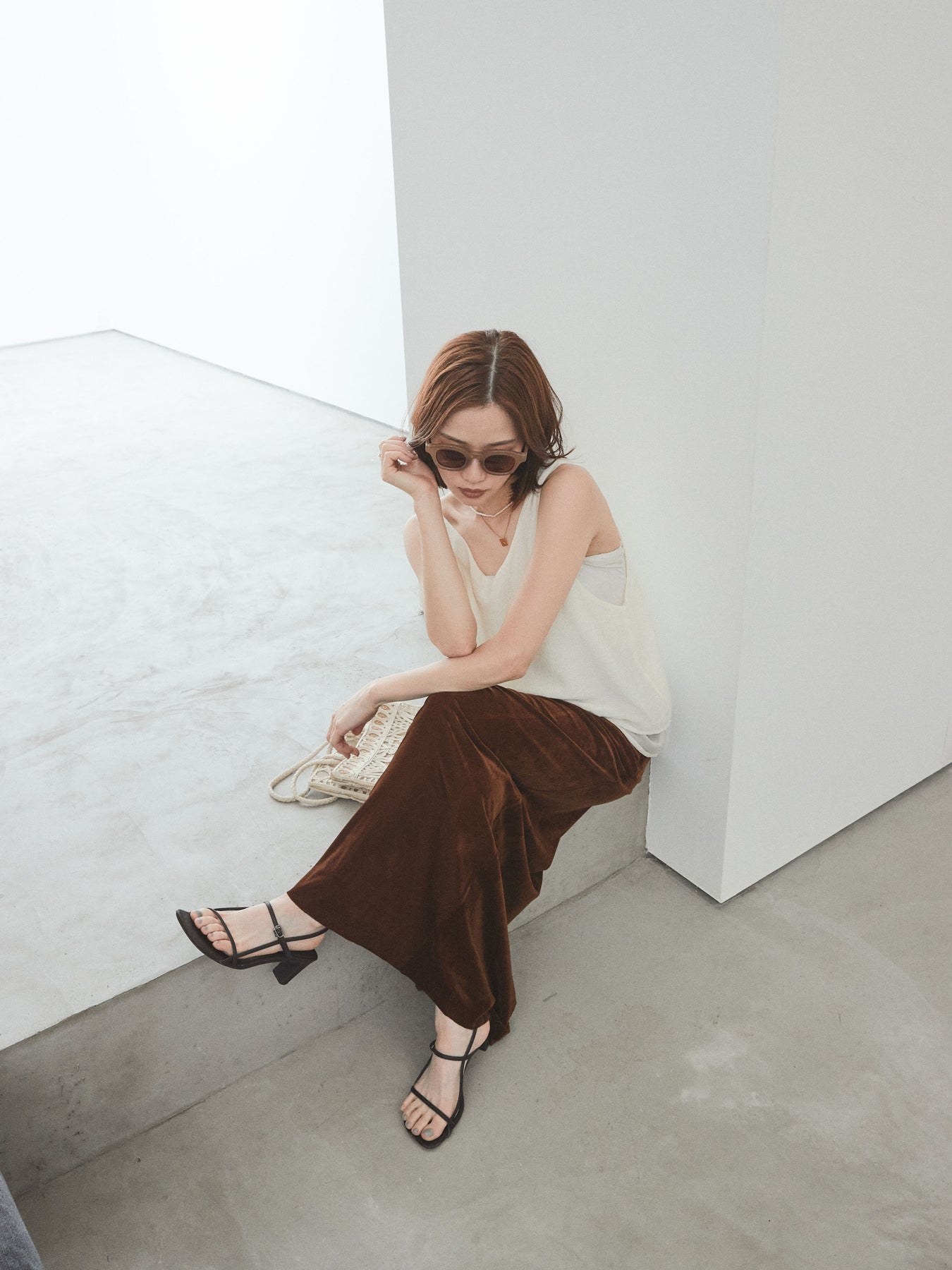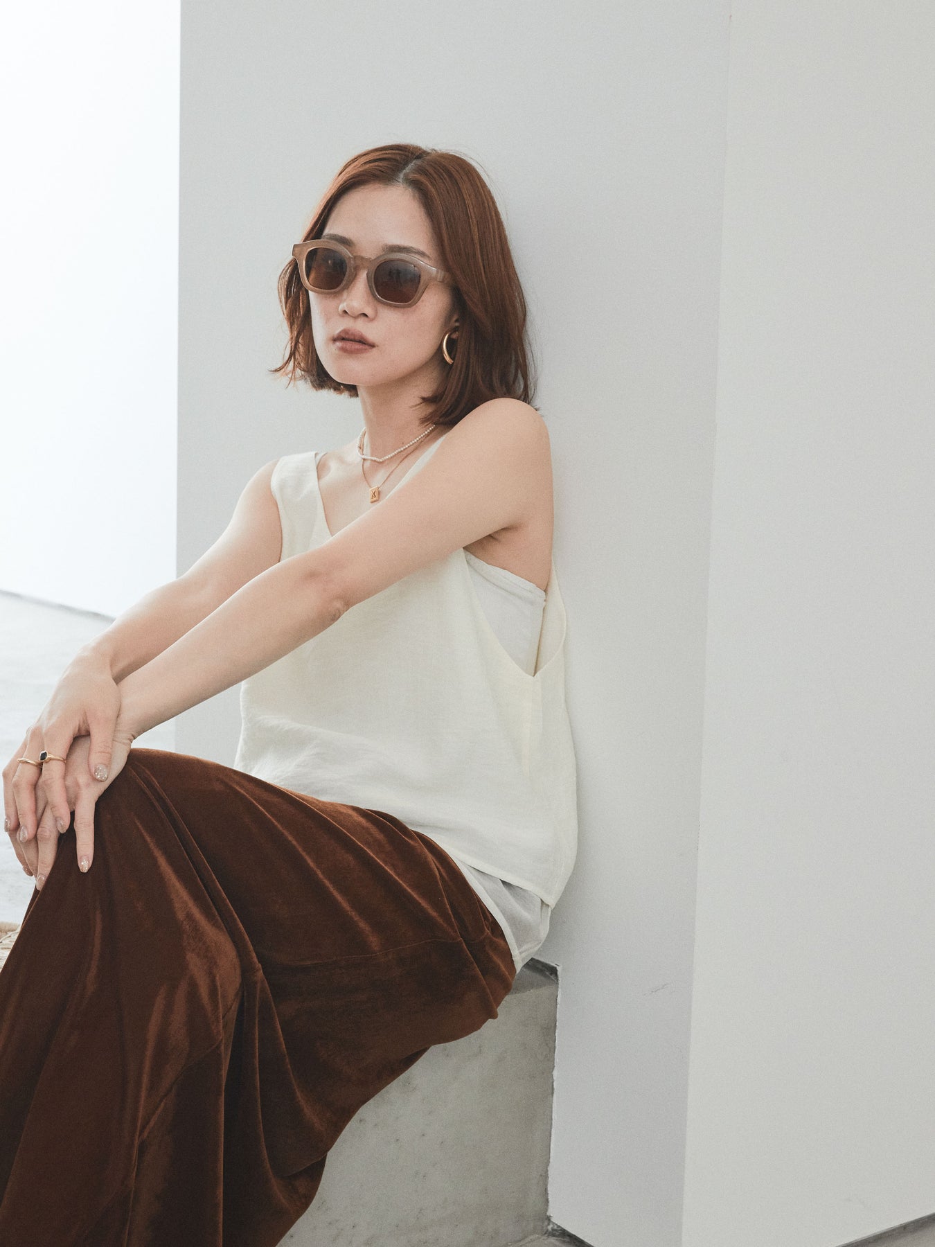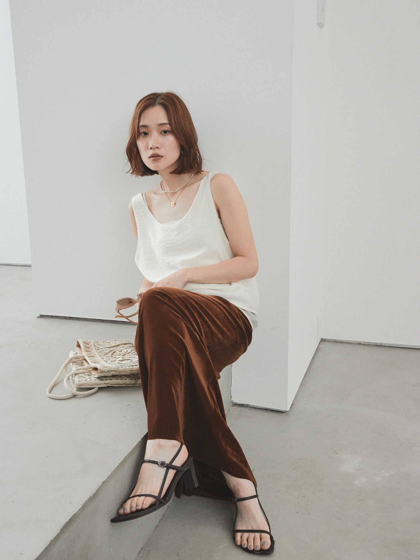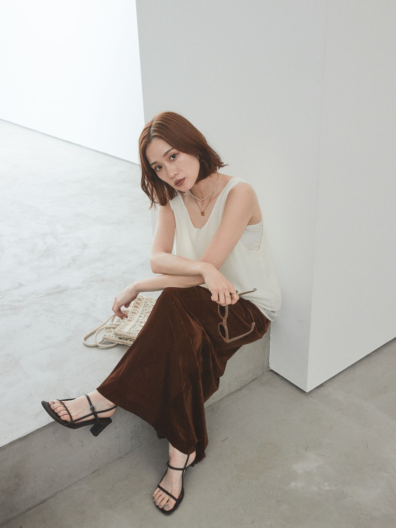 [SET]ワッシャーサテンシアーレイヤードタンクトップ+ベロアナロースカート(2set)