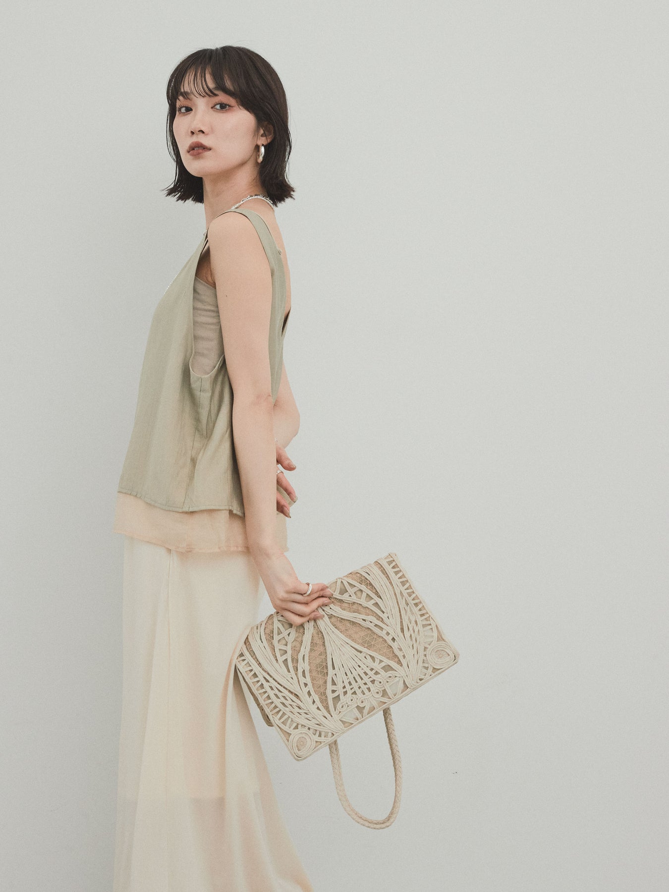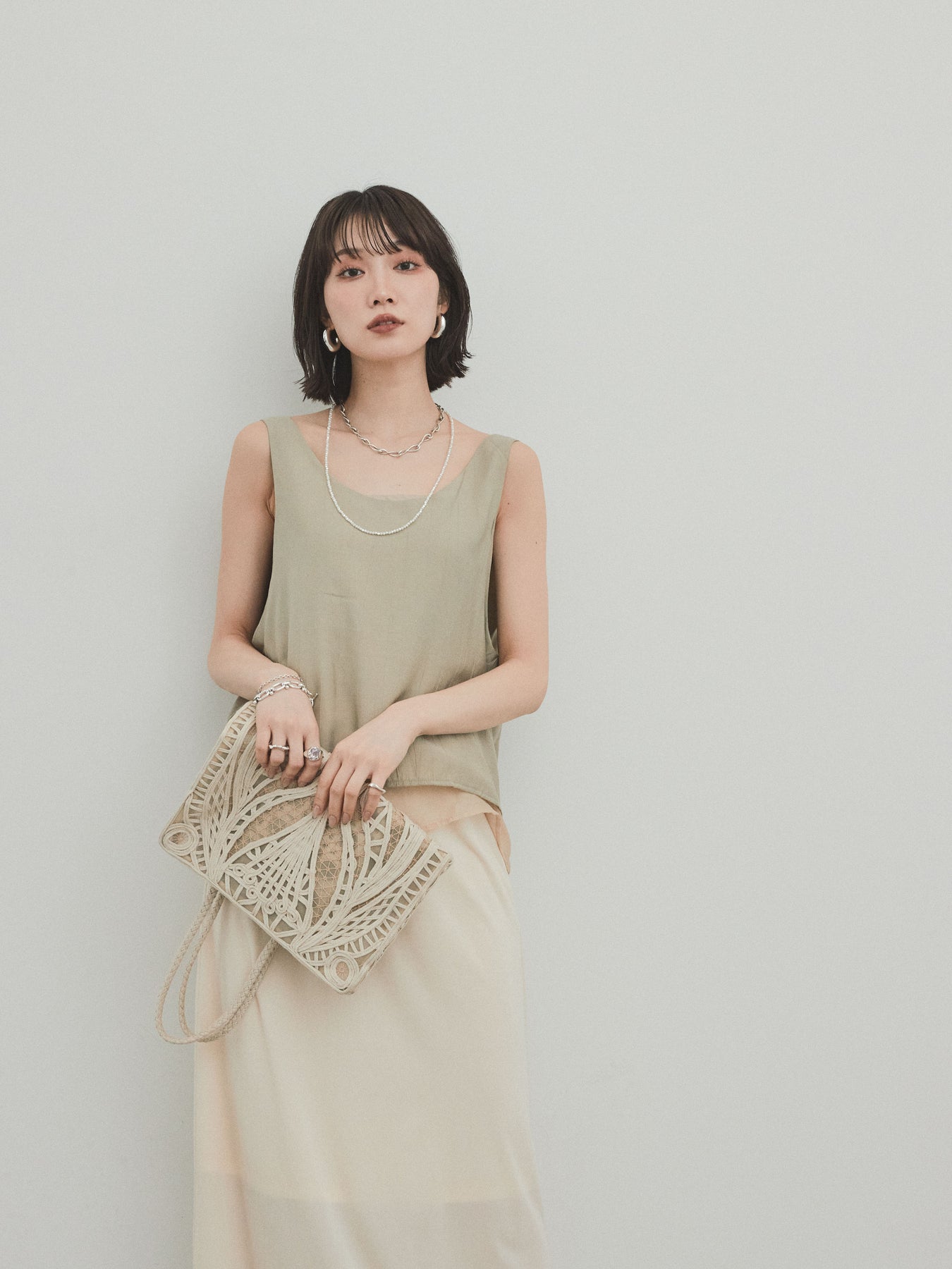 軽やかなサテン素材とシアー素材をレイヤードした、ワッシャーサテンシアーレイヤードタンクトップ。程よい光沢とニュアンスのある風合いが、シンプルながらも上品な印象を与えます。異素材の重なりが立体感を生み出し、1枚で存在感のあるスタイルに。ゆとりのあるシルエットで体のラインを拾わず、涼しげな着心地も魅力です。カジュアルからきれいめまで幅広いコーディネートにマッチする、夏の主役トップスとして活躍する一枚です。 ※ボトムス、キャミソール(インナー)以外の商品は一律でインナーは付属していません。