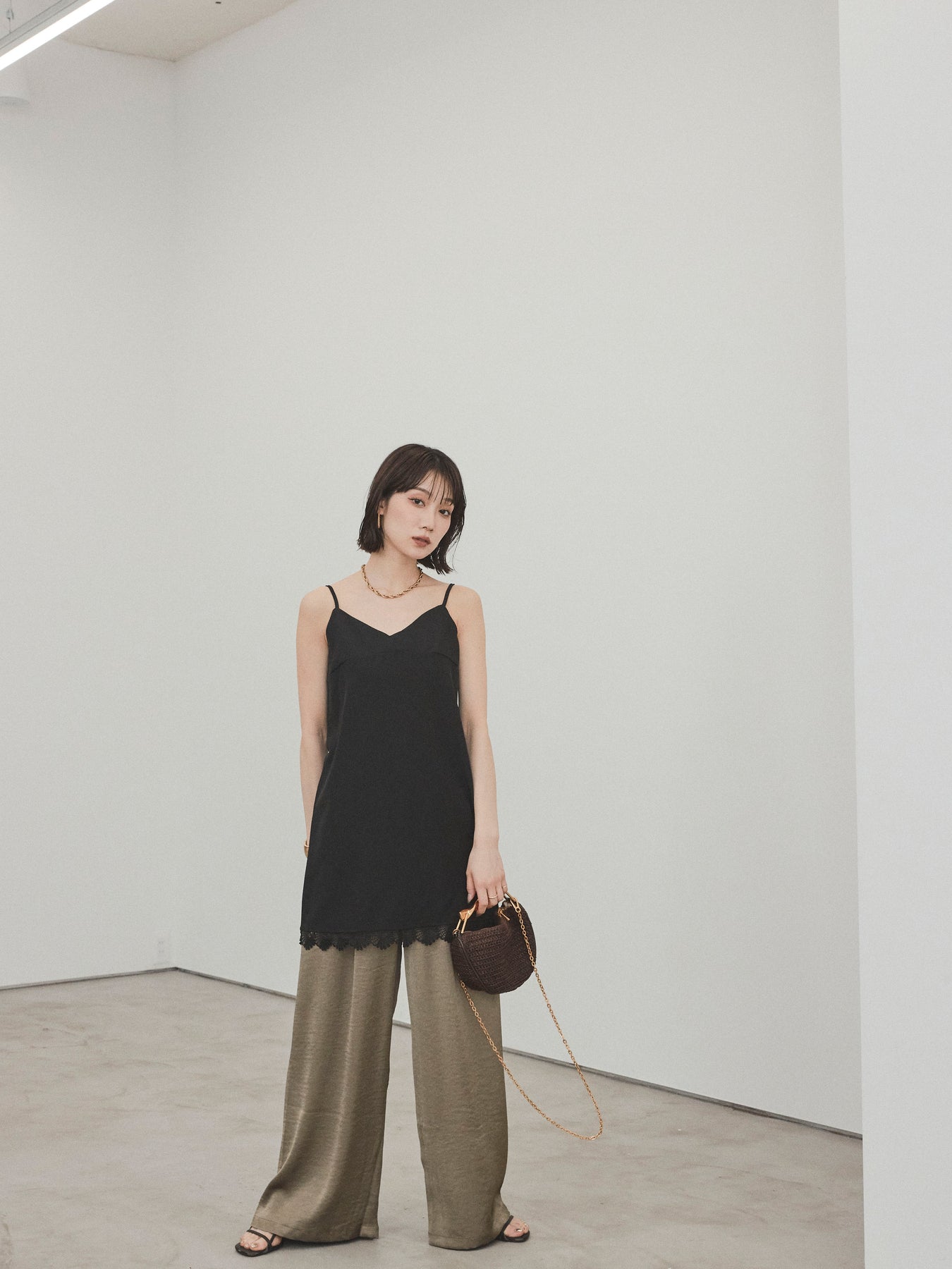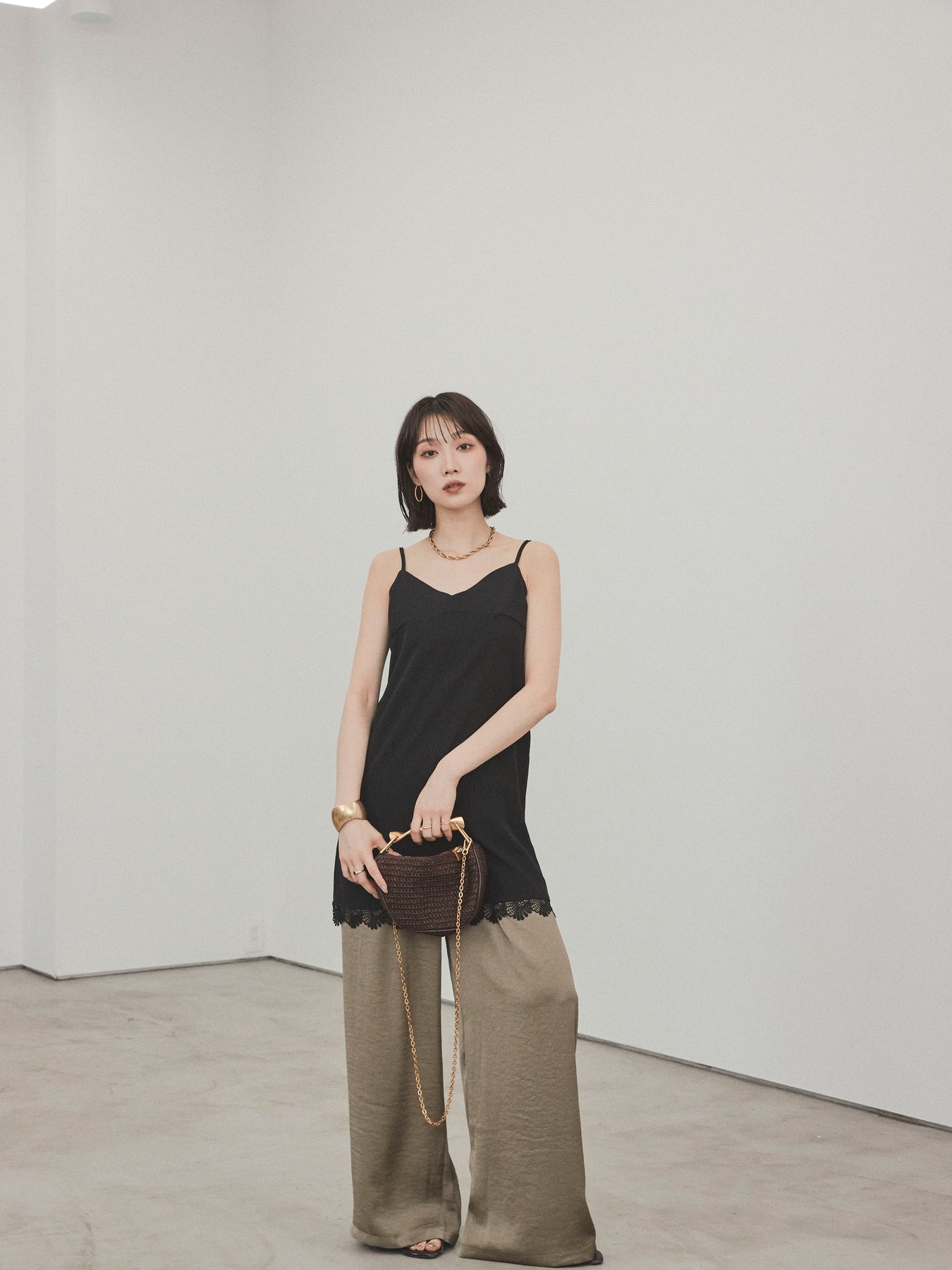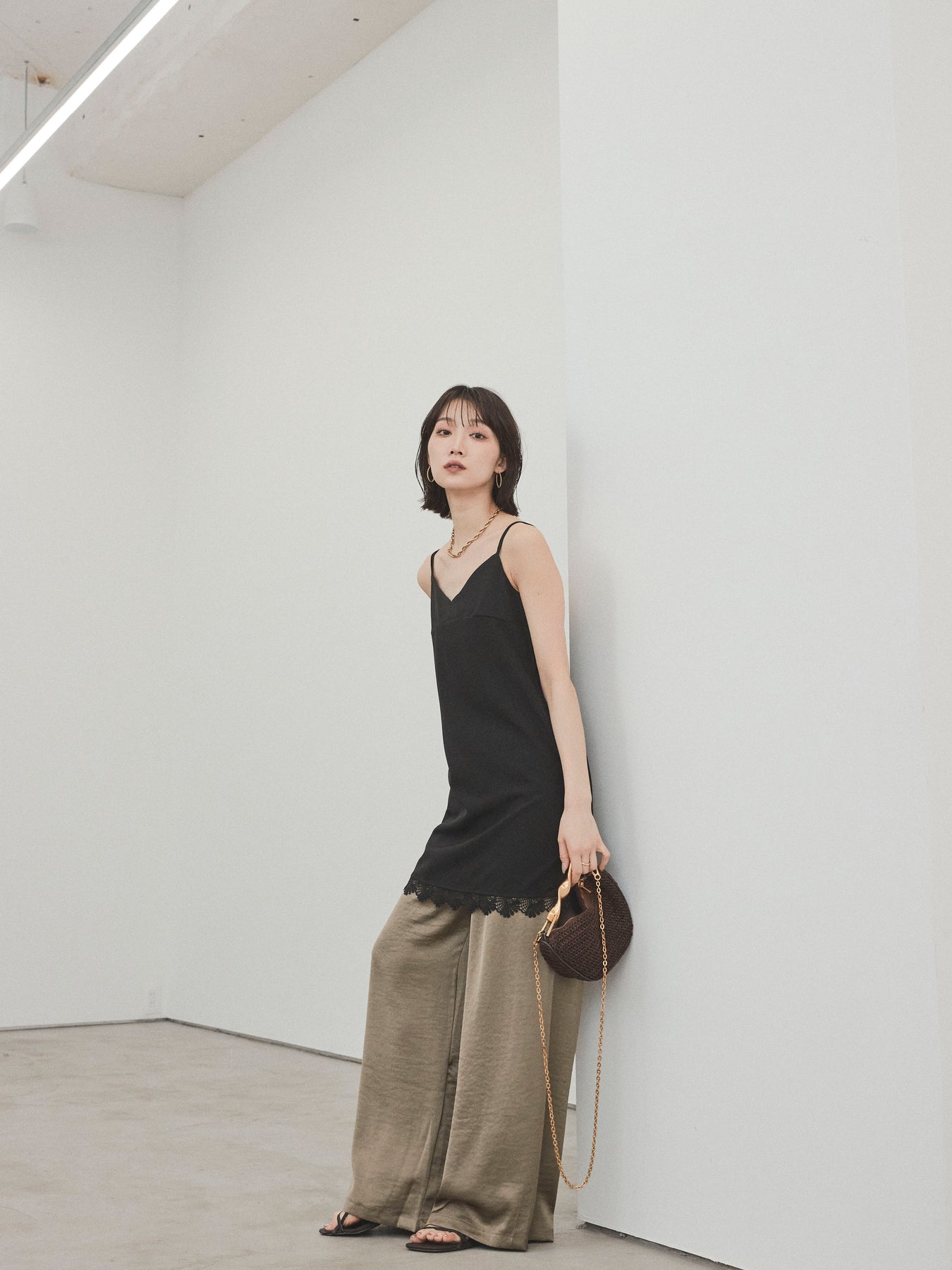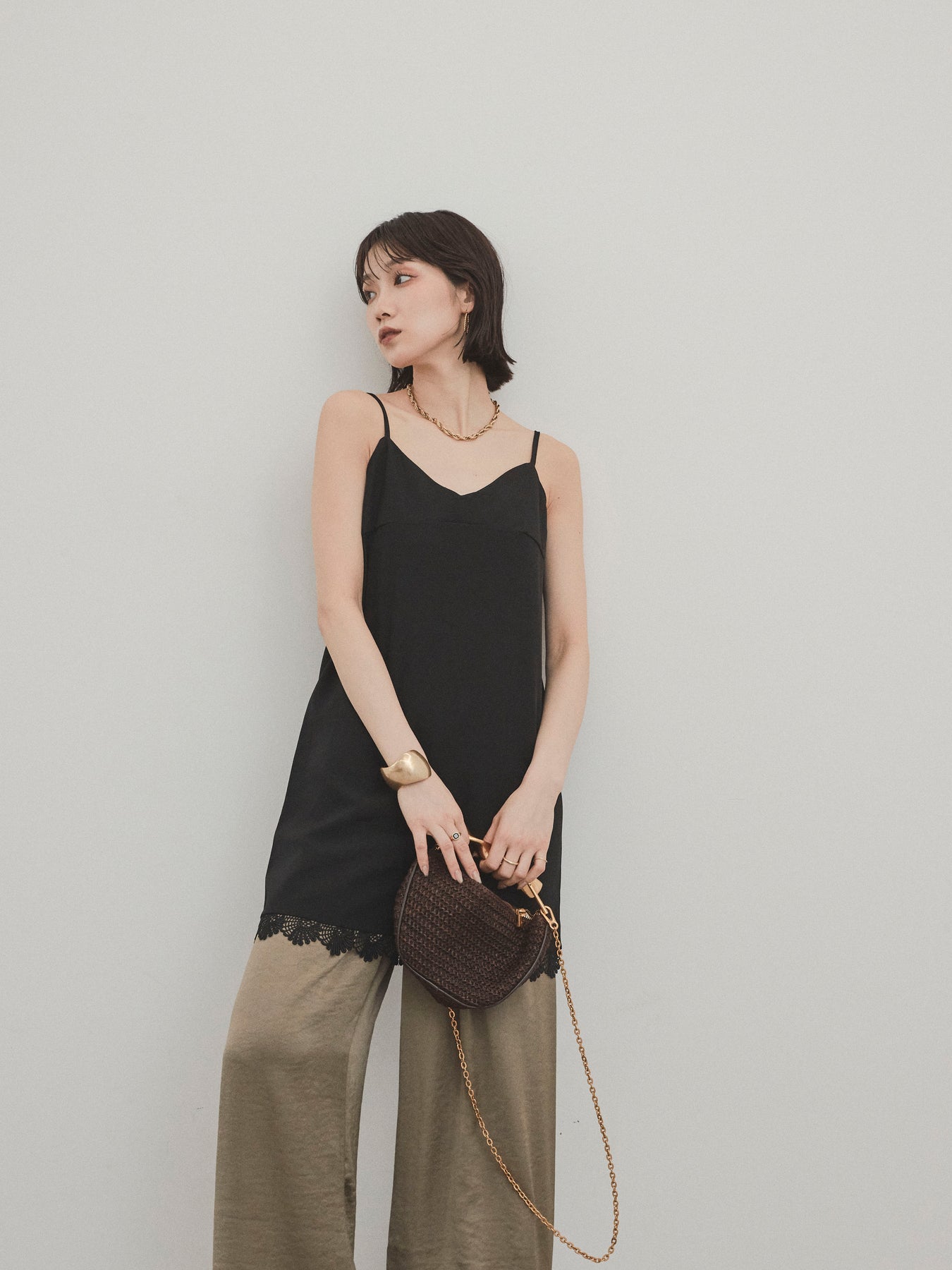 裾にあしらわれた繊細なレースが目を惹く、フェミニンムード漂うキャミミニワンピース。 落ち感のある滑らかな素材で仕立てられ、すとんとしたシルエットが大人の余裕を感じさせます。 華奢なストラップとデコルテラインを綺麗に見せるカッティングが、抜け感を演出しつつ上品な印象に。 裾のレースがさりげなくアクセントになり、レイヤードスタイルにも映えるデザインです。 パンツやデニムとのレイヤードはもちろん、シアートップスやカーディガンとの組み合わせもおすすめ。 ロングシーズン活躍する、ワードローブに加えたい一着です。