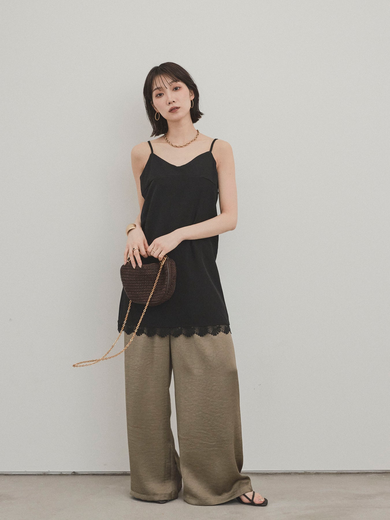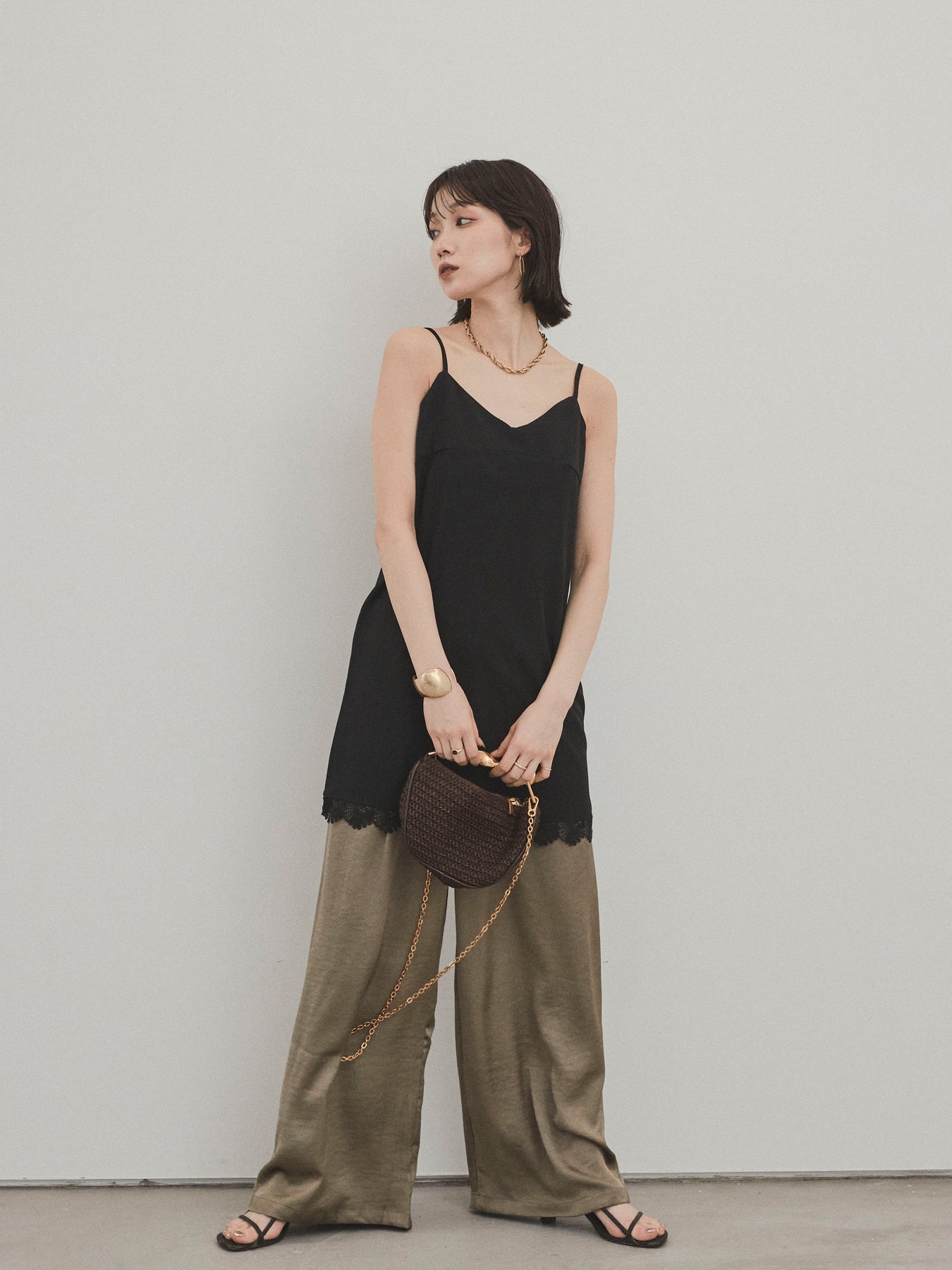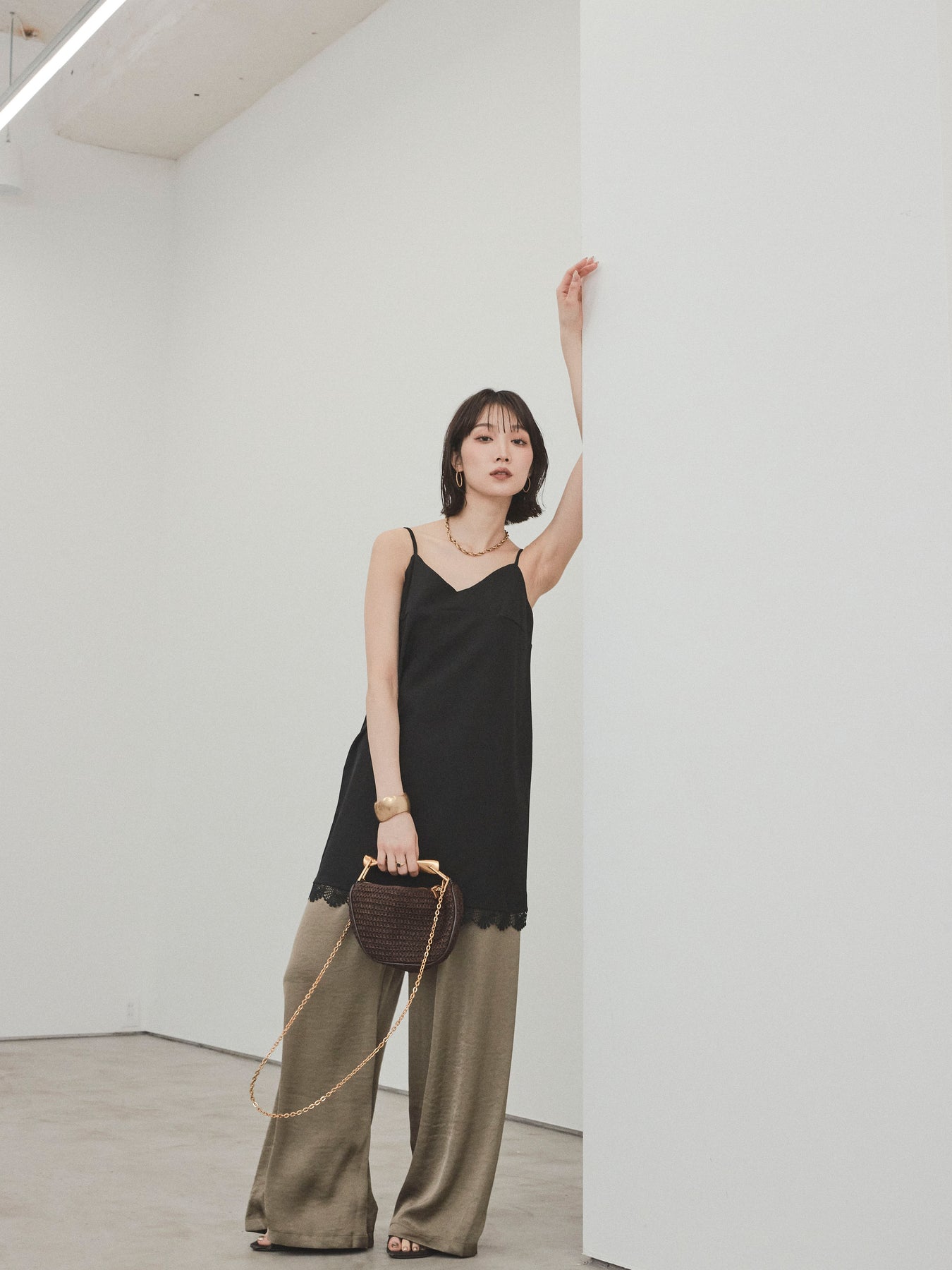 裾にあしらわれた繊細なレースが目を惹く、フェミニンムード漂うキャミミニワンピース。 落ち感のある滑らかな素材で仕立てられ、すとんとしたシルエットが大人の余裕を感じさせます。 華奢なストラップとデコルテラインを綺麗に見せるカッティングが、抜け感を演出しつつ上品な印象に。 裾のレースがさりげなくアクセントになり、レイヤードスタイルにも映えるデザインです。 パンツやデニムとのレイヤードはもちろん、シアートップスやカーディガンとの組み合わせもおすすめ。 ロングシーズン活躍する、ワードローブに加えたい一着です。