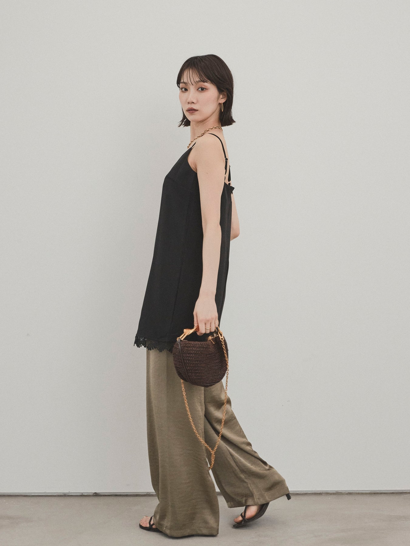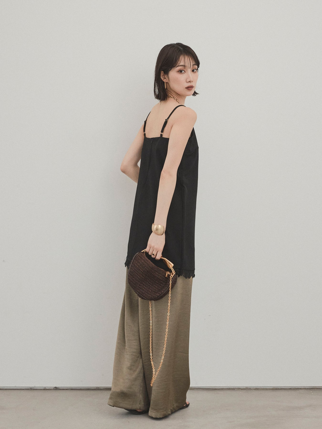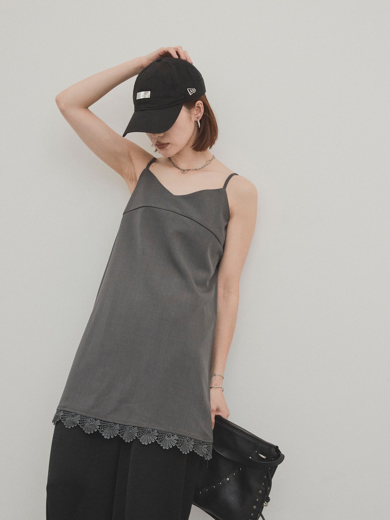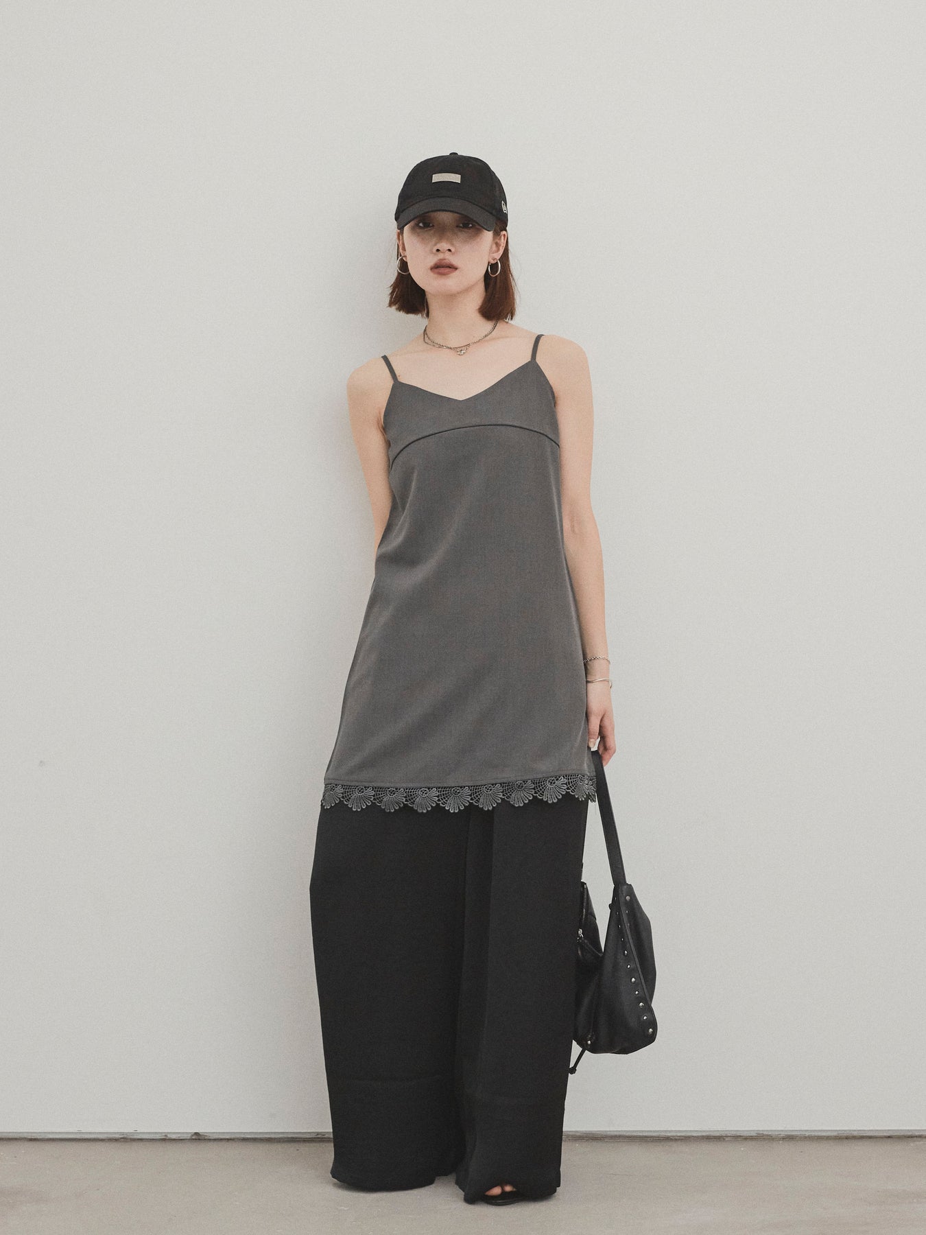 裾にあしらわれた繊細なレースが目を惹く、フェミニンムード漂うキャミミニワンピース。 落ち感のある滑らかな素材で仕立てられ、すとんとしたシルエットが大人の余裕を感じさせます。 華奢なストラップとデコルテラインを綺麗に見せるカッティングが、抜け感を演出しつつ上品な印象に。 裾のレースがさりげなくアクセントになり、レイヤードスタイルにも映えるデザインです。 パンツやデニムとのレイヤードはもちろん、シアートップスやカーディガンとの組み合わせもおすすめ。 ロングシーズン活躍する、ワードローブに加えたい一着です。