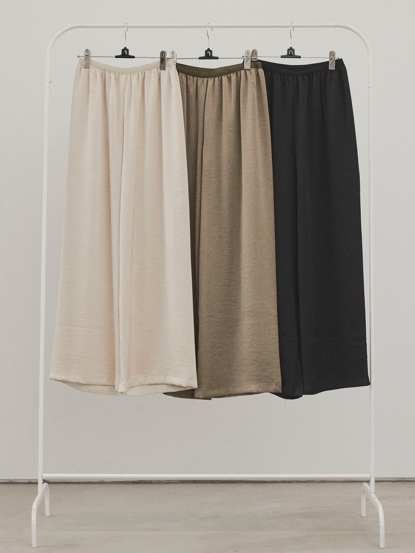 滑らかな光沢が上品な印象を与える、リラクシーかつ洗練されたサテンイージーパンツ。 とろみ感のある軽やかなサテン素材が、動くたびに美しいドレープを生み出します。 ウエストはゴム仕様でストレスフリーな穿き心地ながら、すっきりとしたワイドシルエットがきちんと感もキープ。 ヒールを合わせてきれいめに、フラットシューズでカジュアルダウンも可能な、着回し力抜群の一本です。 トップスインでメリハリのある着こなしはもちろん、長めのトップスとのレイヤードスタイルもおすすめ。 デイリーからオフィスカジュアル、お出かけシーンまで幅広く活躍します。