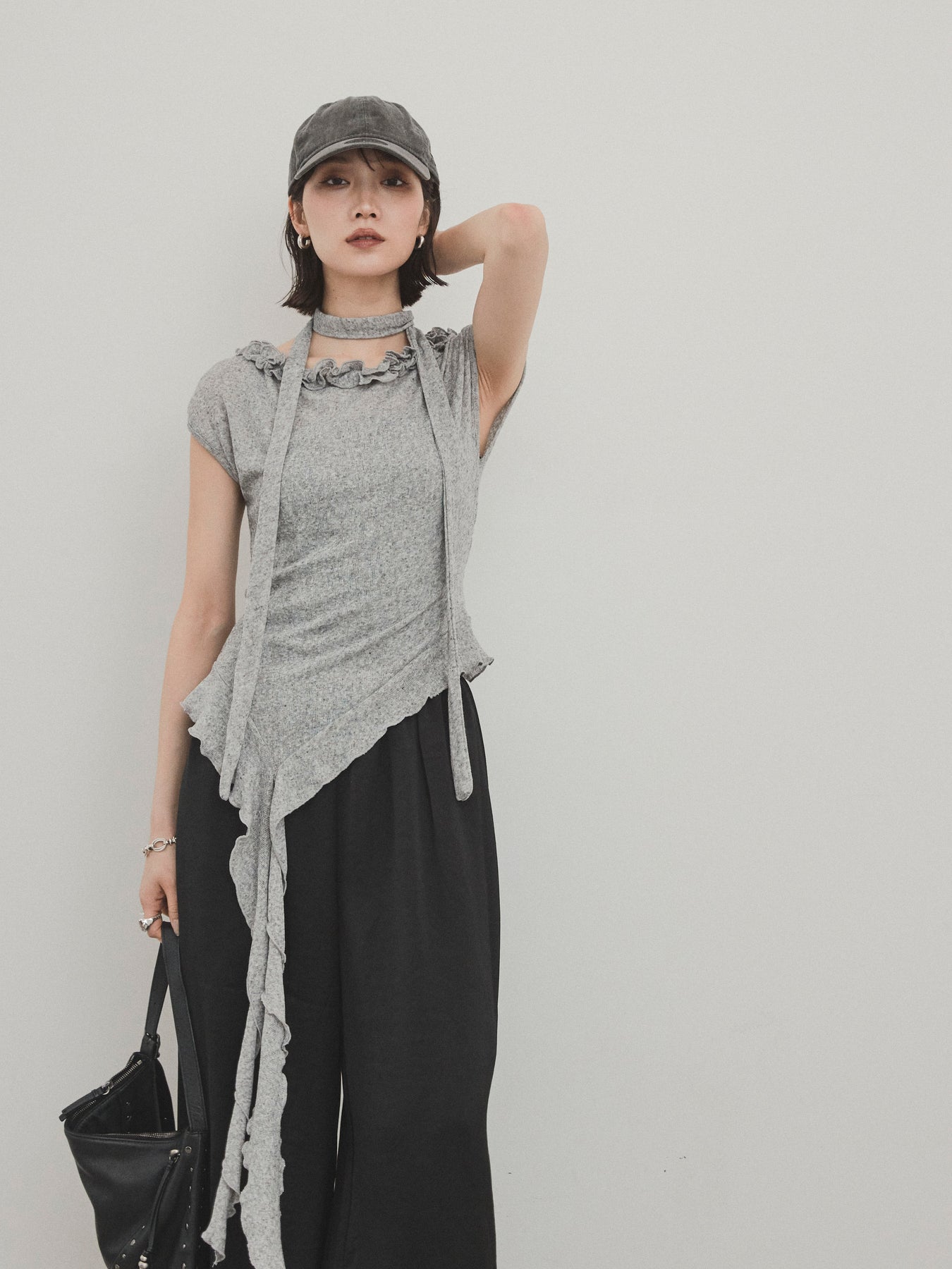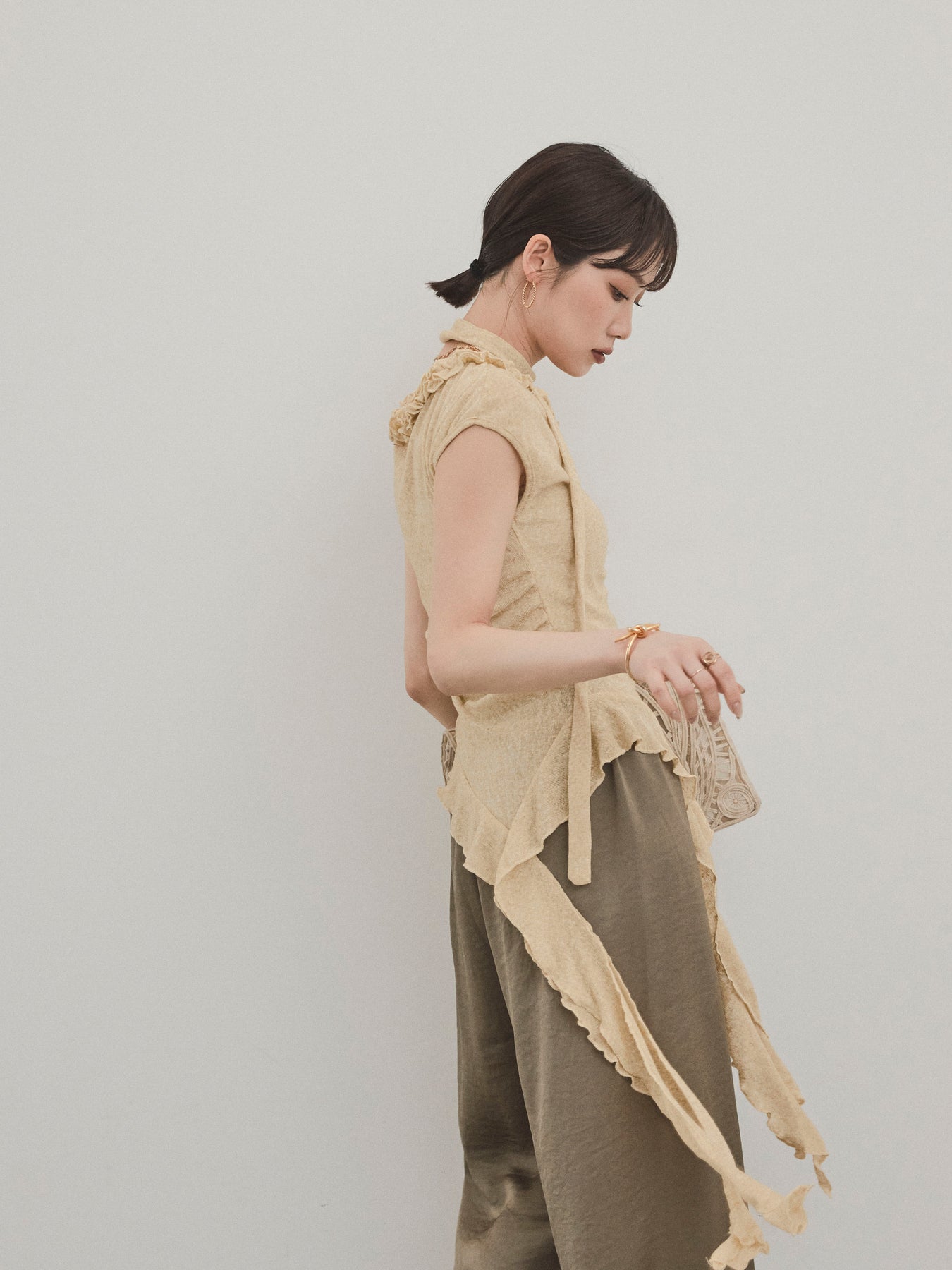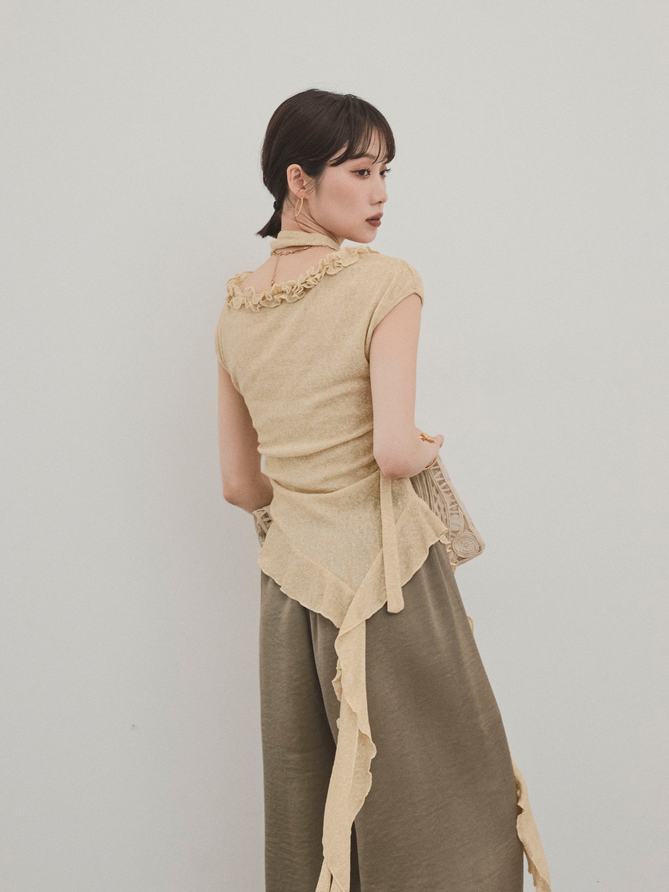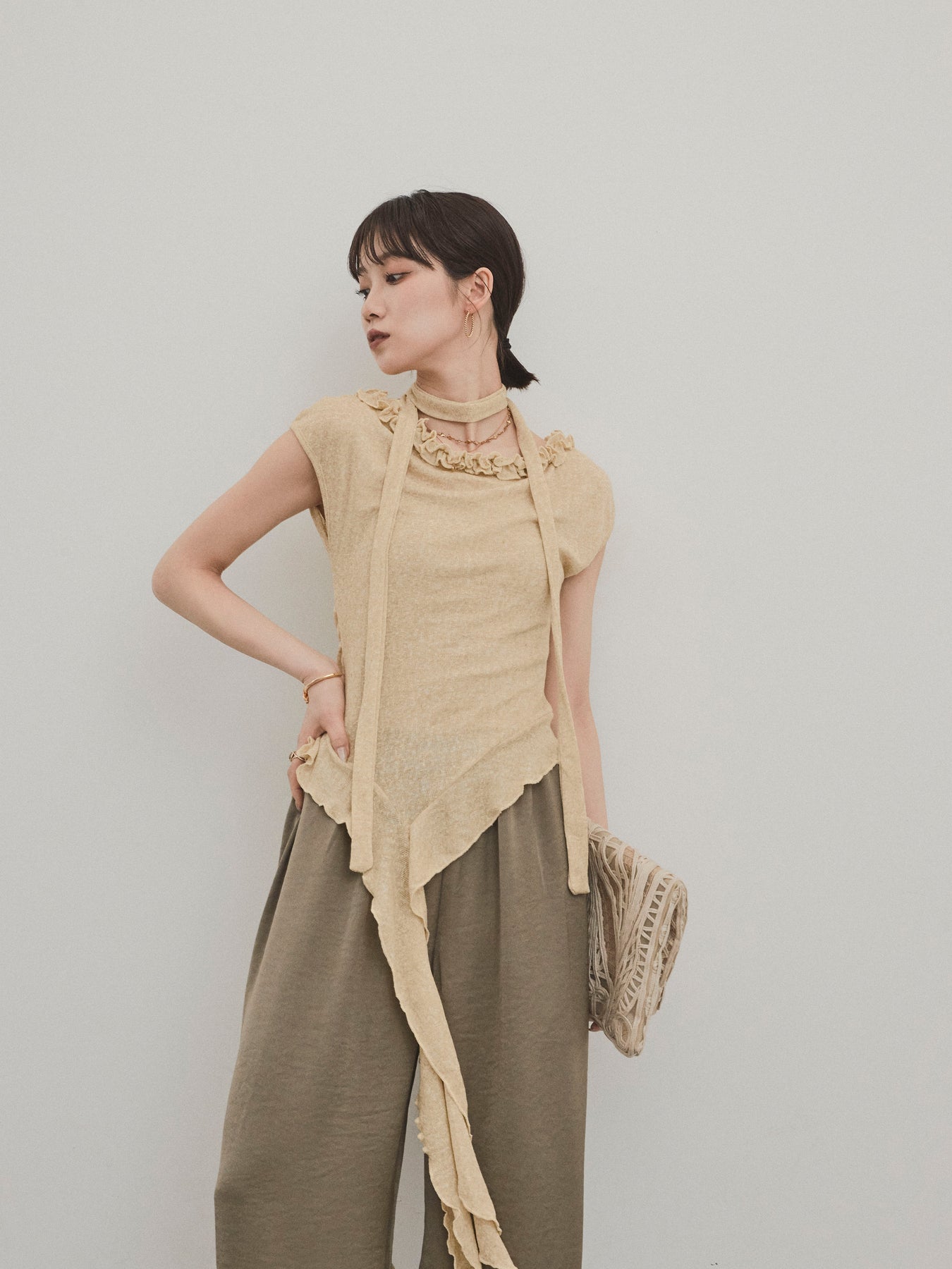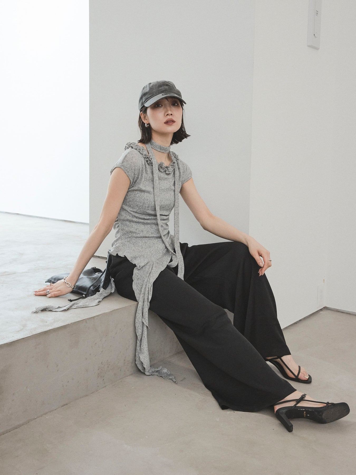 女性らしさを引き立てるラッフルディテールと、程よい透け感が魅力のシアーニットタンクトップ。 襟元から斜めに流れるラッフルラインが、シンプルながらも印象的なアクセントに。 身体に沿う柔らかなフィット感と、涼しげなシアー素材が夏のスタイリングにぴったり。 キャミソールをインナーにしたレイヤードや、ジャケットのインナーとしても大活躍します。 カジュアルなボトムスと合わせて抜け感を演出するのはもちろん、スカートやワイドパンツとの相性も抜群。 一枚で着映える、夏の主役トップスです。