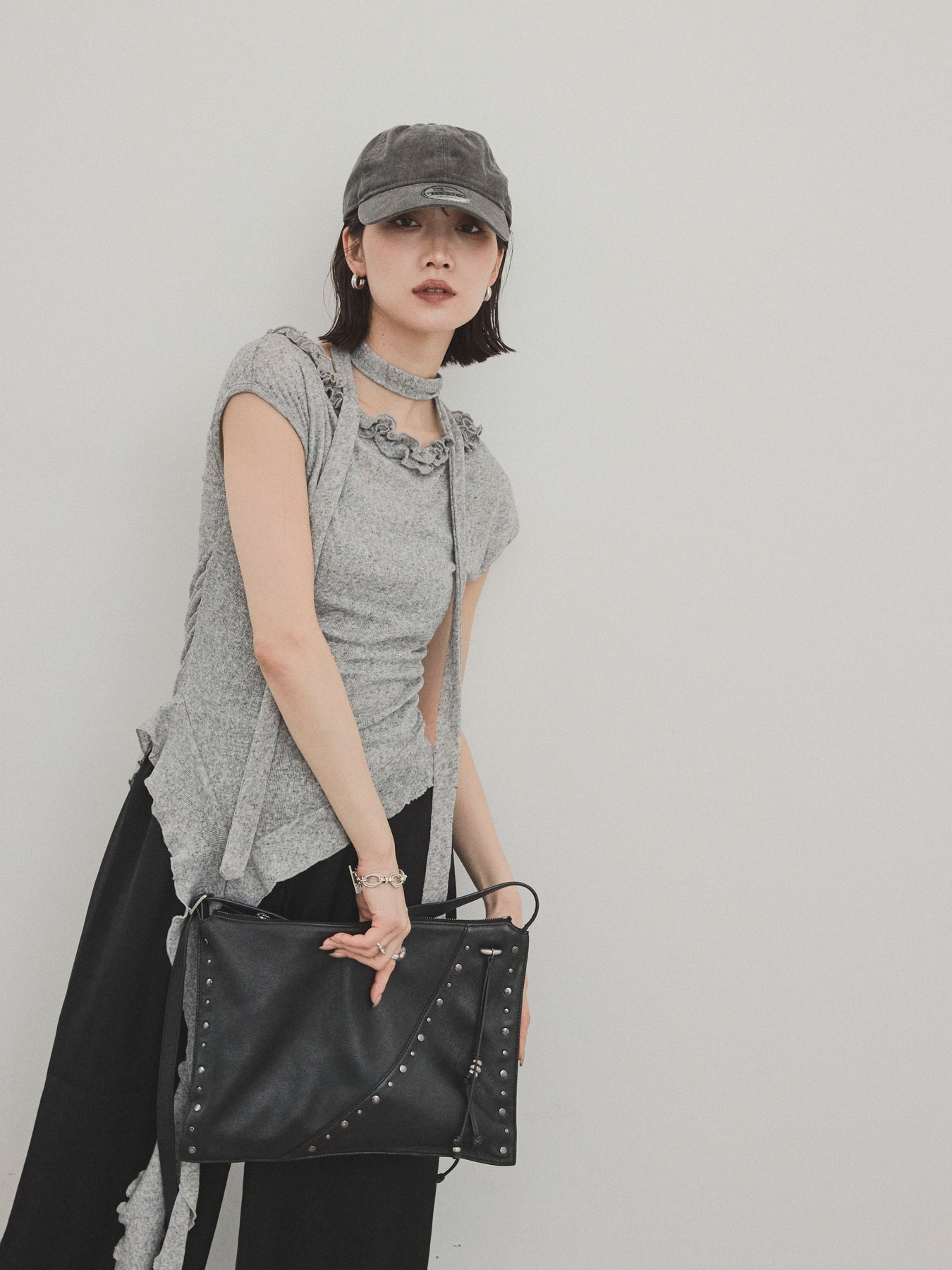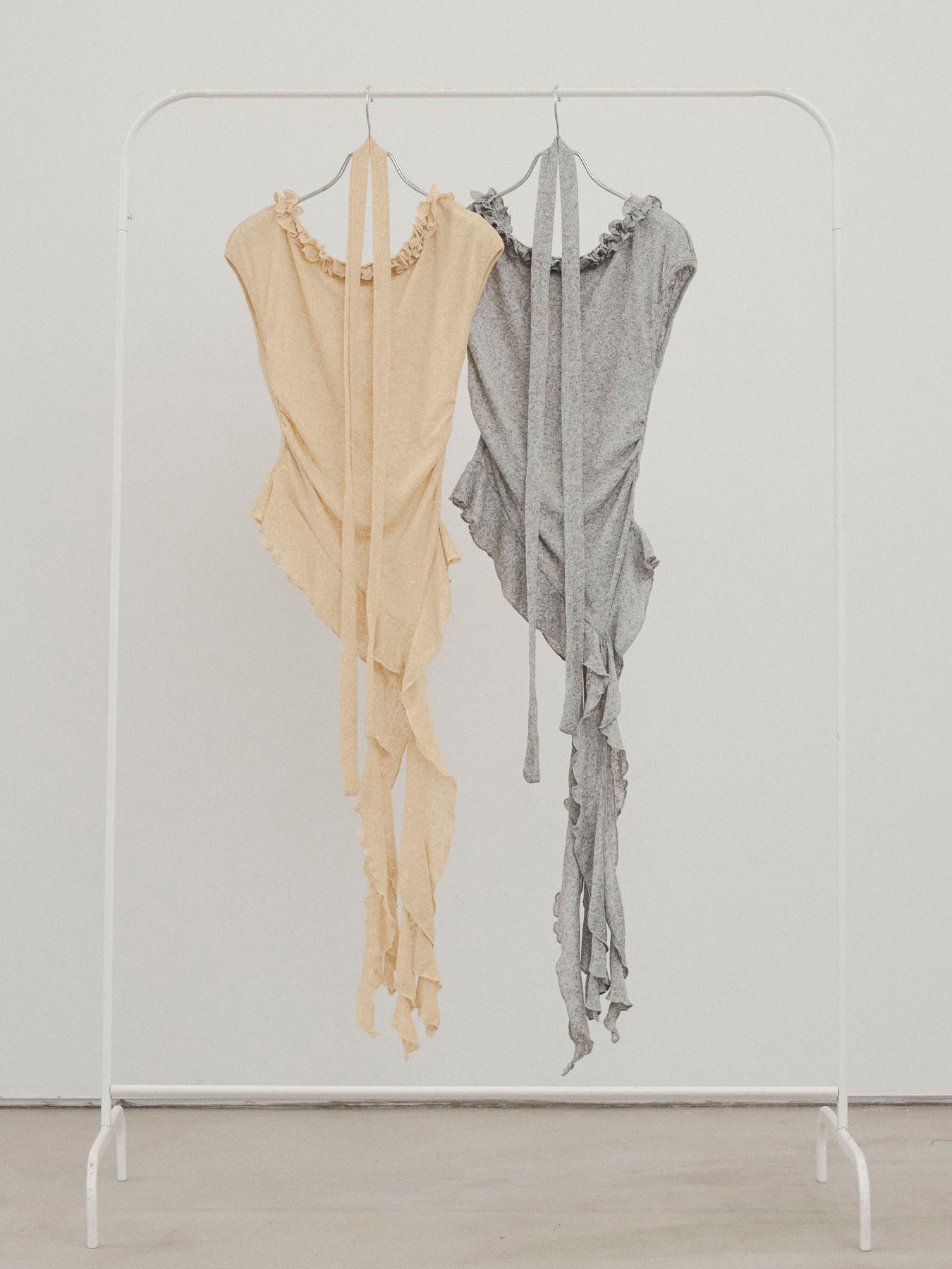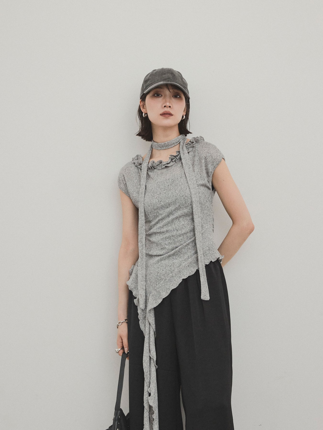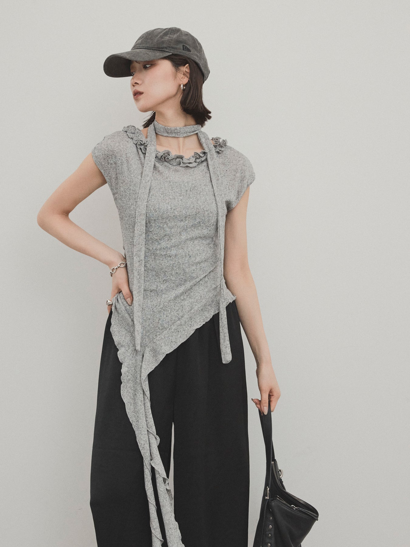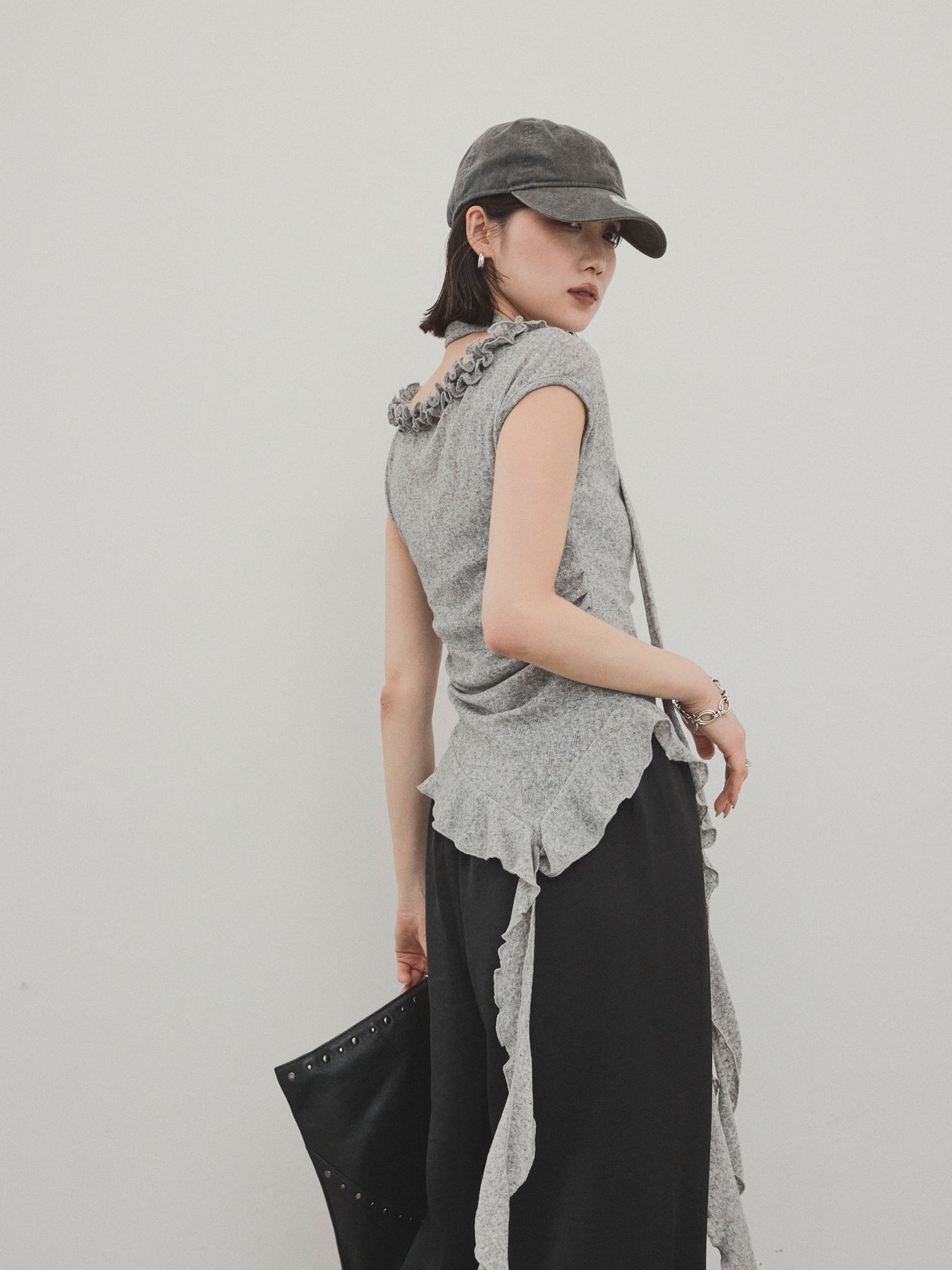 女性らしさを引き立てるラッフルディテールと、程よい透け感が魅力のシアーニットタンクトップ。 襟元から斜めに流れるラッフルラインが、シンプルながらも印象的なアクセントに。 身体に沿う柔らかなフィット感と、涼しげなシアー素材が夏のスタイリングにぴったり。 キャミソールをインナーにしたレイヤードや、ジャケットのインナーとしても大活躍します。 カジュアルなボトムスと合わせて抜け感を演出するのはもちろん、スカートやワイドパンツとの相性も抜群。 一枚で着映える、夏の主役トップスです。