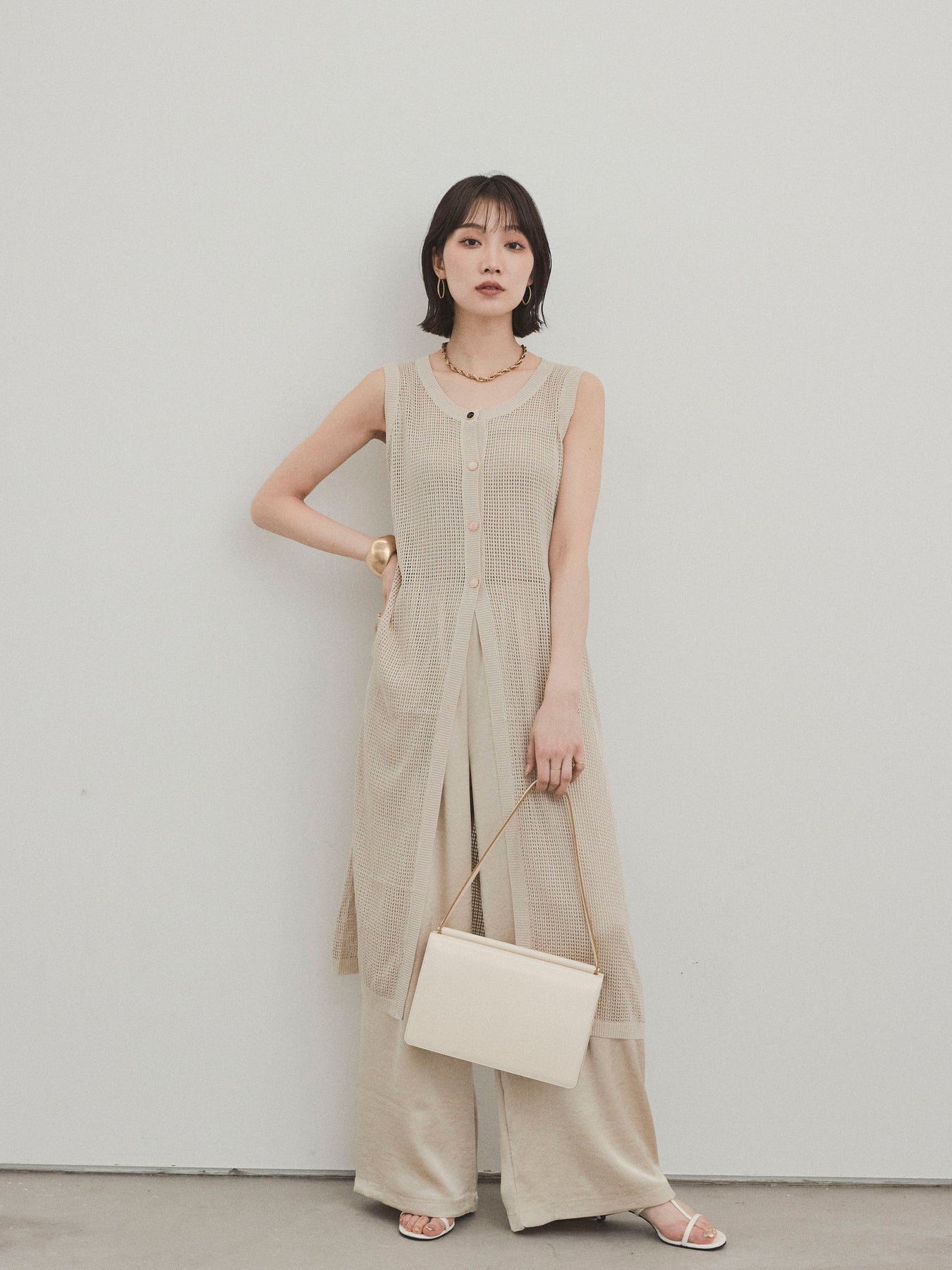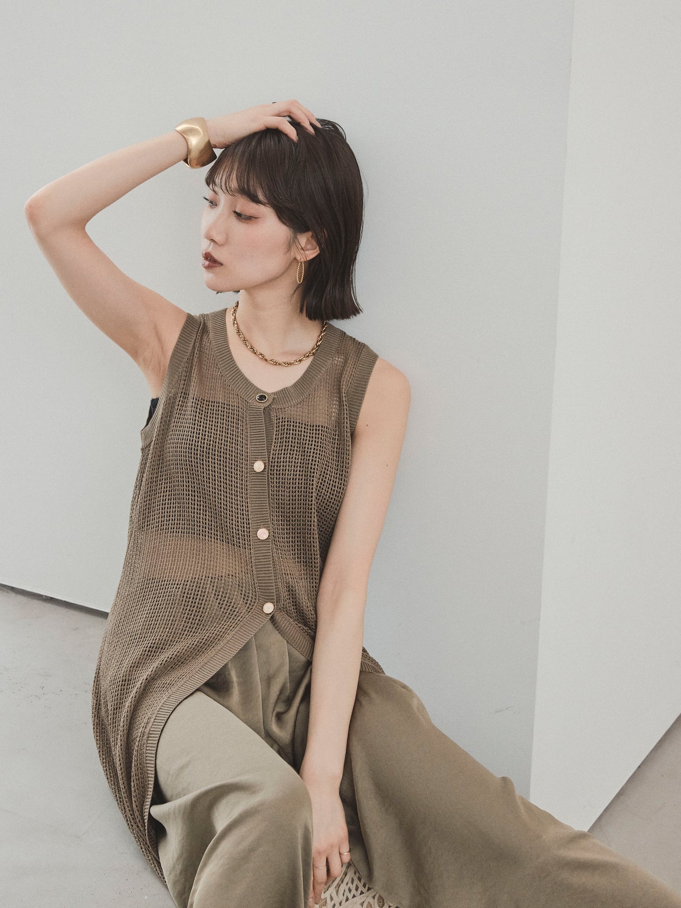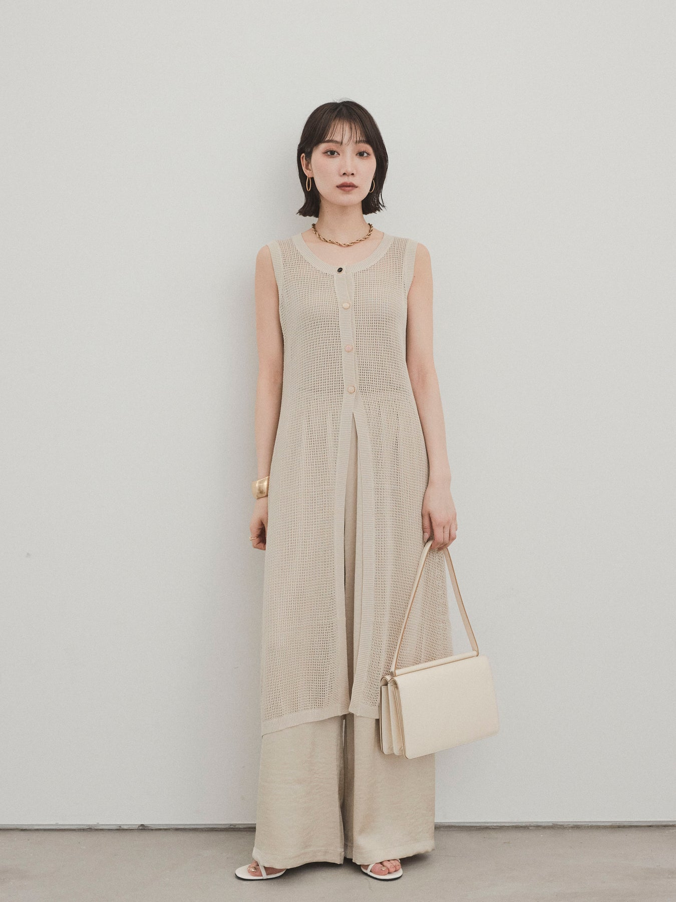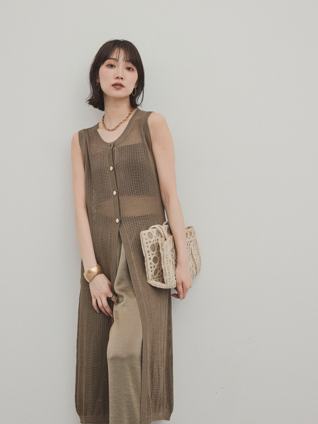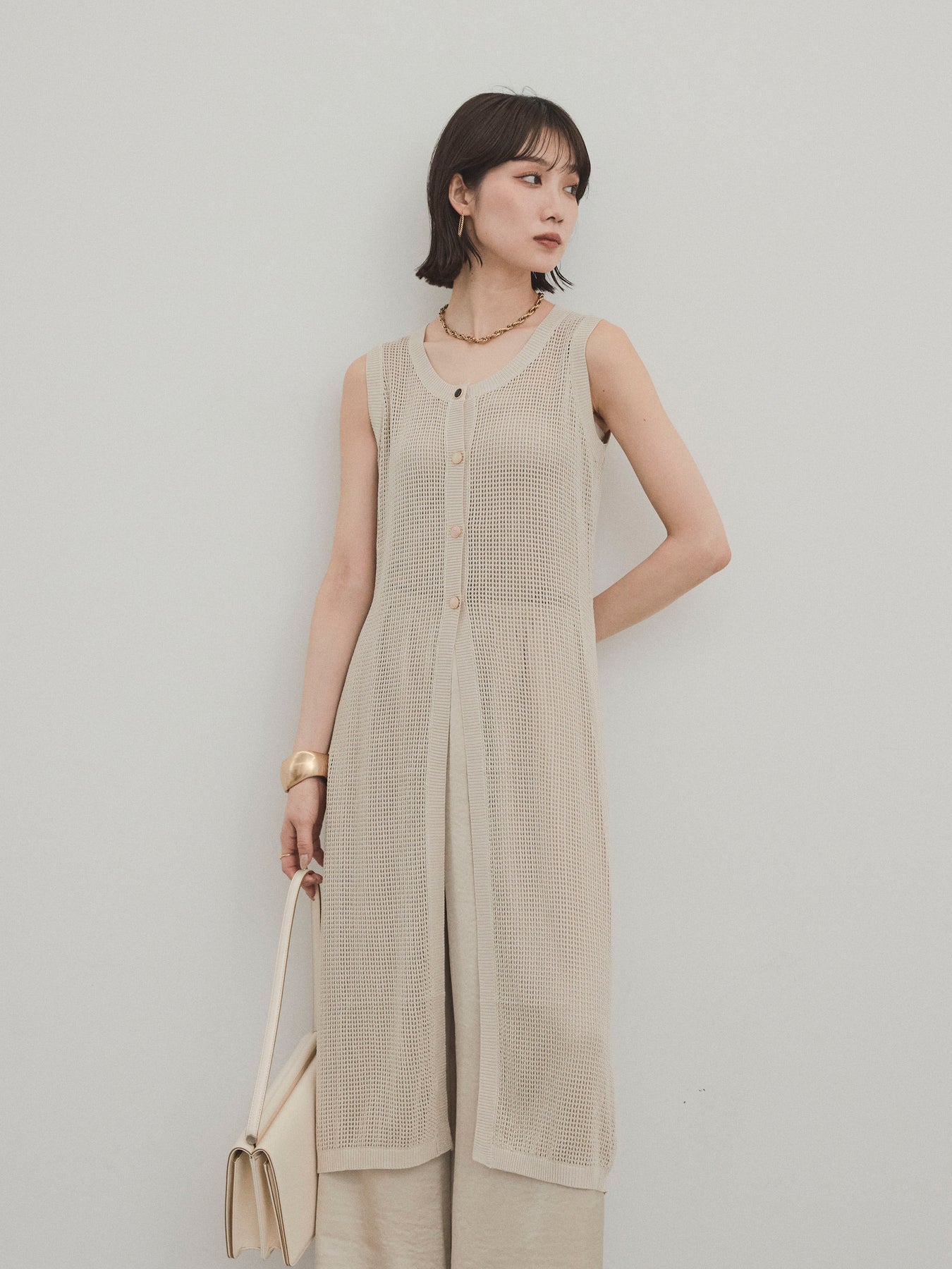 程よい透け感が夏らしい抜け感を演出する、ロング丈のニットジレ。 異なるデザインのアソートボタンがアクセントとなり、シンプルな中に遊び心をプラスしています。 通気性の良いメッシュ編みのニットは、軽やかで涼しく、レイヤードスタイルに最適。 サイドスリット入りのロングシルエットが、縦ラインを強調してスタイルアップ効果も。 Tシャツやタンクトップの上からさっと羽織るだけで、こなれ感のある旬のスタイルが完成。 パンツにもスカートにも合わせやすく、デイリーからリゾートまで幅広く活躍するアイテムです。