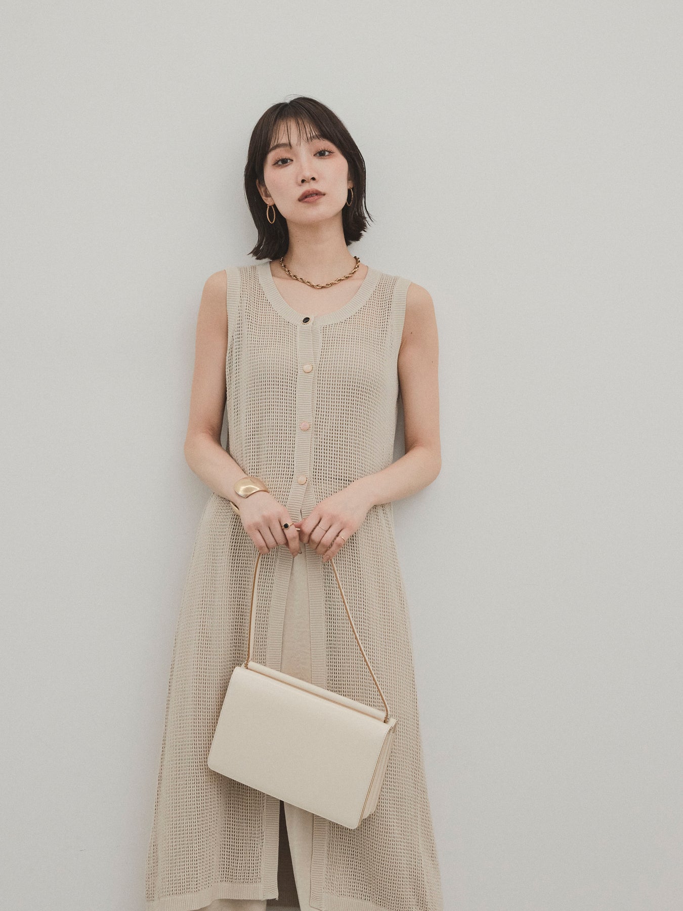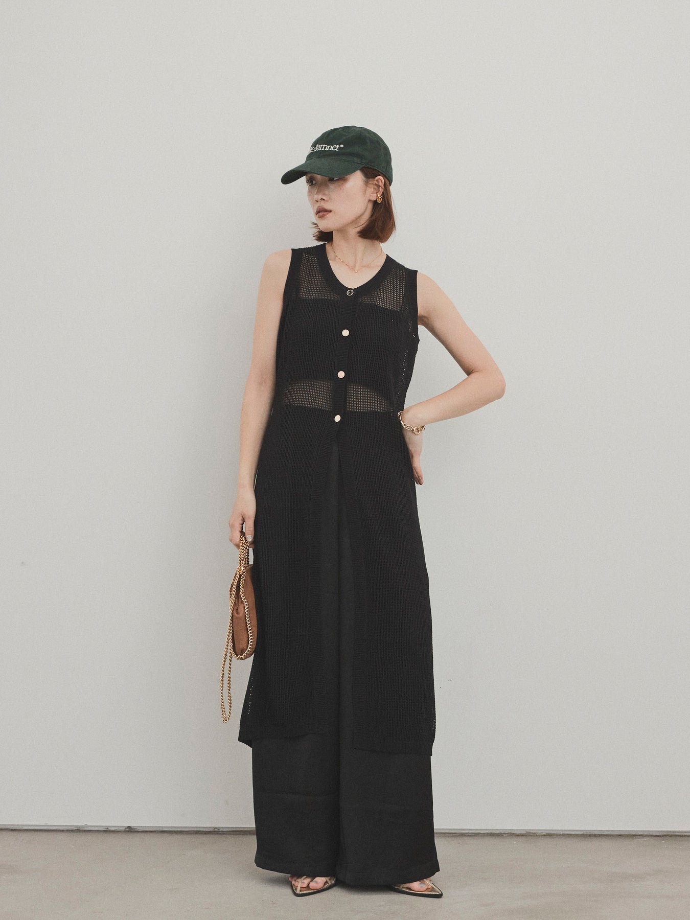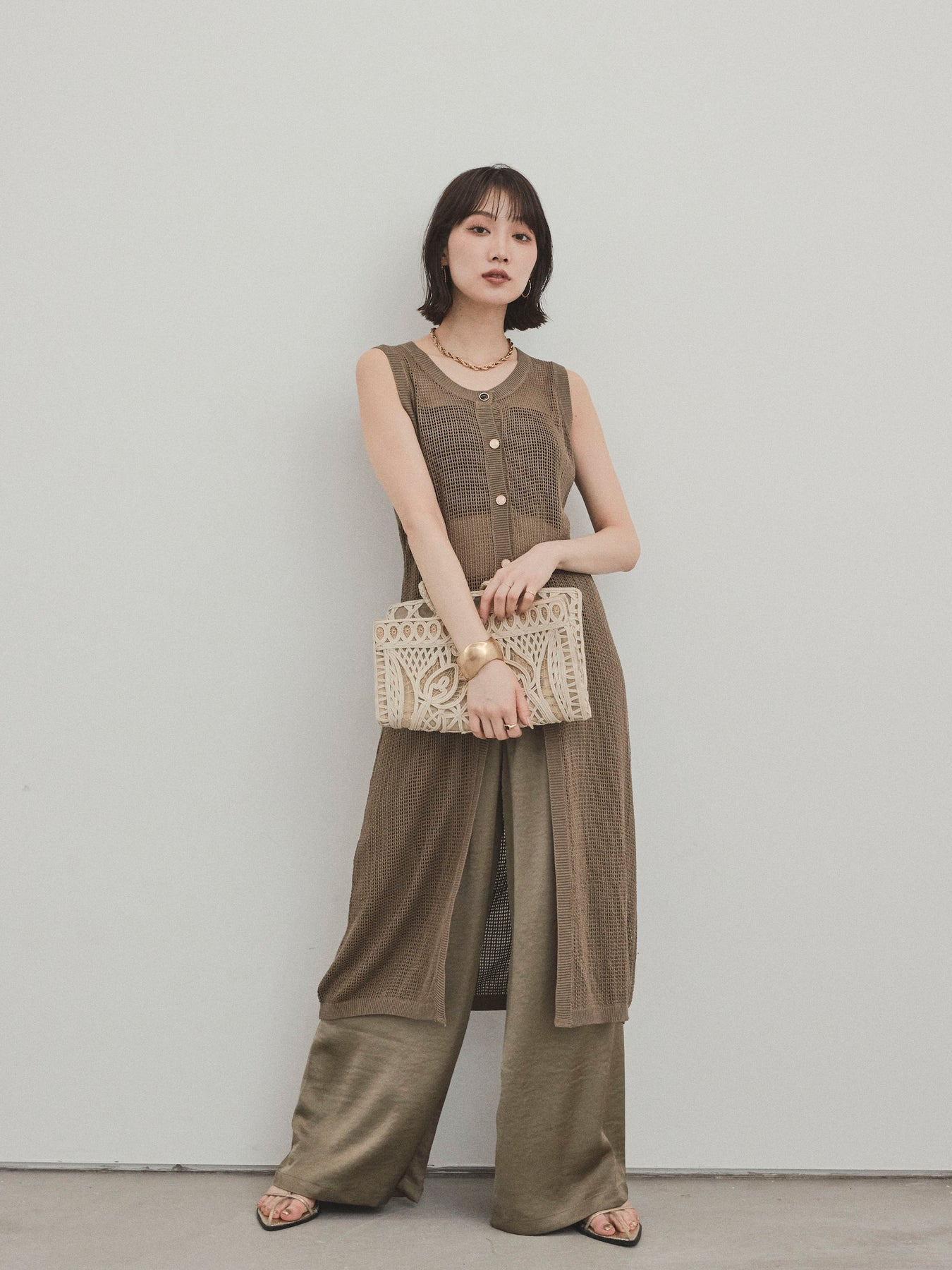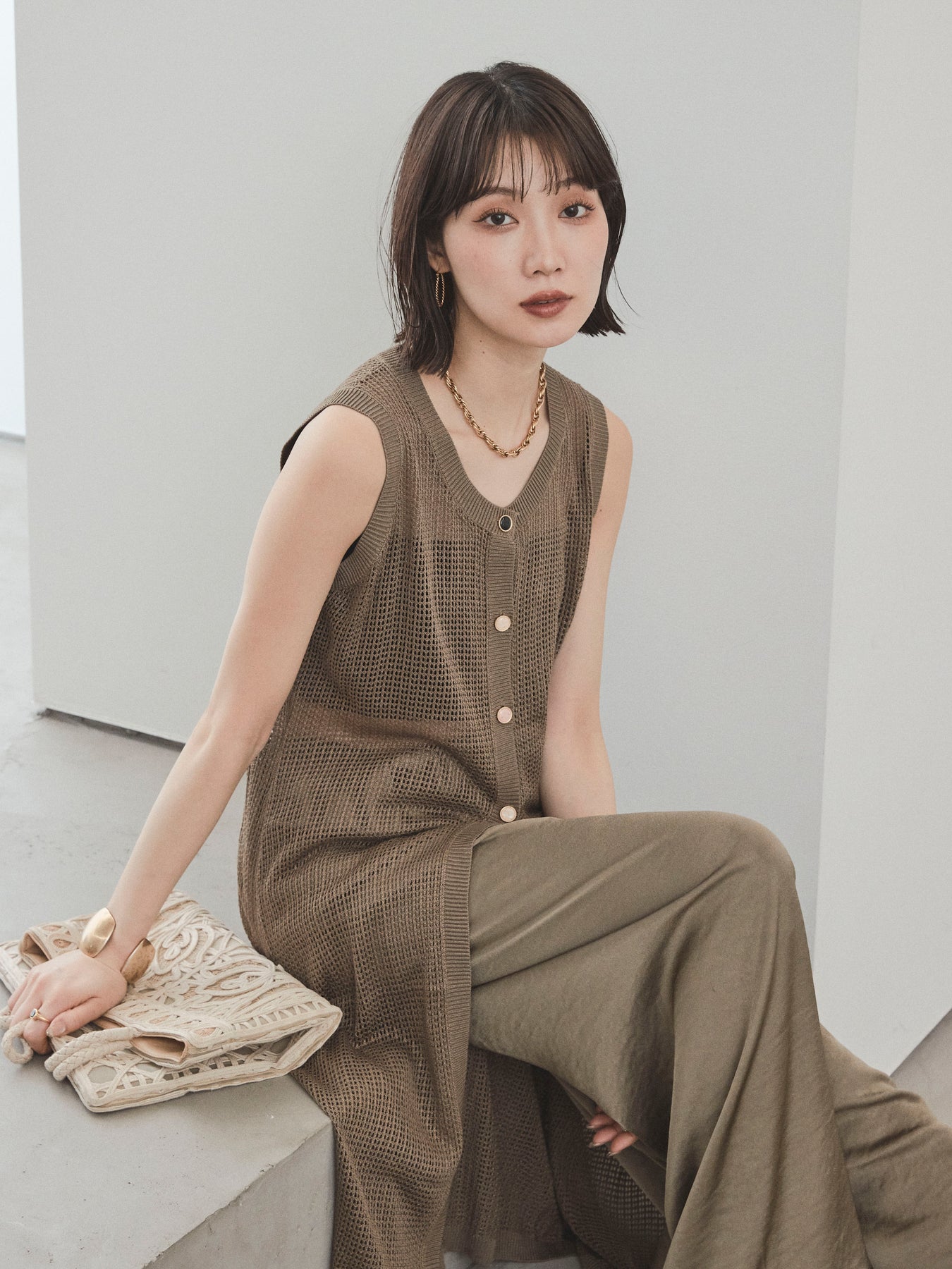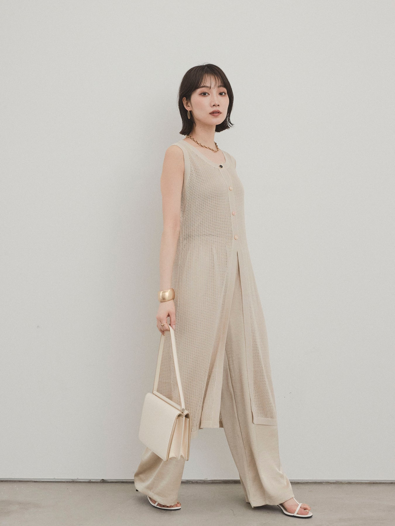程よい透け感が夏らしい抜け感を演出する、ロング丈のニットジレ。 異なるデザインのアソートボタンがアクセントとなり、シンプルな中に遊び心をプラスしています。 通気性の良いメッシュ編みのニットは、軽やかで涼しく、レイヤードスタイルに最適。 サイドスリット入りのロングシルエットが、縦ラインを強調してスタイルアップ効果も。 Tシャツやタンクトップの上からさっと羽織るだけで、こなれ感のある旬のスタイルが完成。 パンツにもスカートにも合わせやすく、デイリーからリゾートまで幅広く活躍するアイテムです。