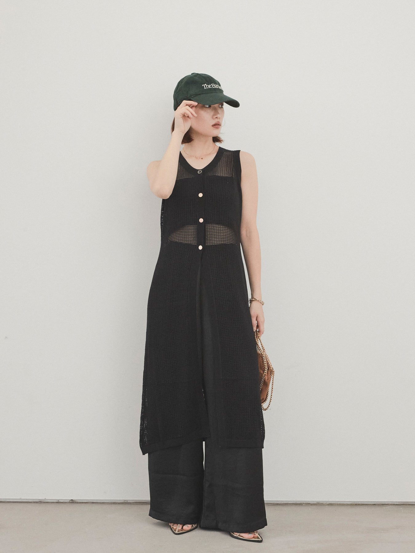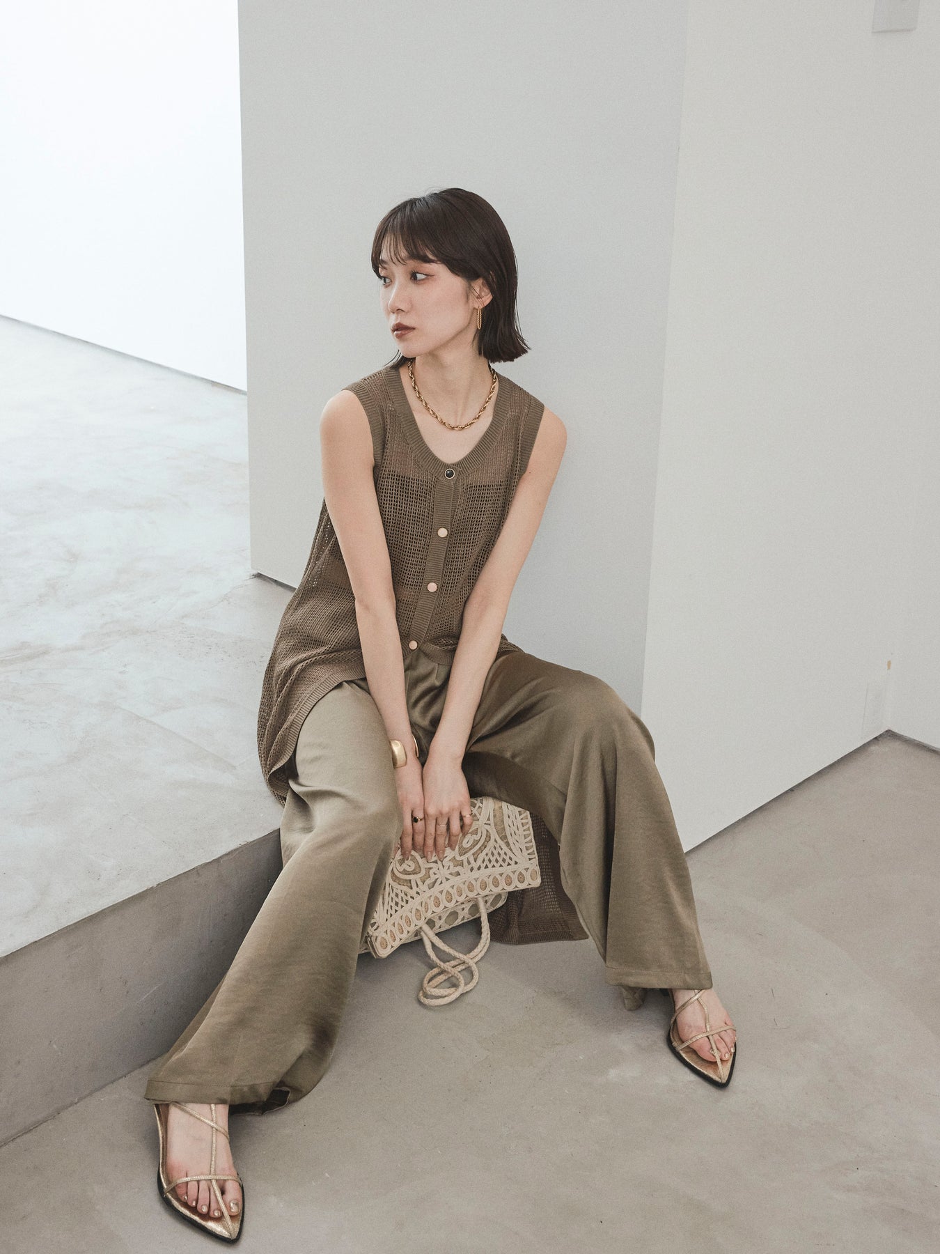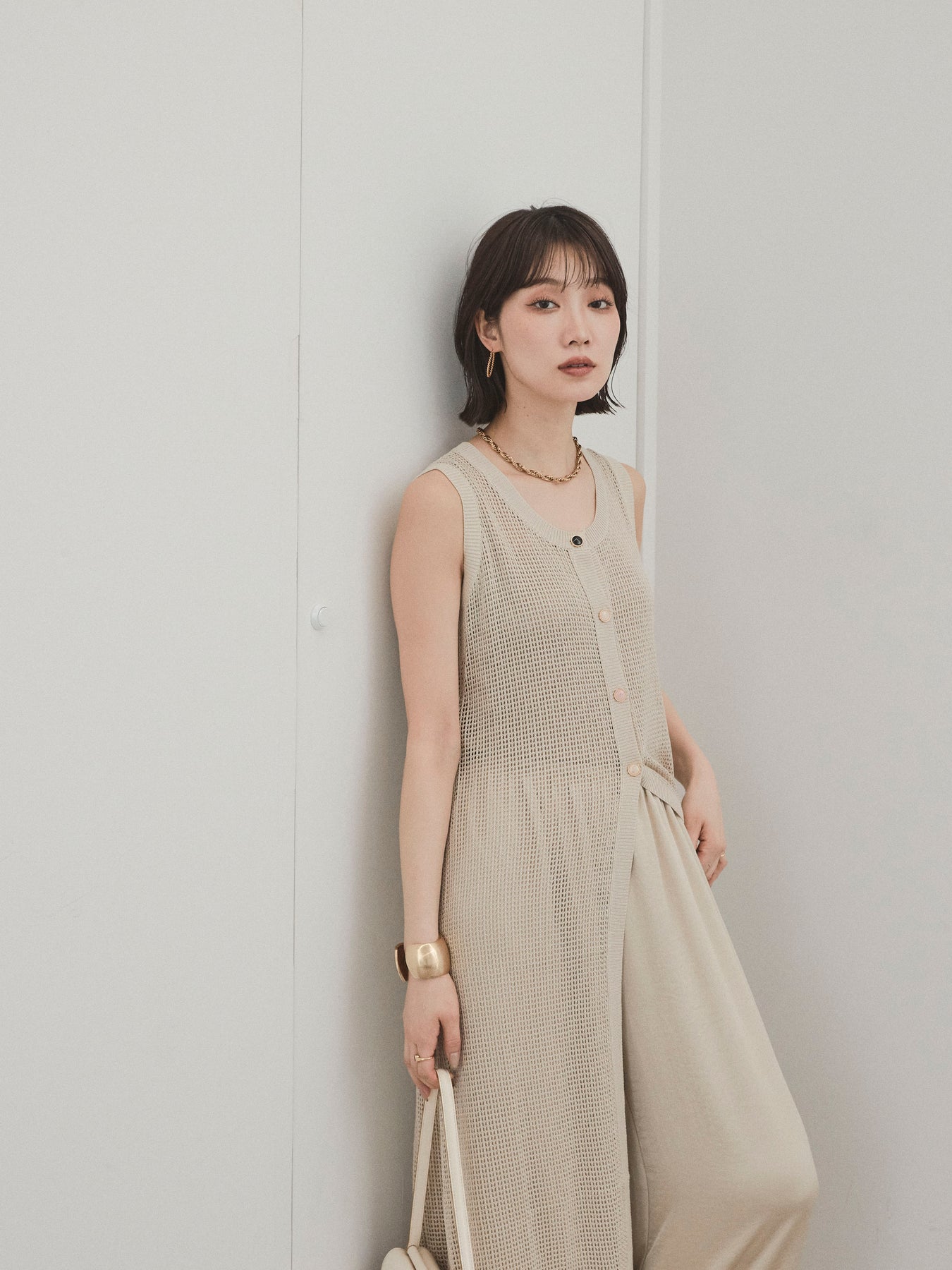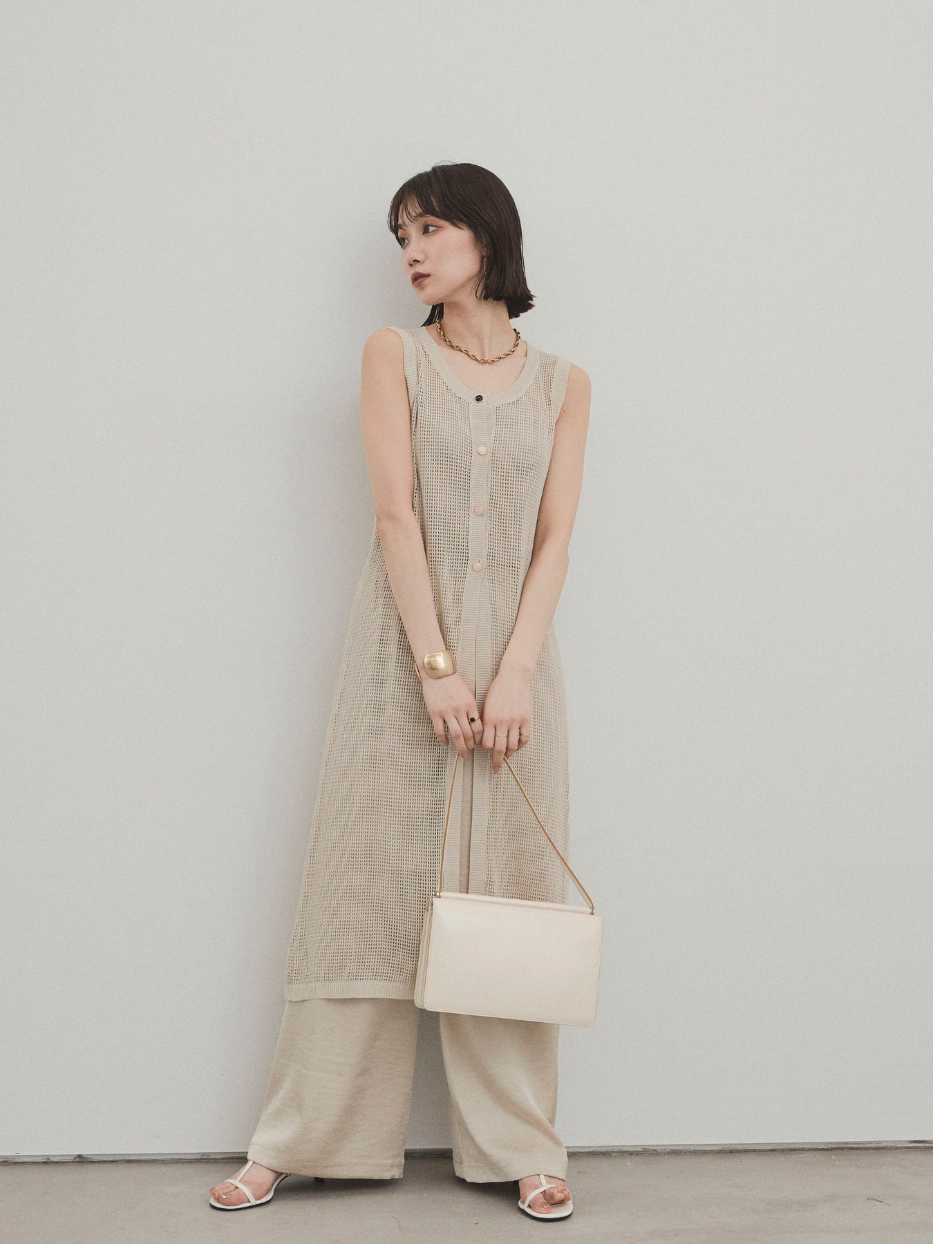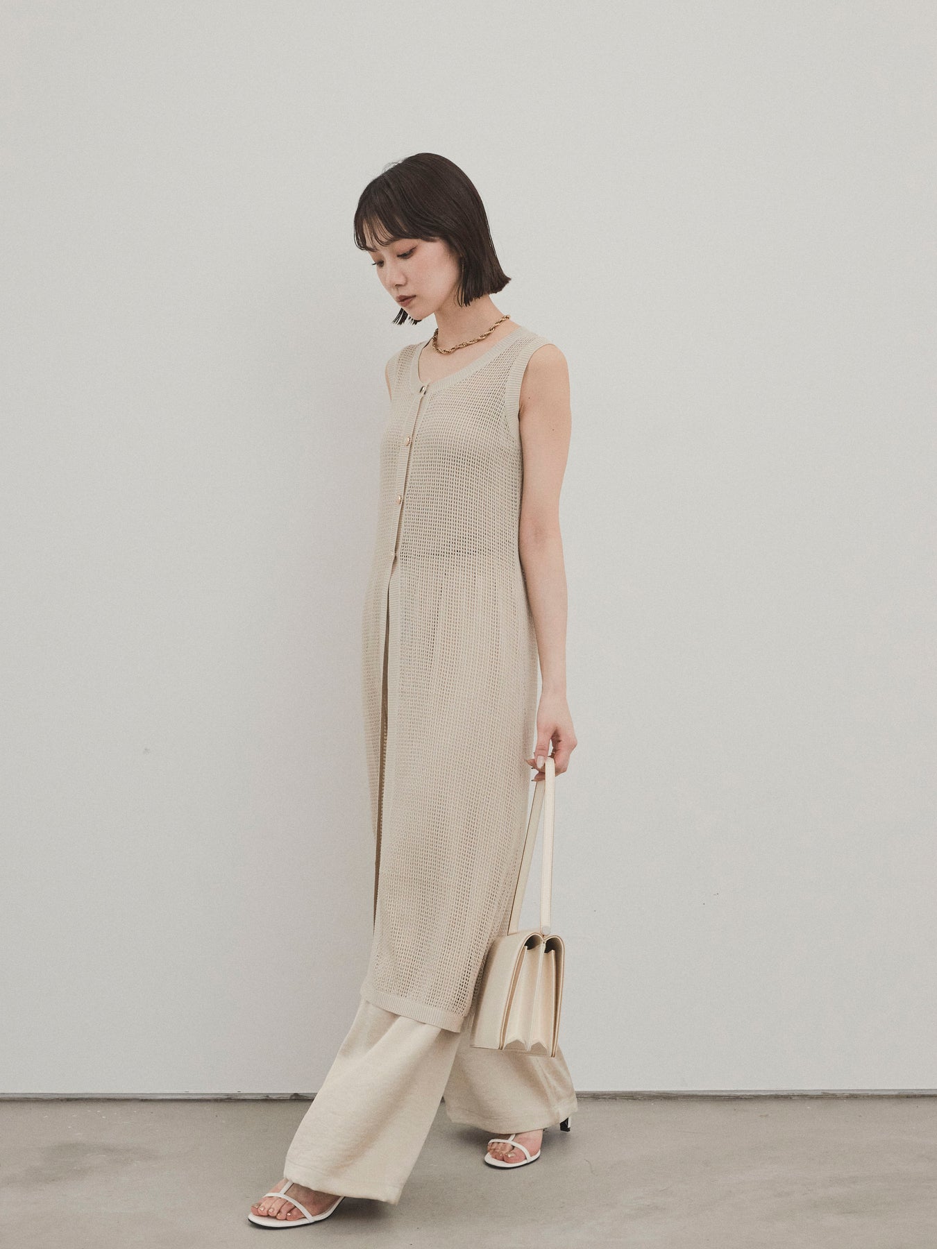 程よい透け感が夏らしい抜け感を演出する、ロング丈のニットジレ。 異なるデザインのアソートボタンがアクセントとなり、シンプルな中に遊び心をプラスしています。 通気性の良いメッシュ編みのニットは、軽やかで涼しく、レイヤードスタイルに最適。 サイドスリット入りのロングシルエットが、縦ラインを強調してスタイルアップ効果も。 Tシャツやタンクトップの上からさっと羽織るだけで、こなれ感のある旬のスタイルが完成。 パンツにもスカートにも合わせやすく、デイリーからリゾートまで幅広く活躍するアイテムです。