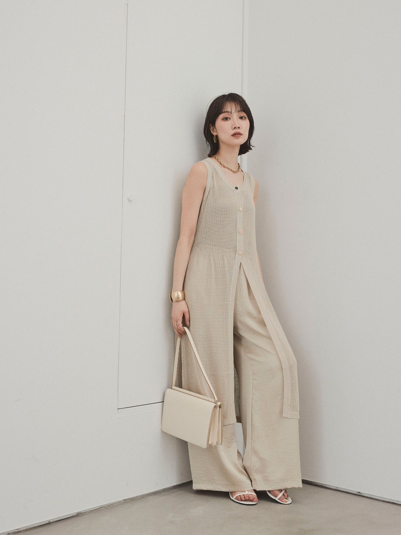 [SET]アソートボタンニットロングジレ+サテンイージーパンツ(2set)