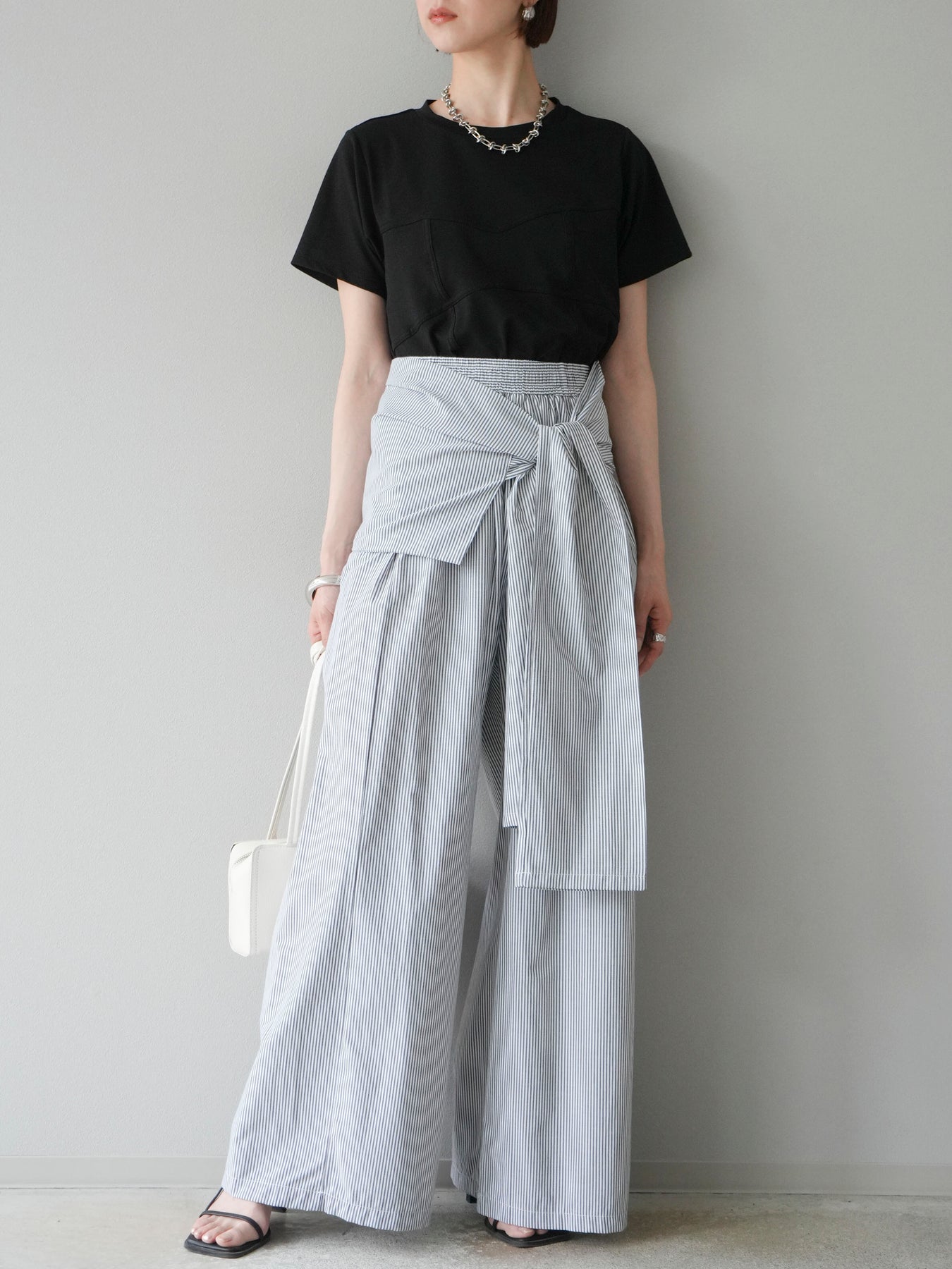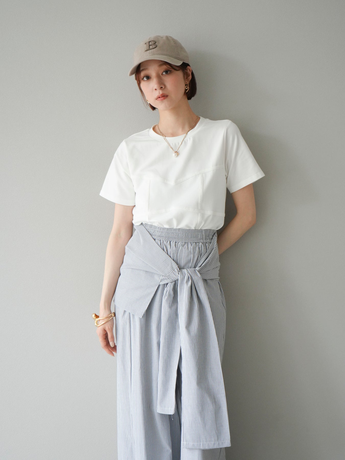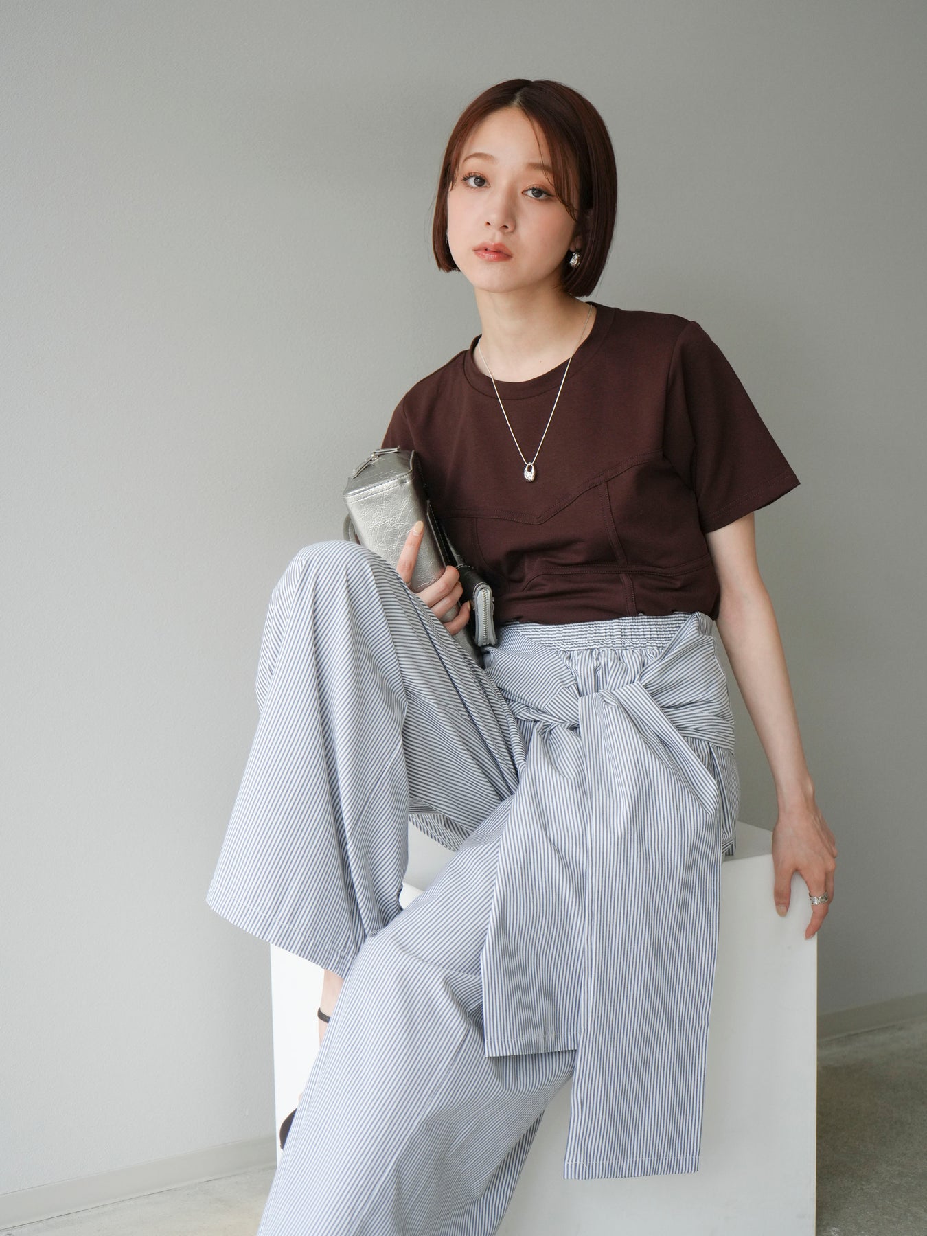 [SET]ビスチェデザインTシャツ+ウエスト巻きストライプイージーパンツ(2set)