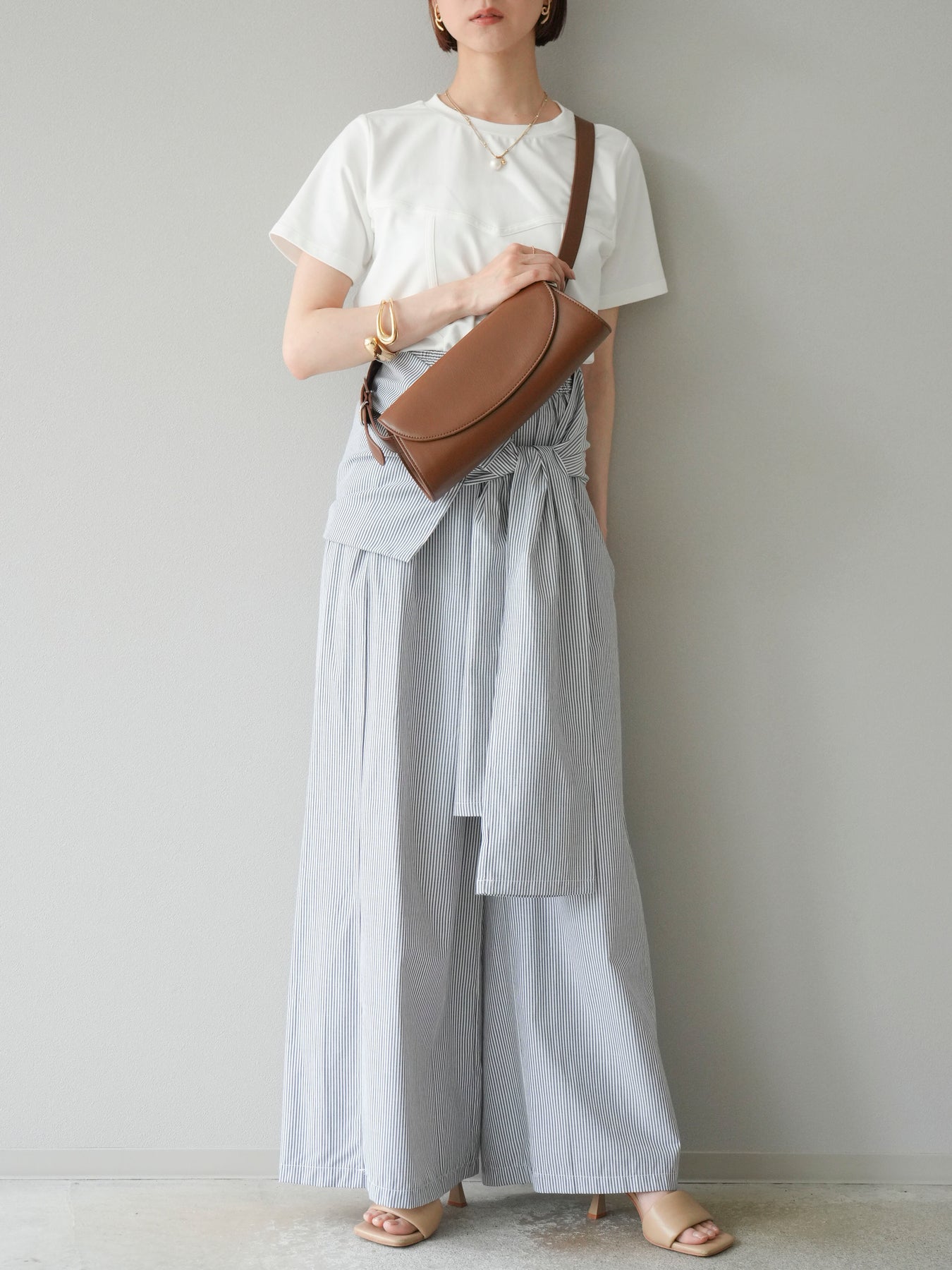 ウエスト部分にシャツを巻いたような立体的なデザインが特徴の、トレンド感溢れるイージーパンツ。さらりとしたストライプ生地で清涼感があり、夏の着こなしにぴったりの1本です。ウエストは総ゴム仕様でリラックス感のある穿き心地を実現しつつ、脚長効果のあるワイドシルエットでスタイルアップも叶います。シンプルなトップスと合わせても、ウエストデザインがコーデの主役になるアイテムです。 ※ボトムス、キャミソール(インナー)以外の商品は一律でインナーは付属していません。