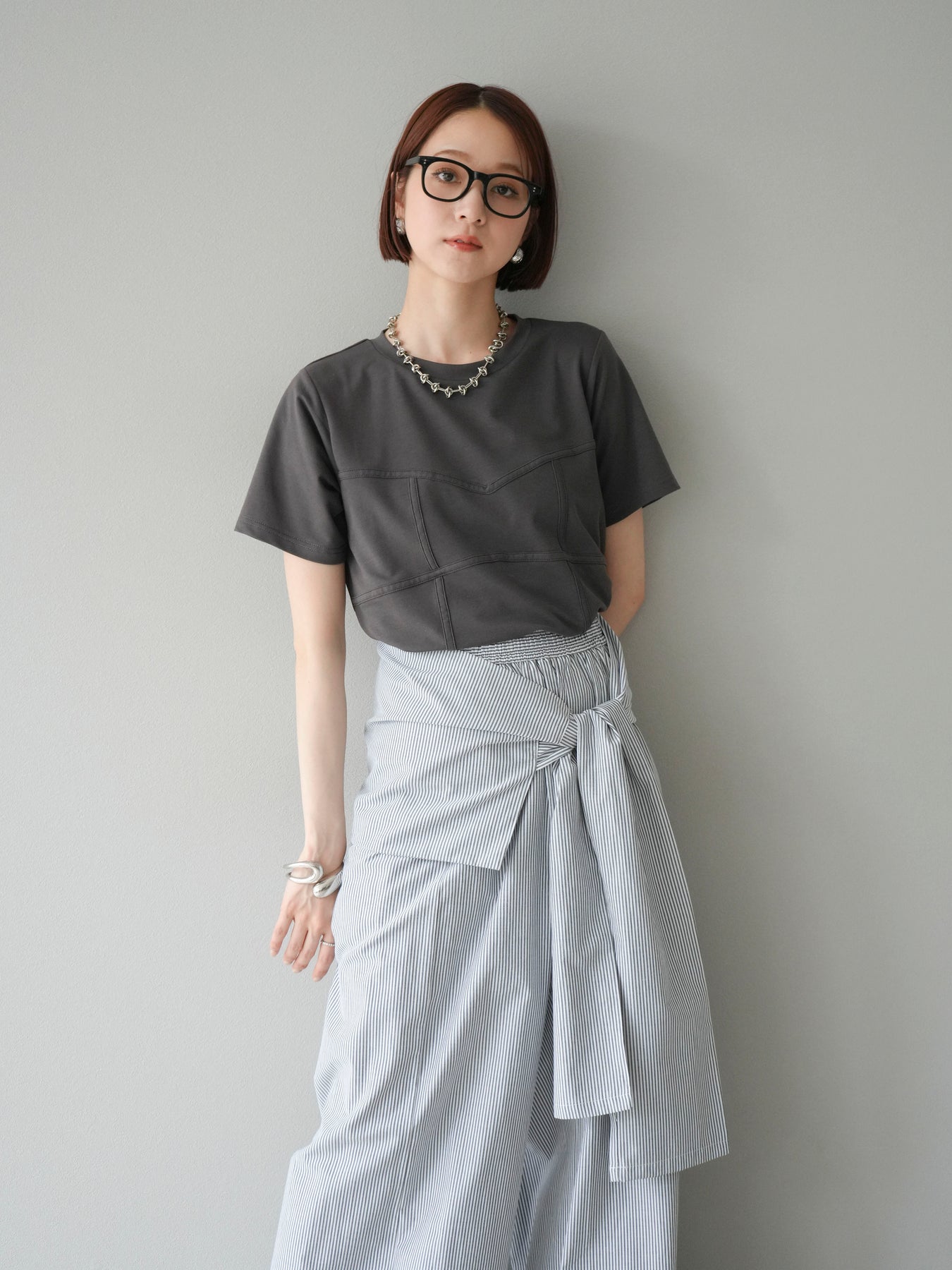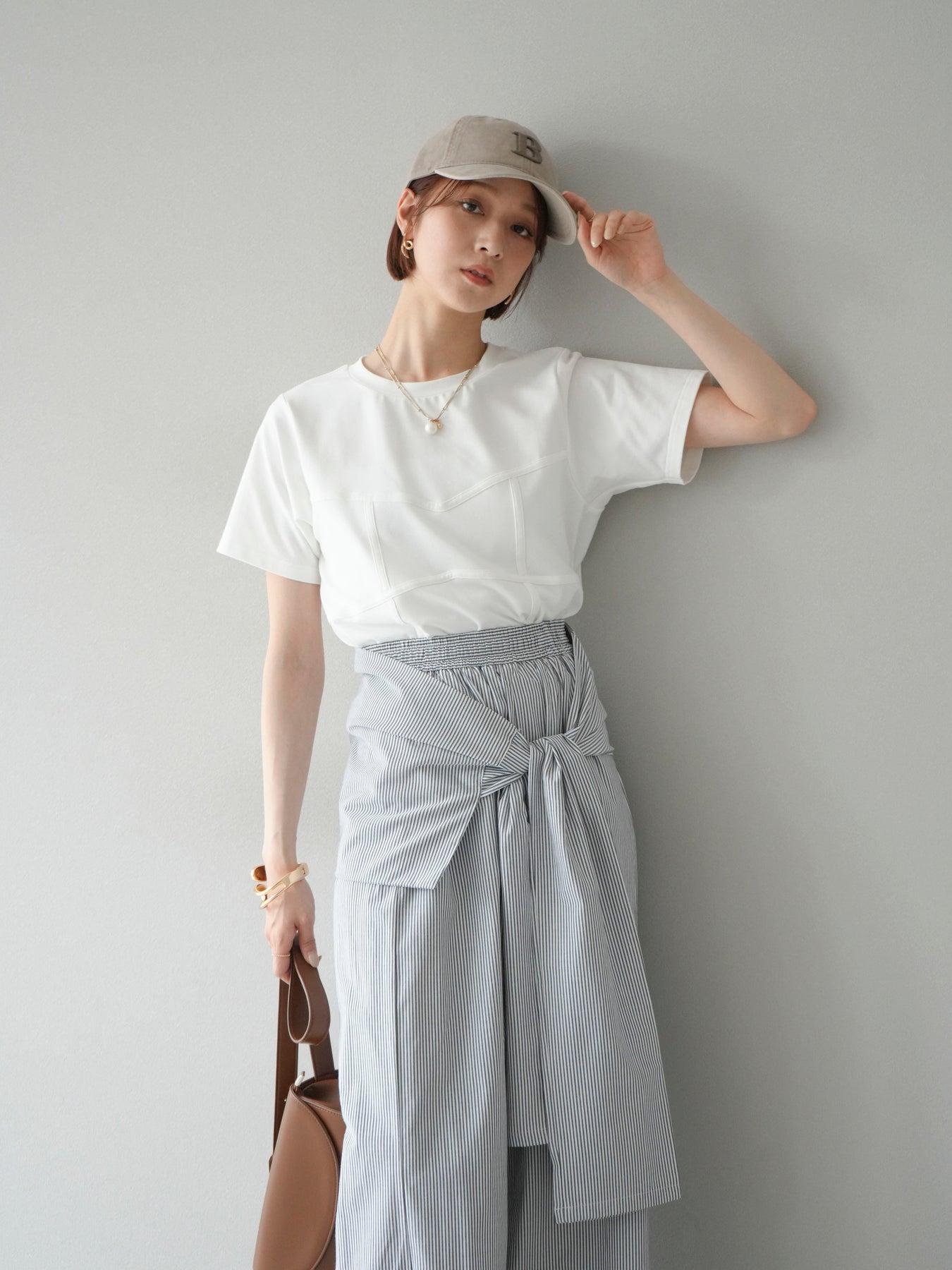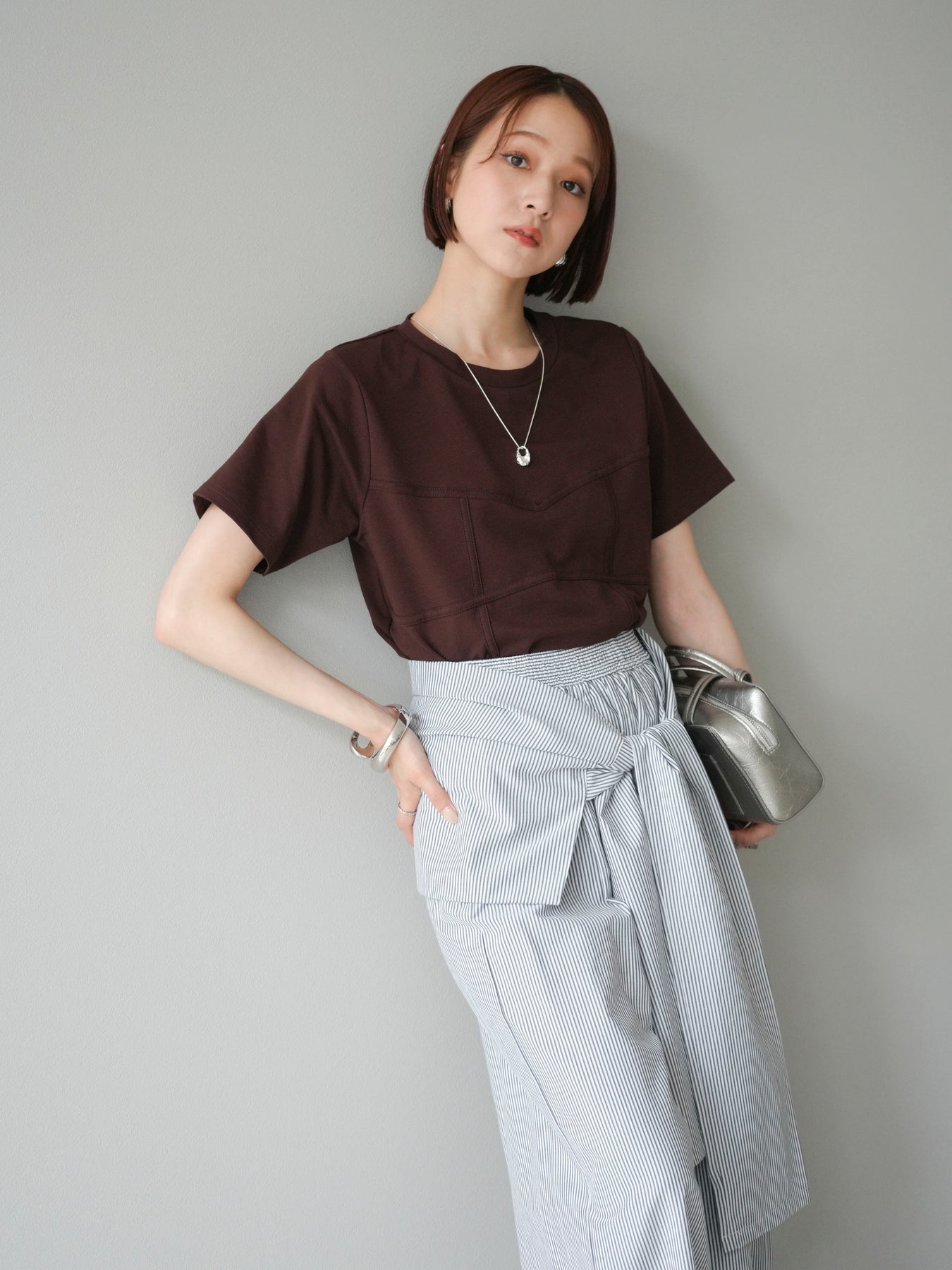 ビスチェを重ねたような切替デザインが目を引く、ビスチェデザインTシャツ。程よくフィット感のあるシルエットとカットソー素材で、カジュアルながらも女性らしい印象に仕上がっています。胸元のカーブ切替や縦のパネルラインが立体感を生み、シンプルながらもスタイルアップ効果も◎。一枚でさらっと着てもサマになり、ジャケットやシャツのインナーとしてもアクセントになる優秀トップス。デニムやスカートなど、幅広いボトムスと相性抜群な万能アイテムです。 ※ボトムス、キャミソール(インナー)以外の商品は一律でインナーは付属していません。
