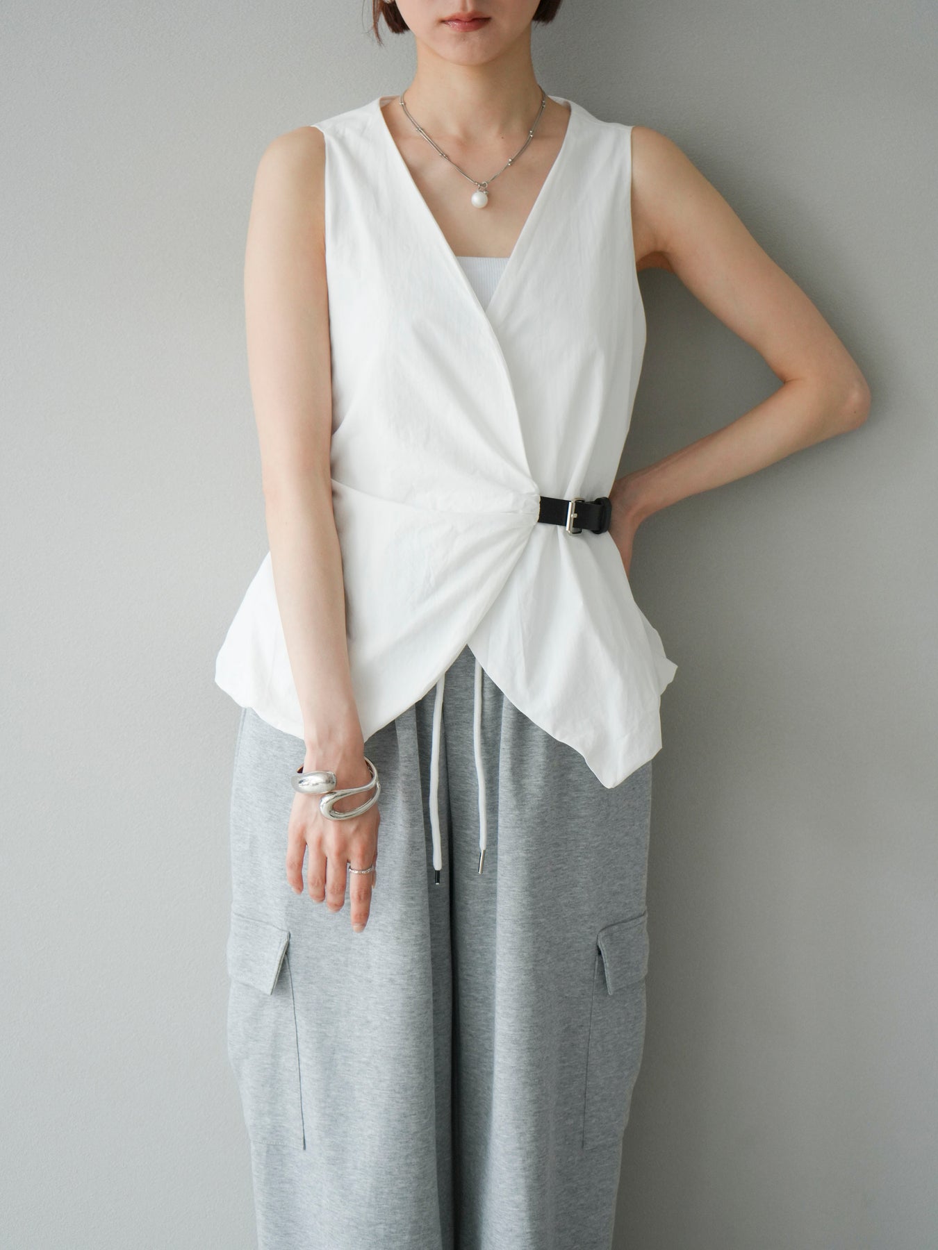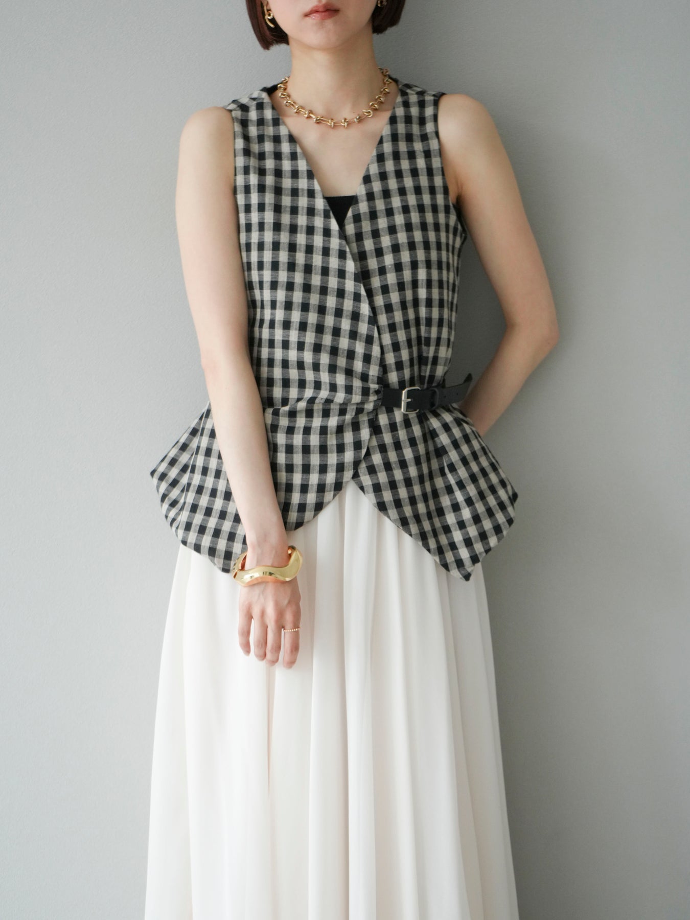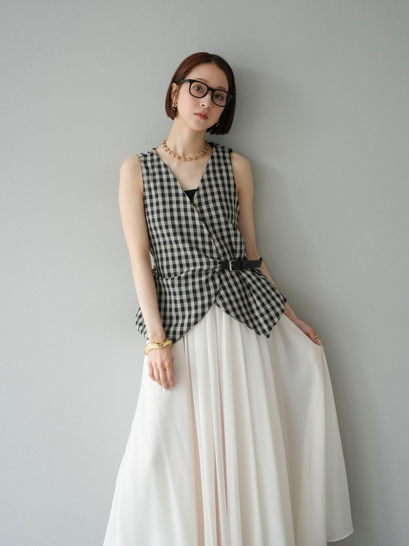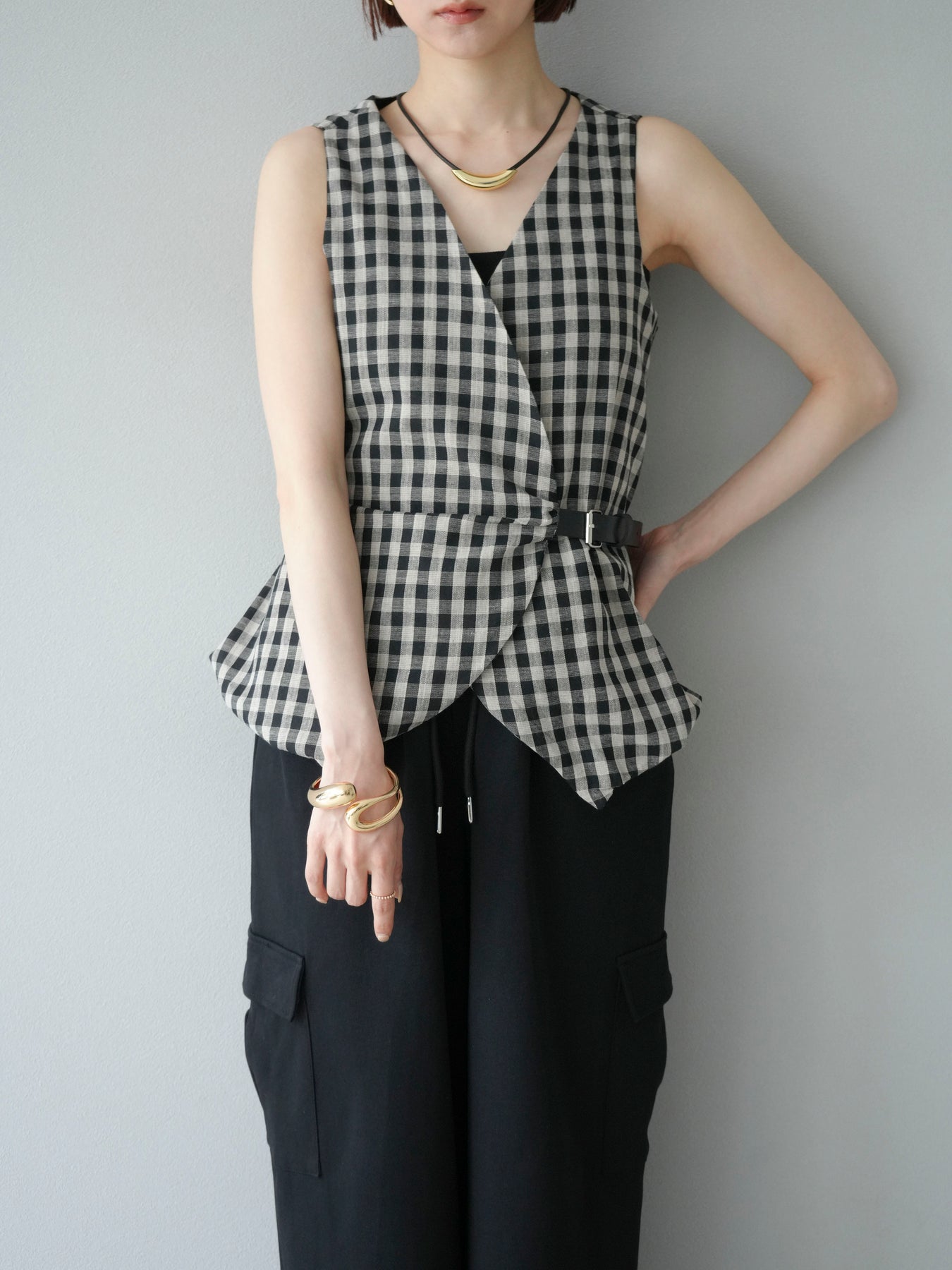 立体的なバルーンシルエットが印象的なベルトデザインのノースリーブブラウス。ギンガムチェック柄に、ラップ風のフロントデザインを施し、ウエスト部分のベルトディテールで美しいシルエットを演出。裾に向かってふんわりと広がるバルーンシルエットは、ウエストラインをすっきりと見せてくれます。1枚でも主役になるデザイン性の高さが魅力で、シンプルなパンツやスカートと合わせるだけで華やかな印象に。 ※ボトムス、キャミソール(インナー)以外の商品は一律でインナーは付属していません。
