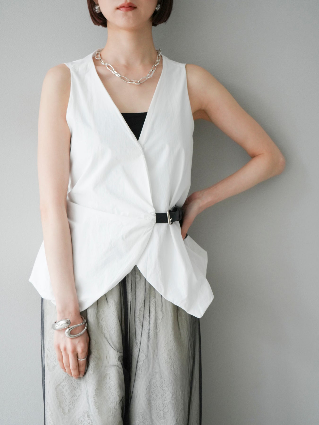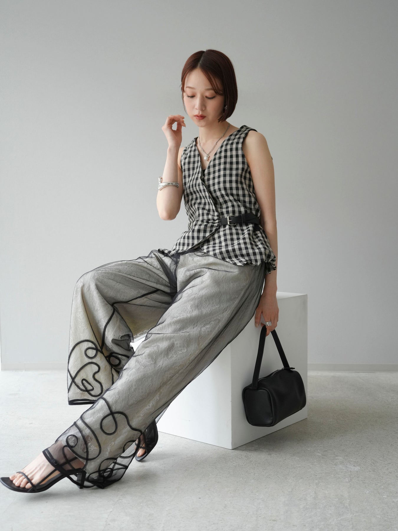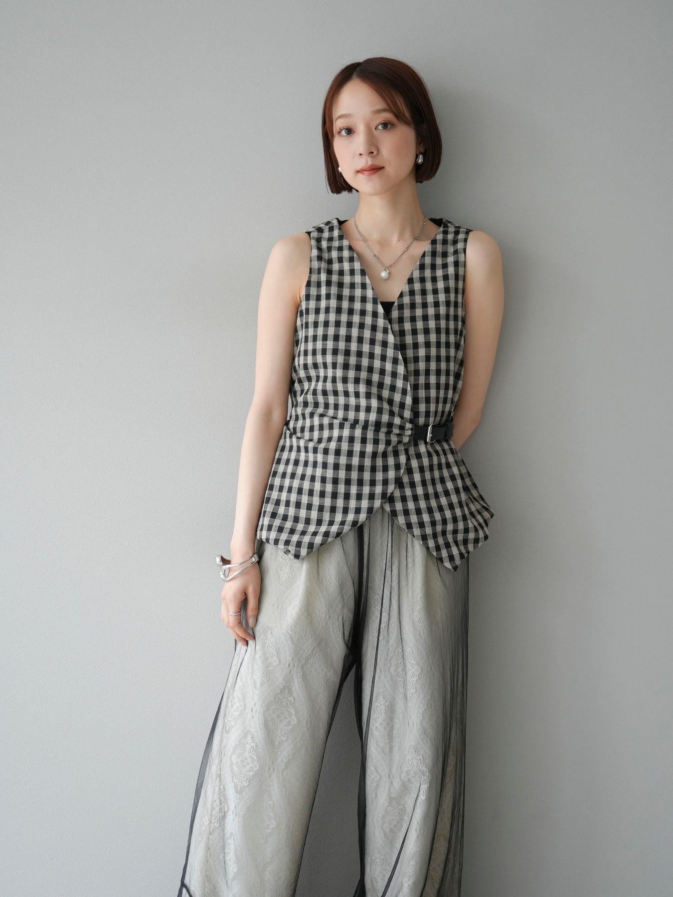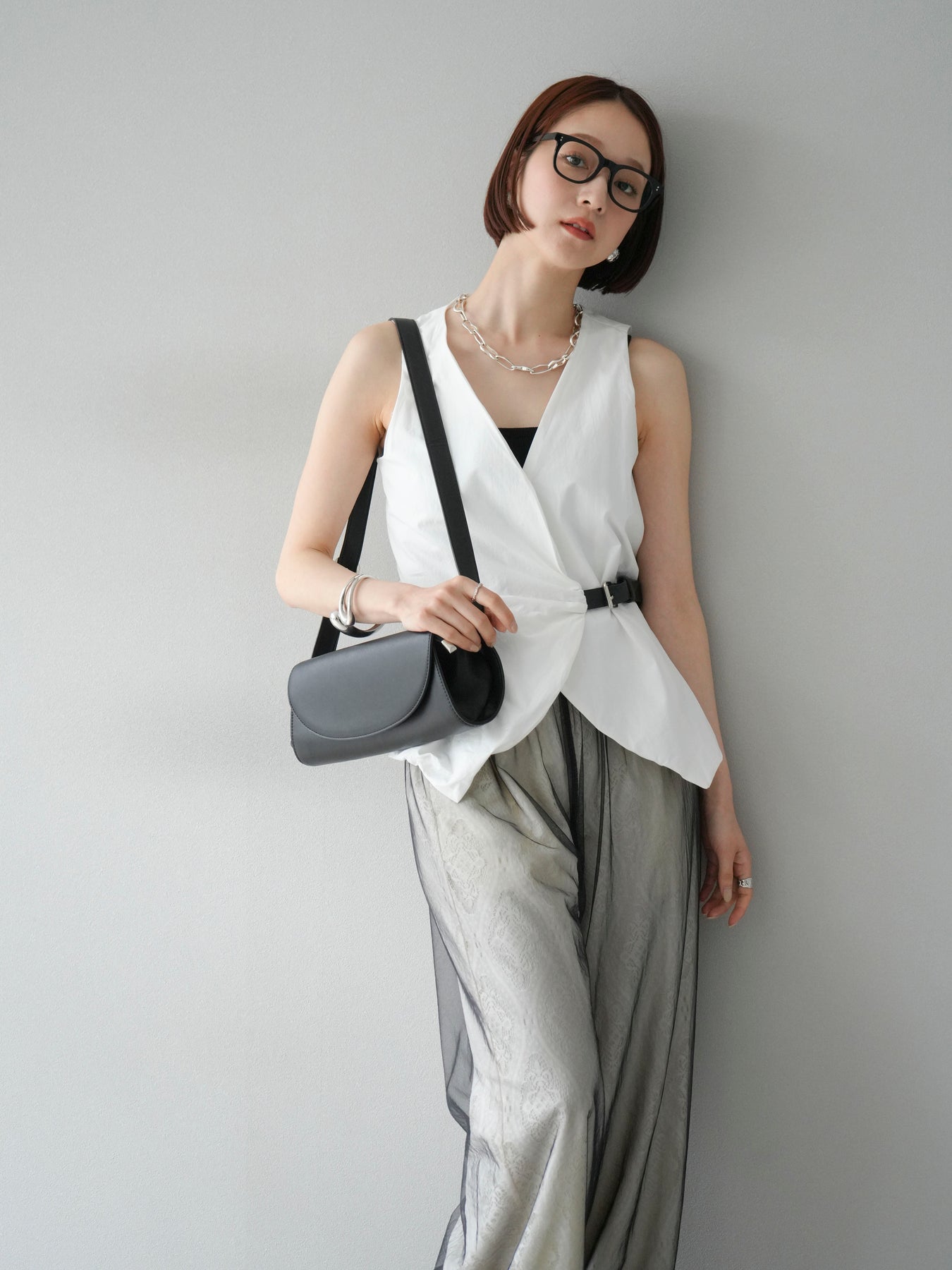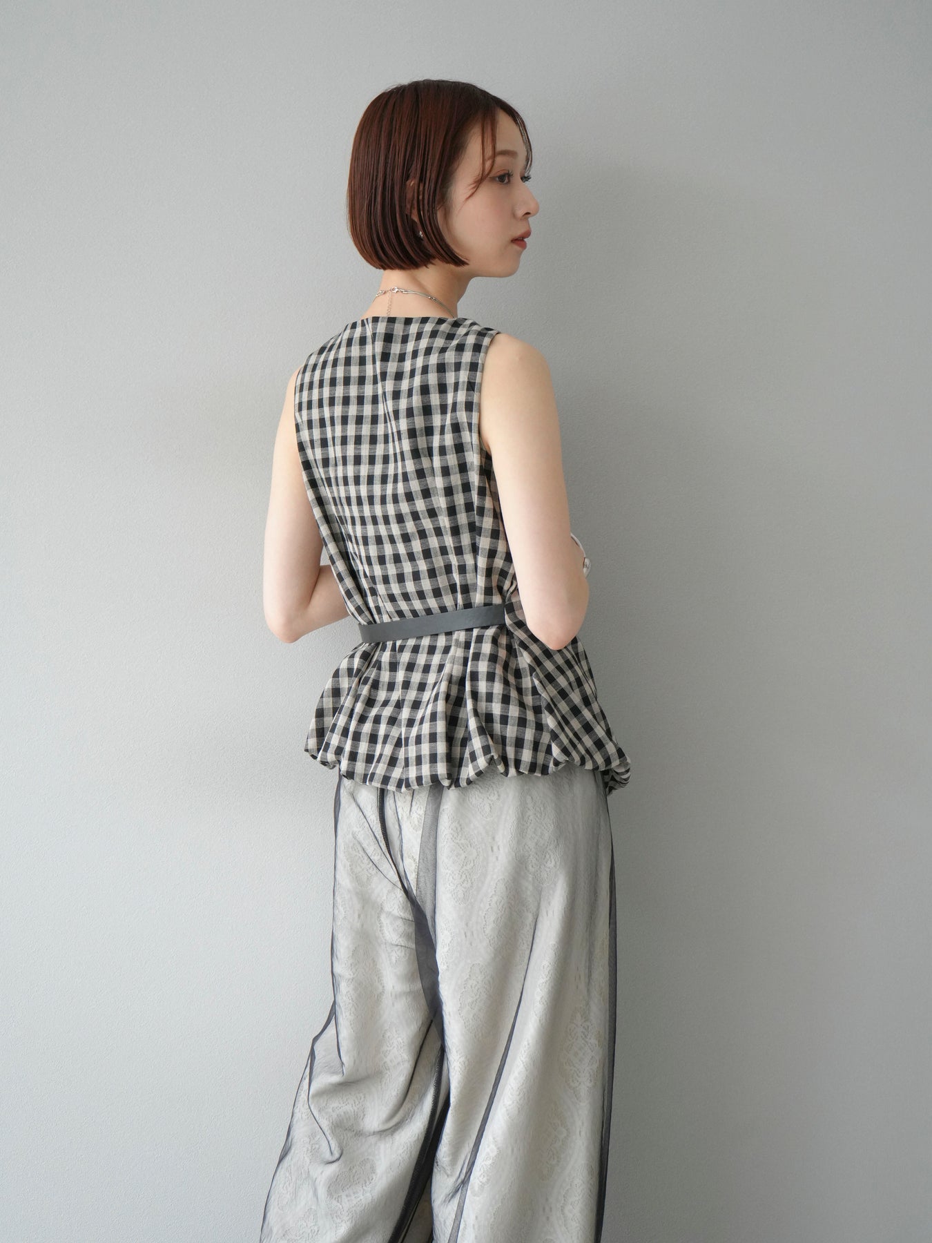 立体的なバルーンシルエットが印象的なベルトデザインのノースリーブブラウス。ギンガムチェック柄に、ラップ風のフロントデザインを施し、ウエスト部分のベルトディテールで美しいシルエットを演出。裾に向かってふんわりと広がるバルーンシルエットは、ウエストラインをすっきりと見せてくれます。1枚でも主役になるデザイン性の高さが魅力で、シンプルなパンツやスカートと合わせるだけで華やかな印象に。 ※ボトムス、キャミソール(インナー)以外の商品は一律でインナーは付属していません。