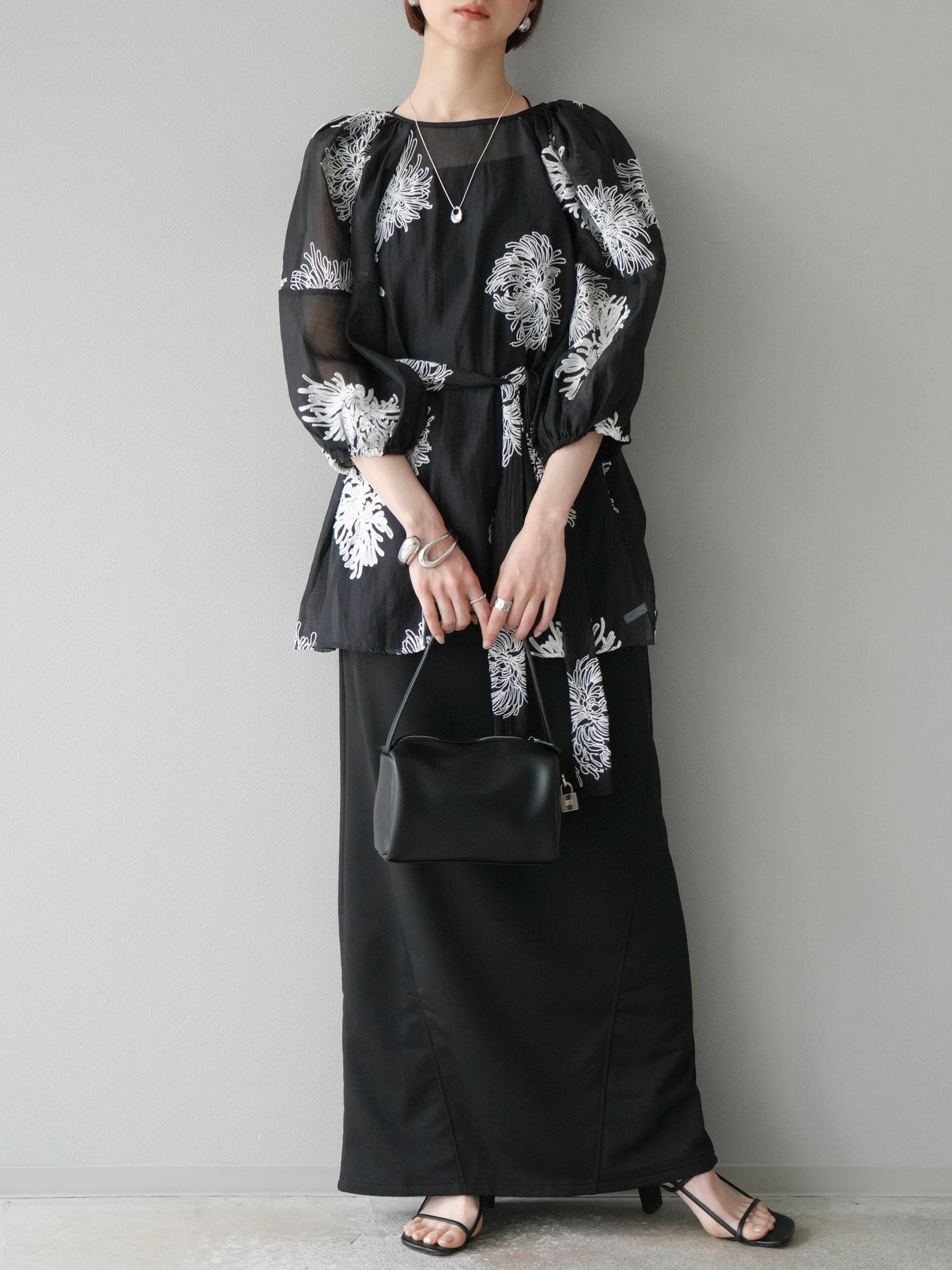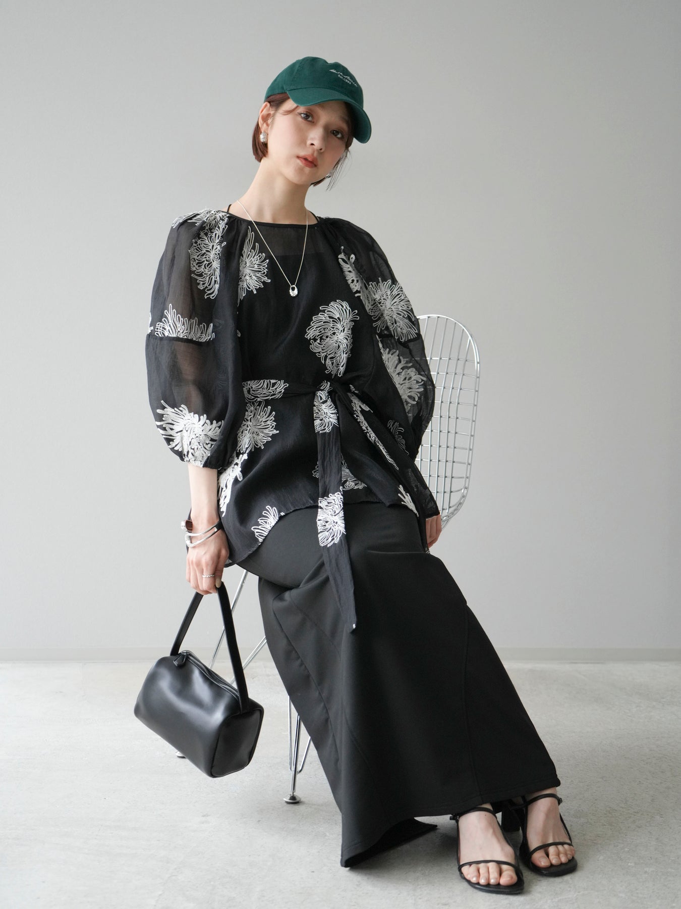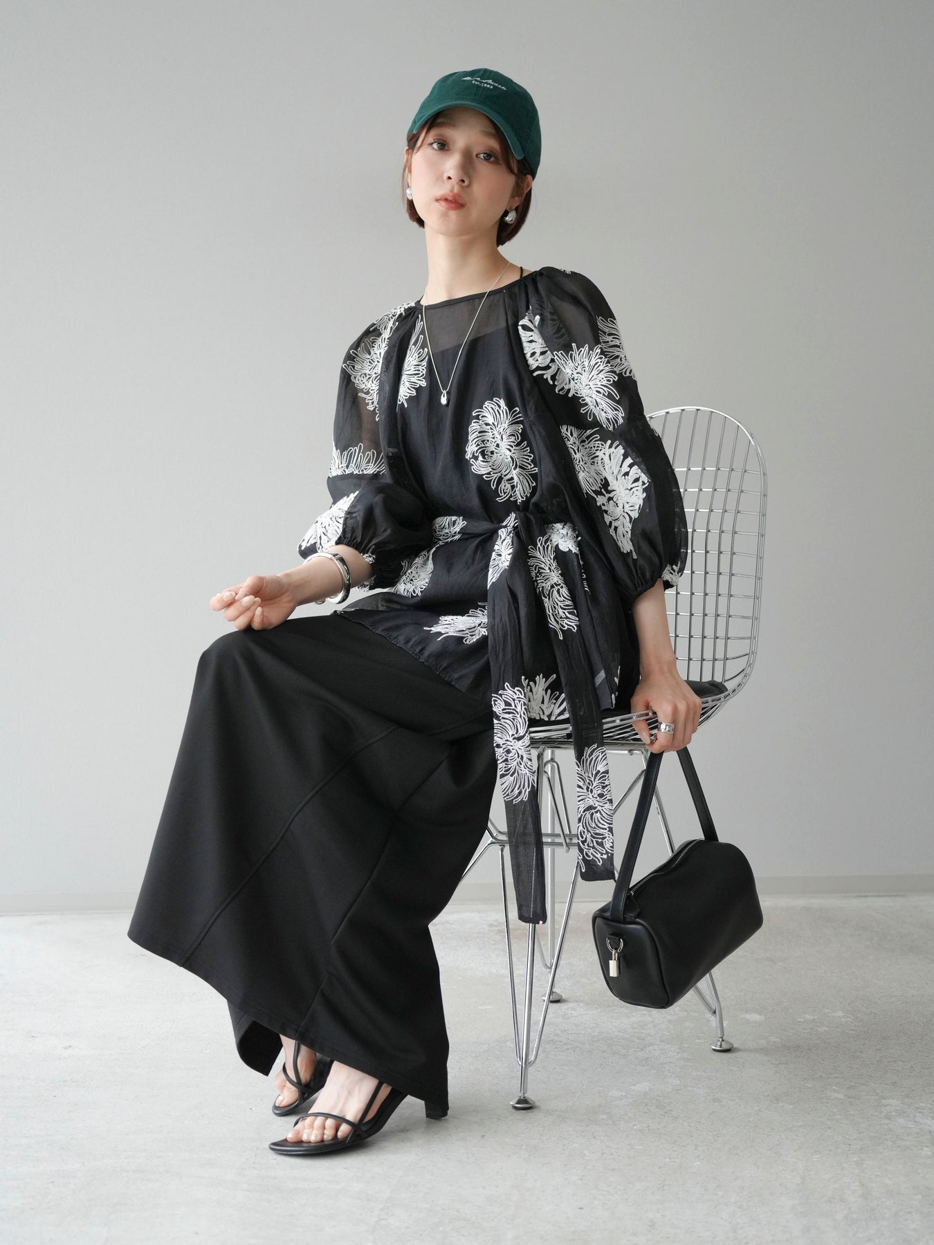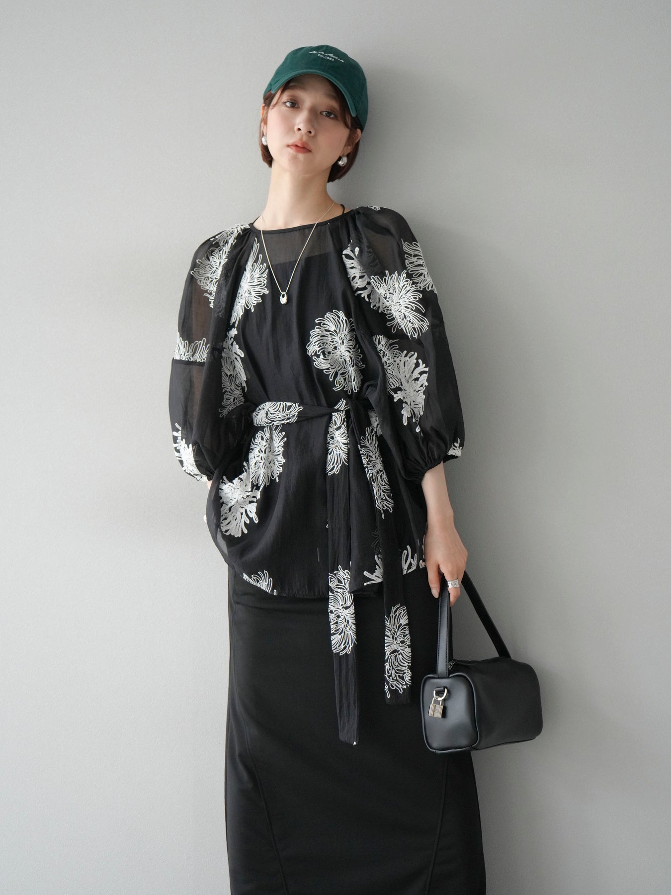 シアー素材に立体的なフラワー刺繍を施した、バルーンスリーブブラウス。ボリュームのある袖とウエストリボンがシルエットにメリハリを与え、1枚で着映えするデザインが魅力。軽やかで透け感のある素材が、抜け感とフェミニンな印象を演出します。パンツにもスカートにも合わせやすく、オンオフ問わず活躍するアイテムです。 ※ボトムス、キャミソール(インナー)以外の商品は一律でインナーは付属していません。