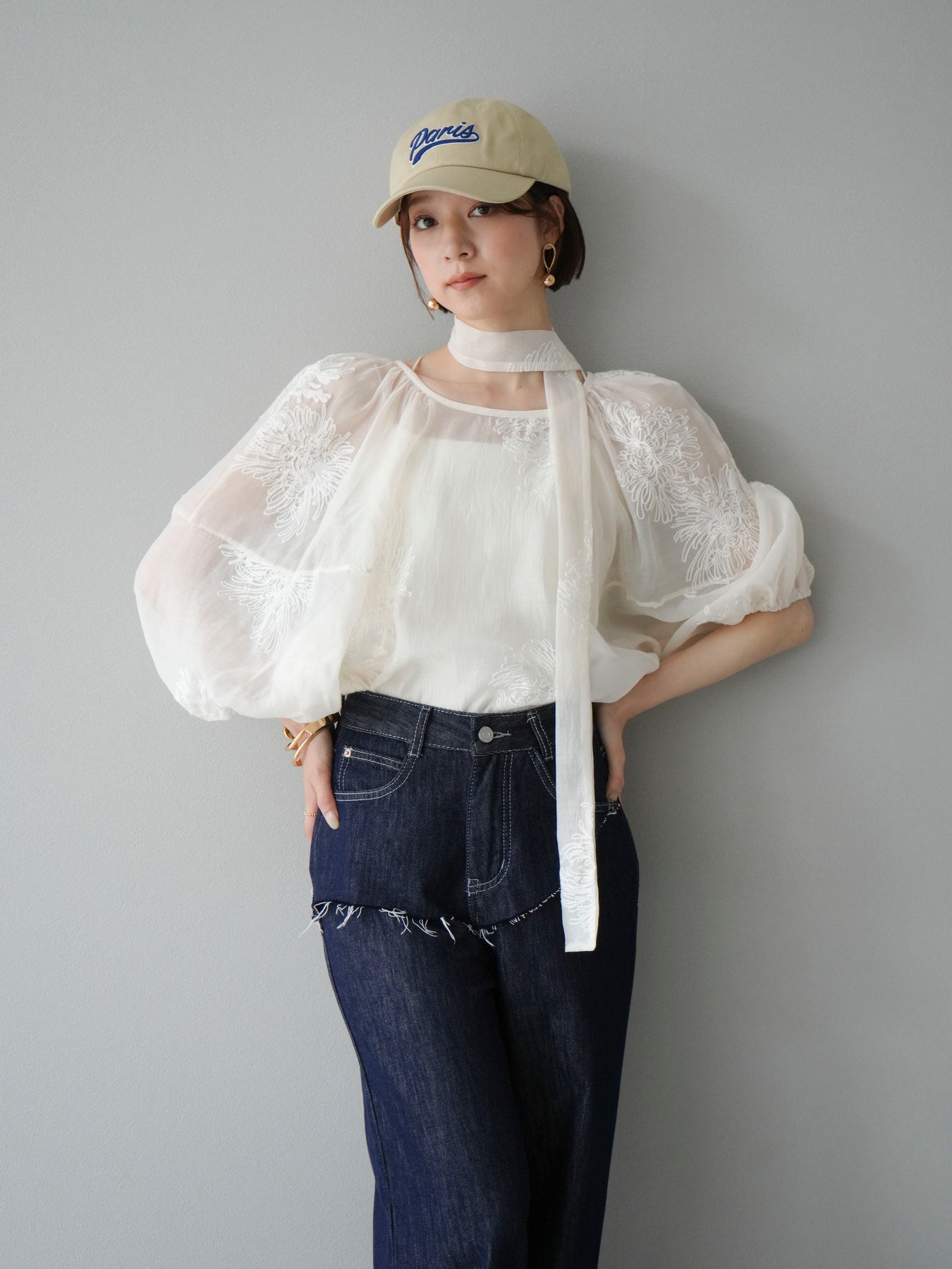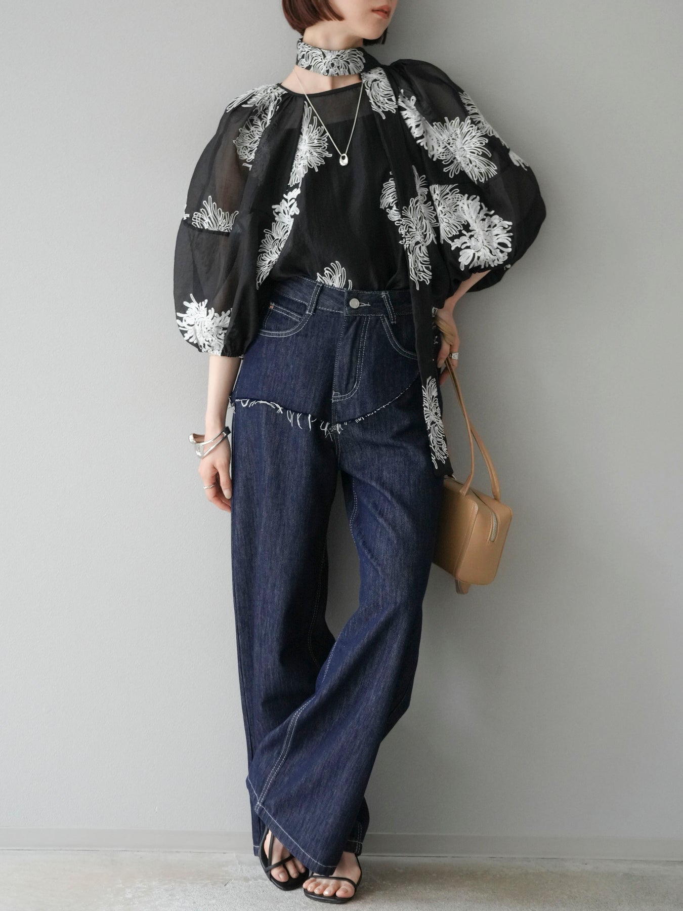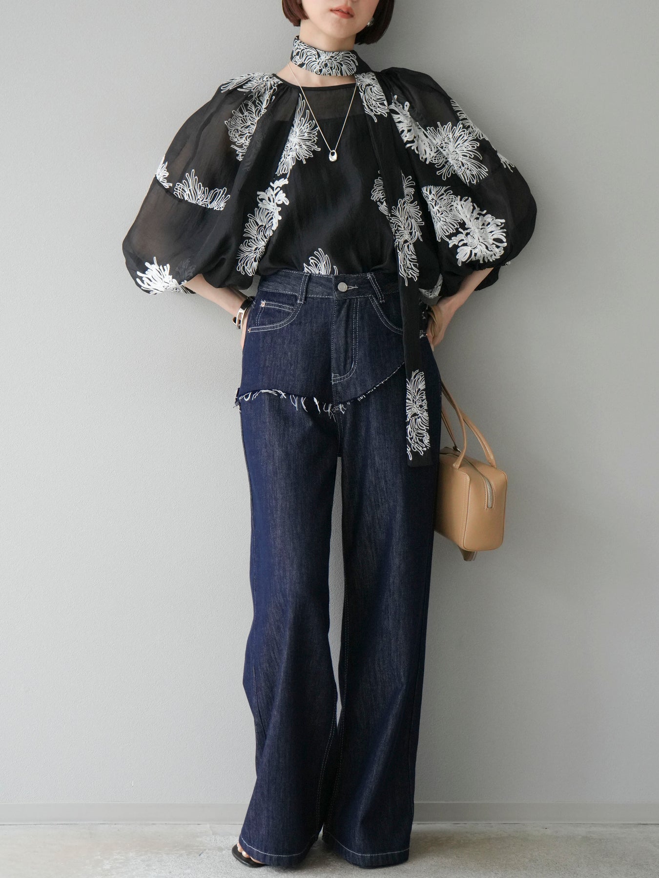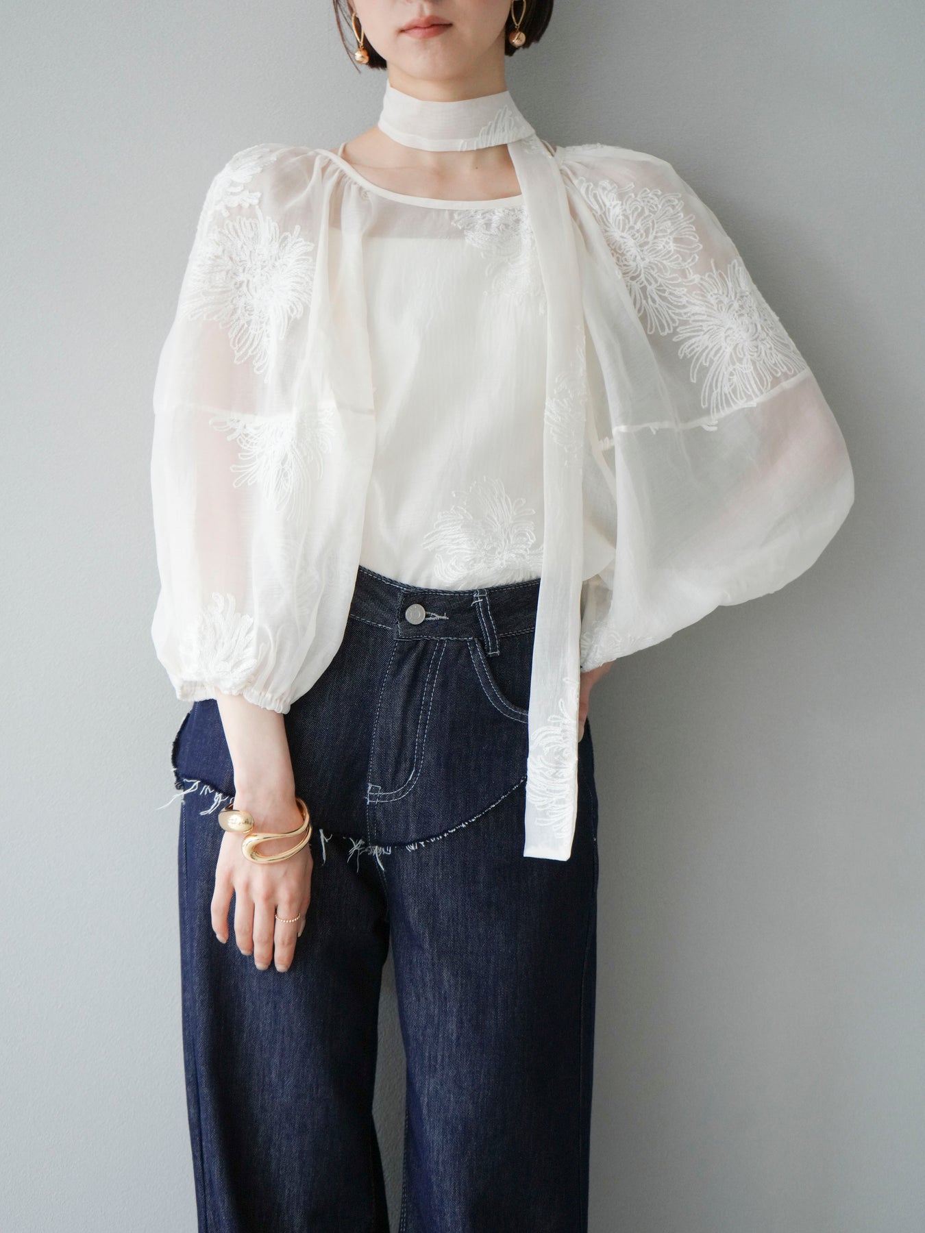 [SET]刺繍シアーバルーンスリーブブラウス+ヒップデザインデニムパンツ(2set)