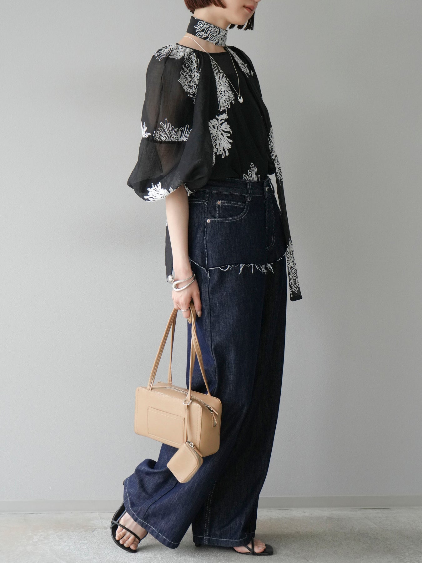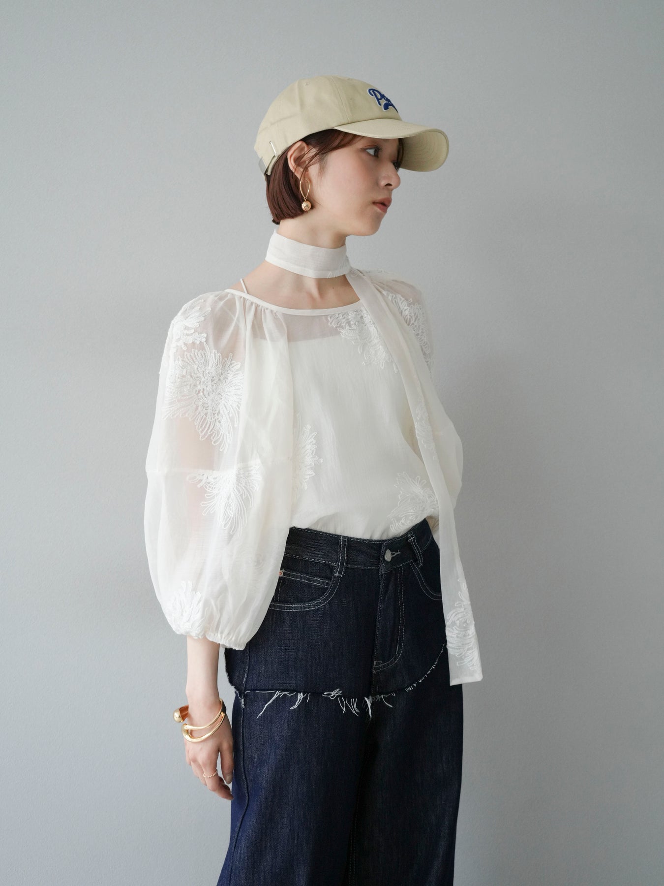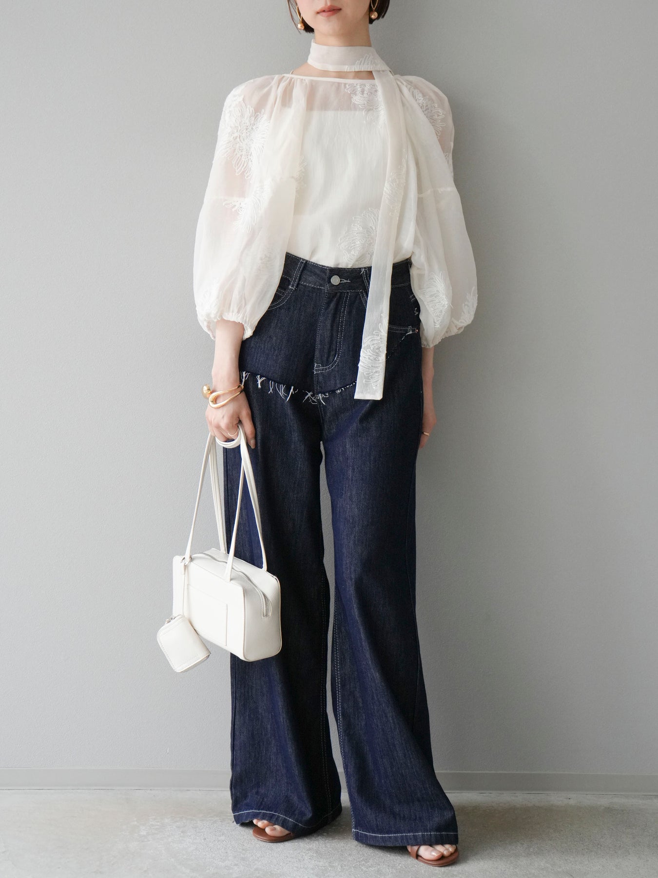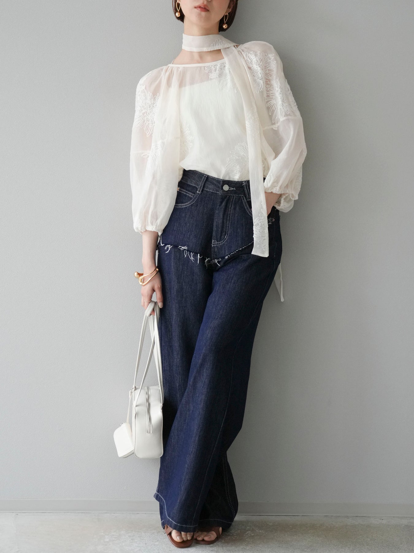 [SET]刺繍シアーバルーンスリーブブラウス+ヒップデザインデニムパンツ(2set)