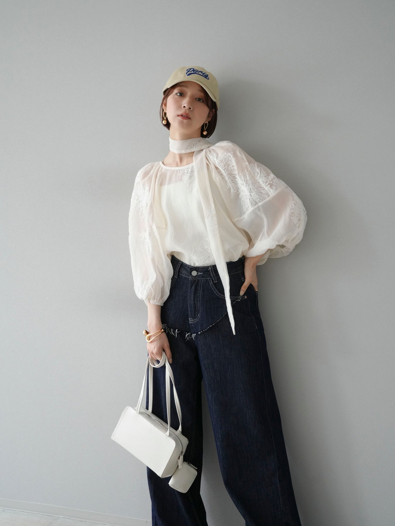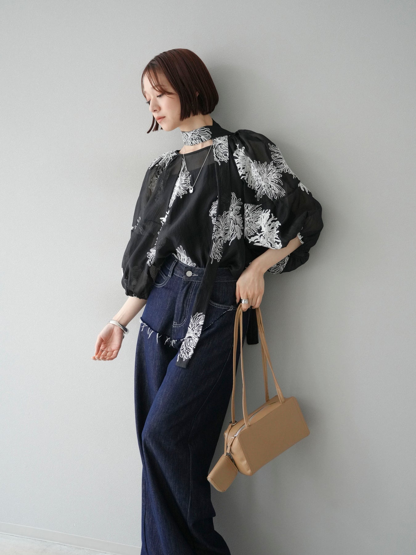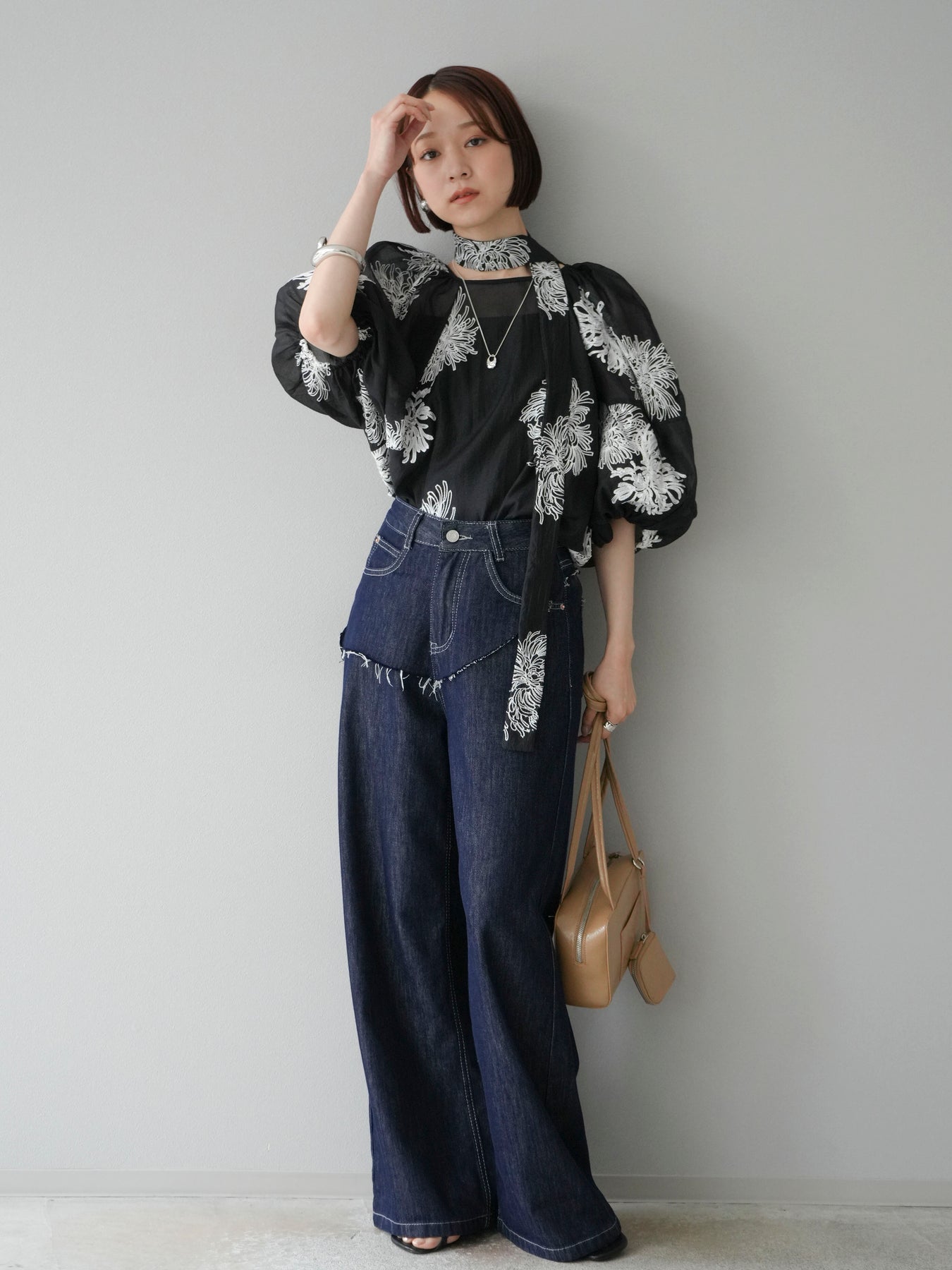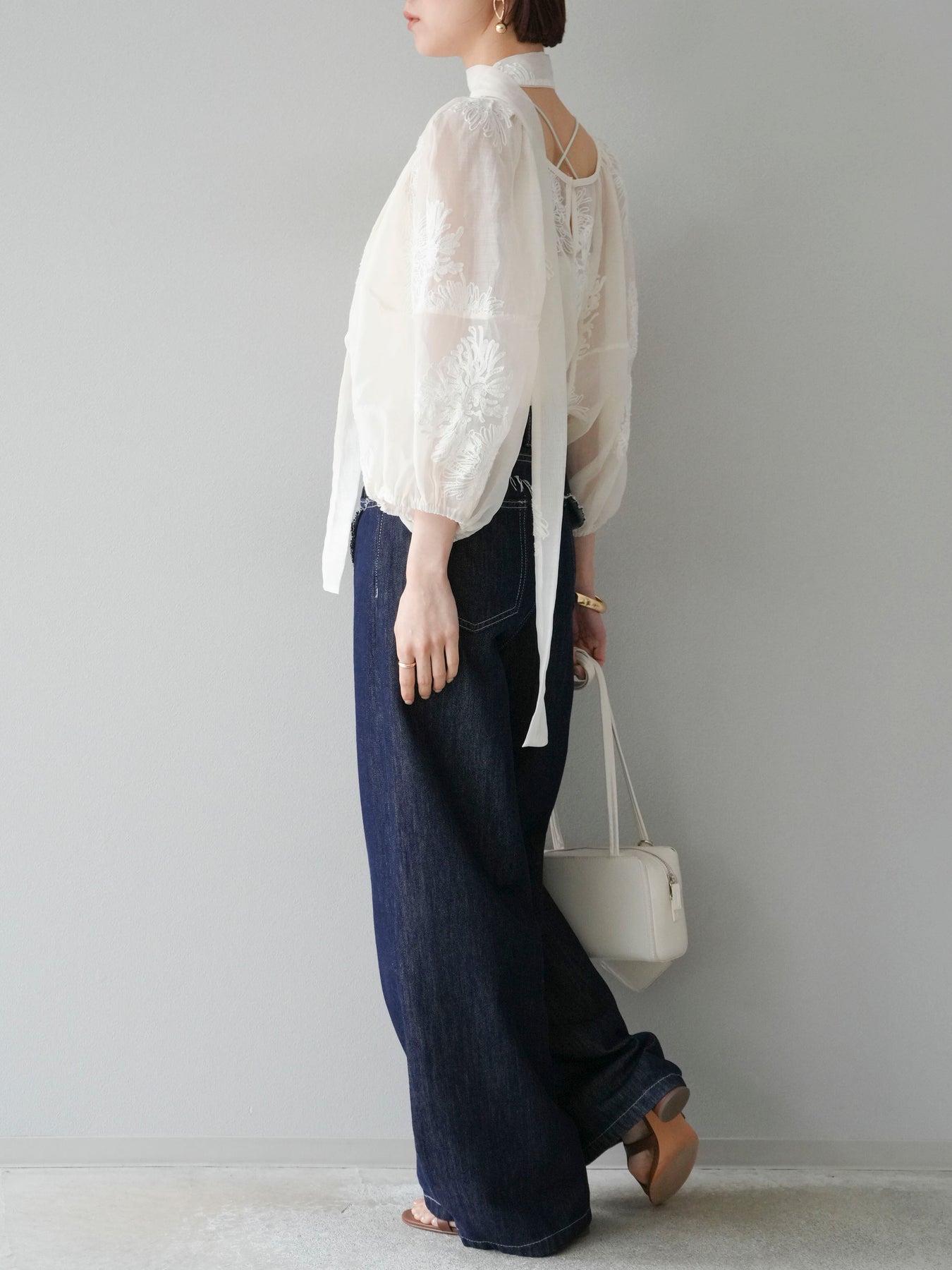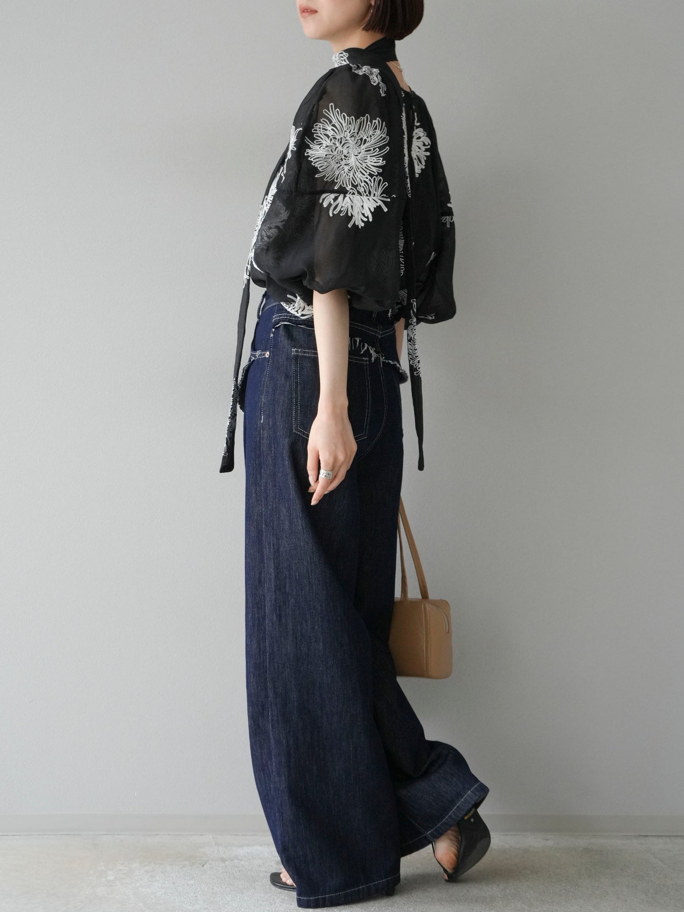 [SET]刺繍シアーバルーンスリーブブラウス+ヒップデザインデニムパンツ(2set)