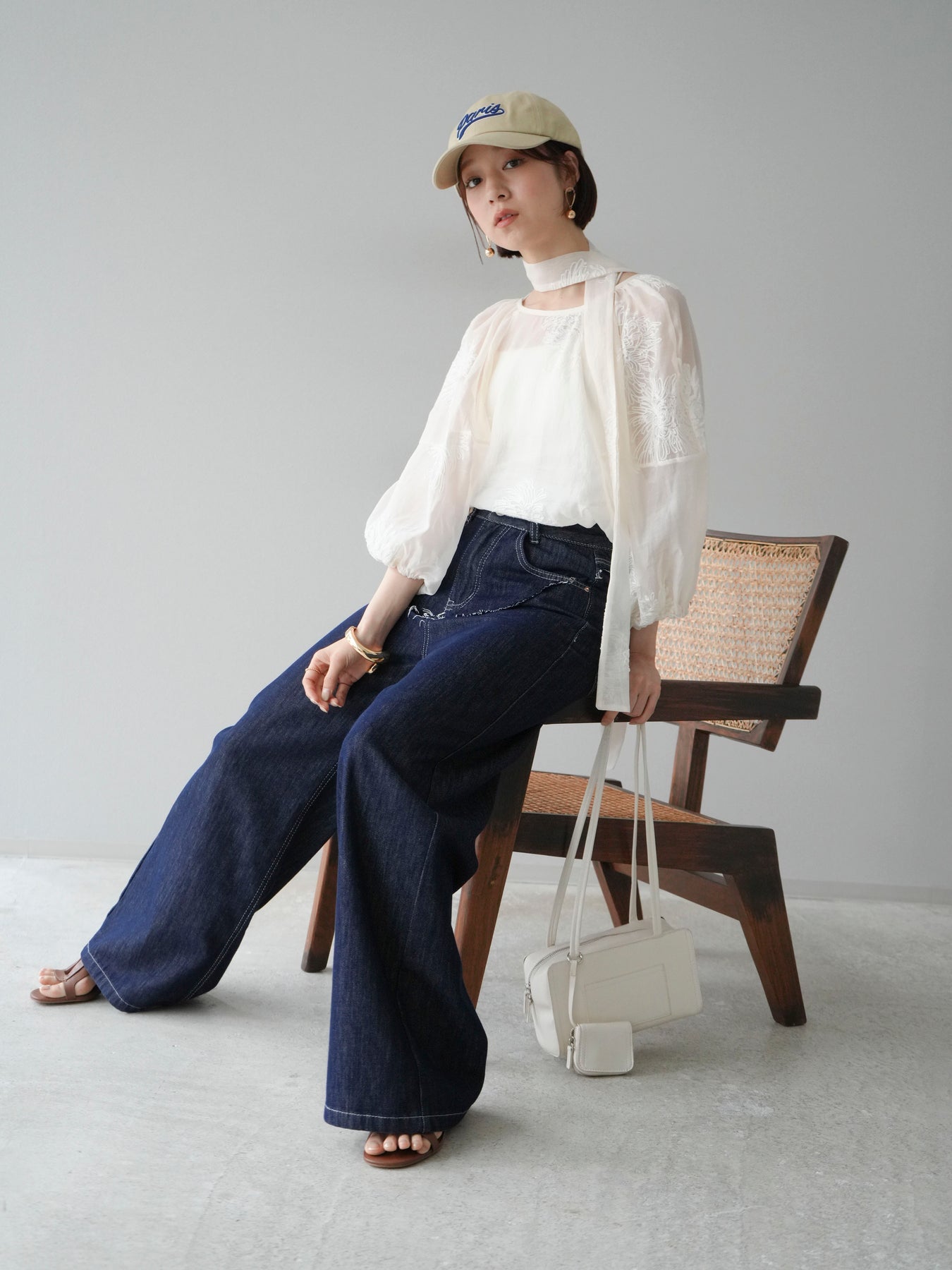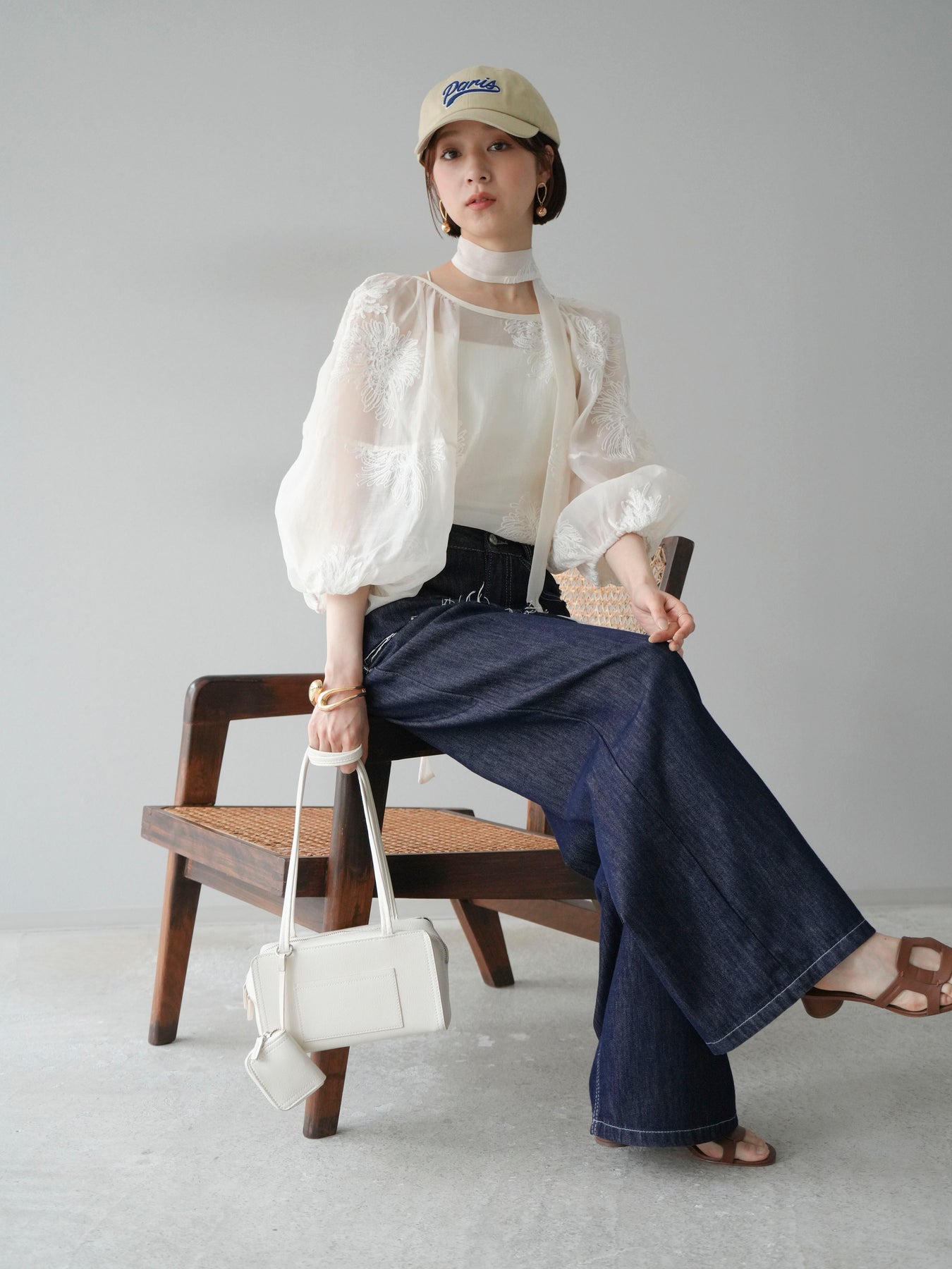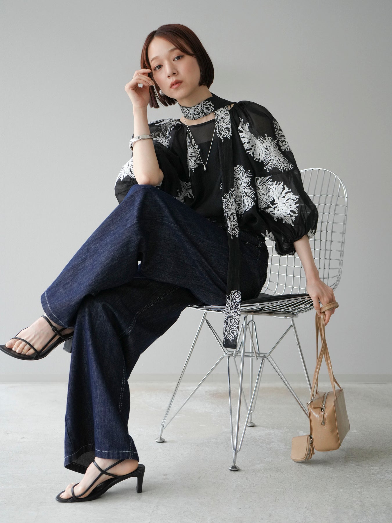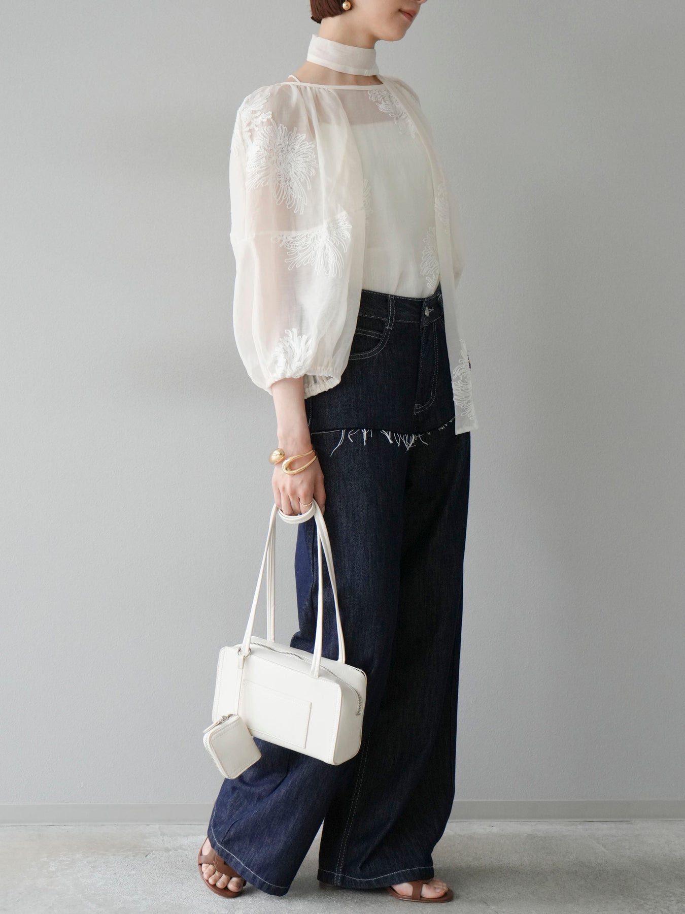 [SET]刺繍シアーバルーンスリーブブラウス+ヒップデザインデニムパンツ(2set)