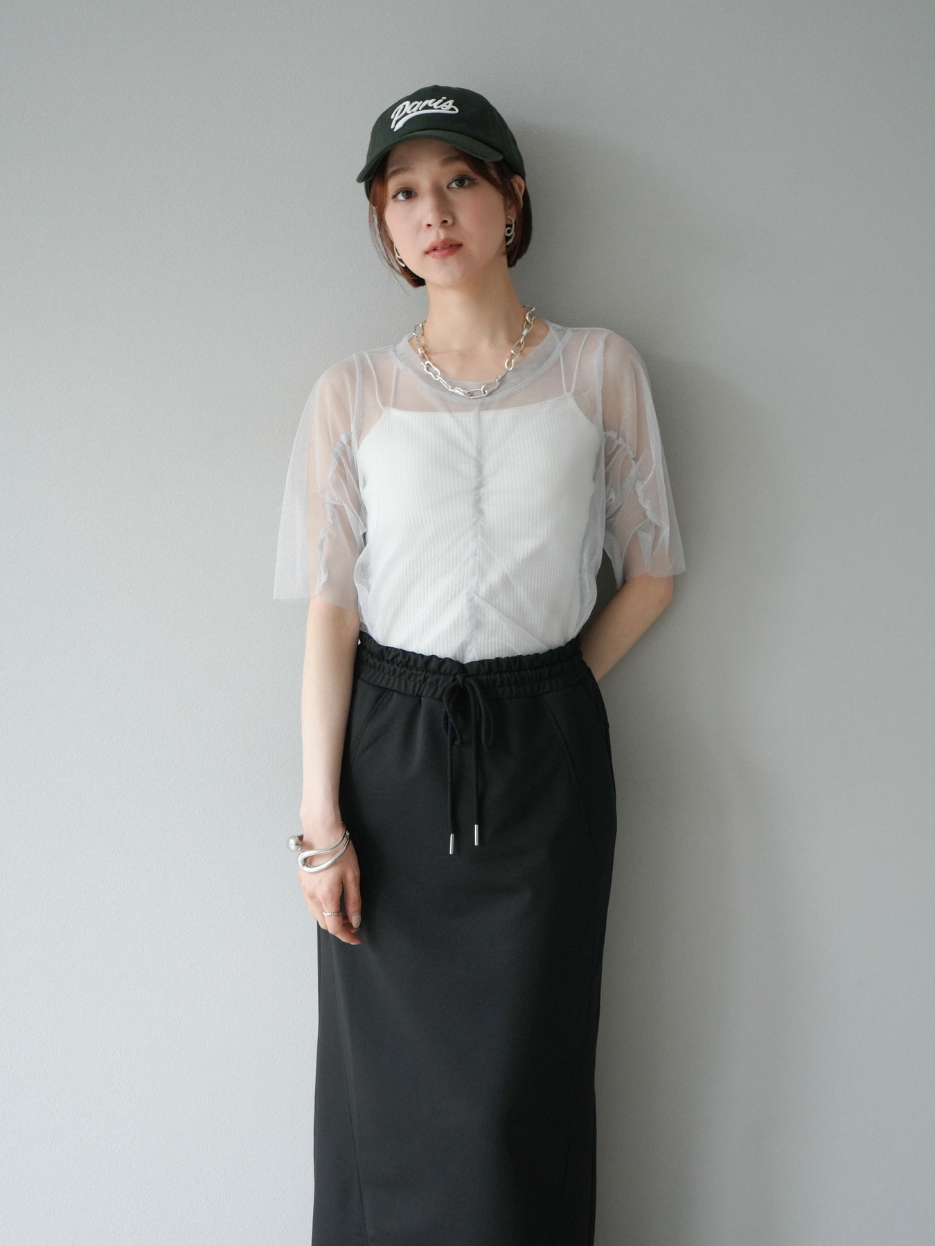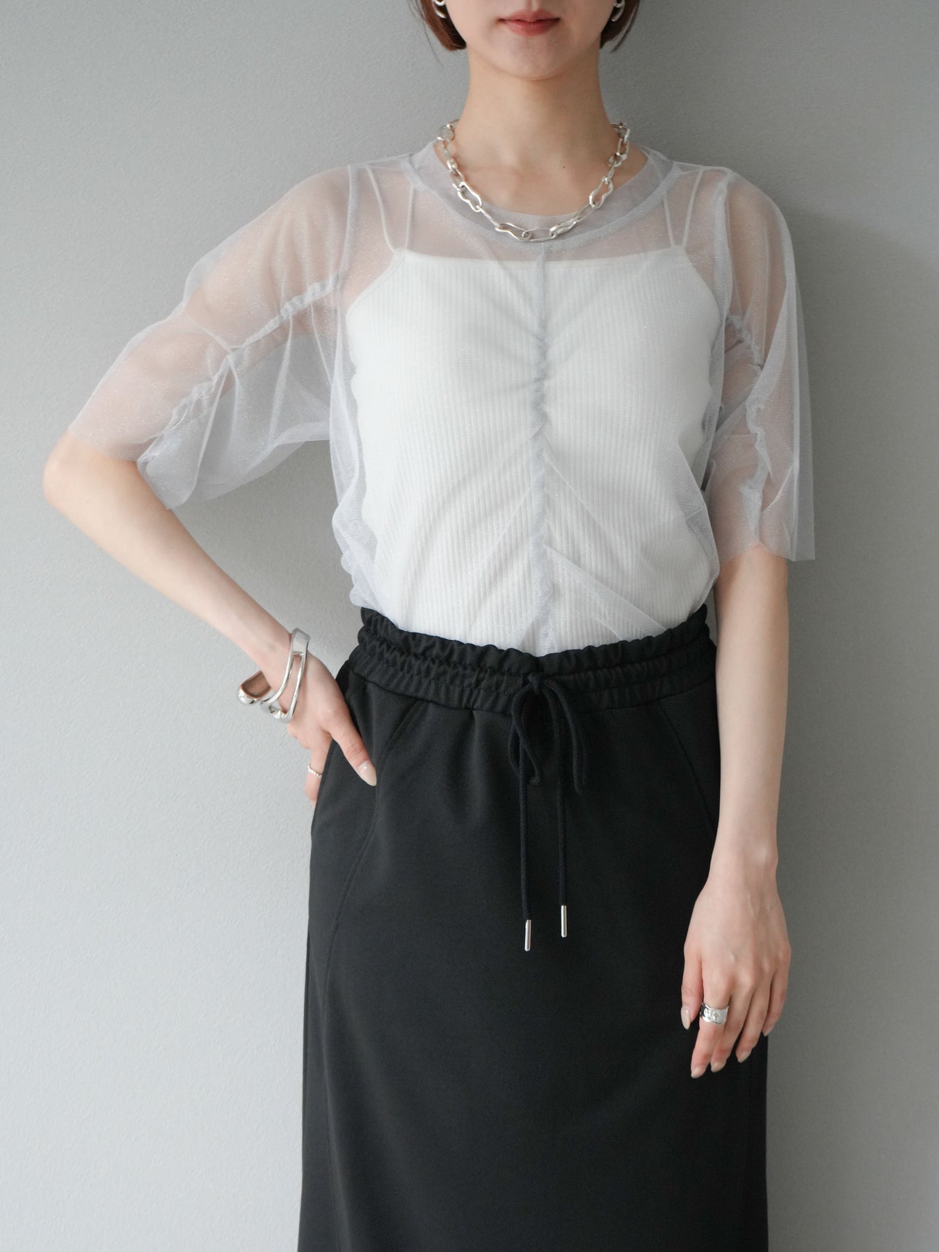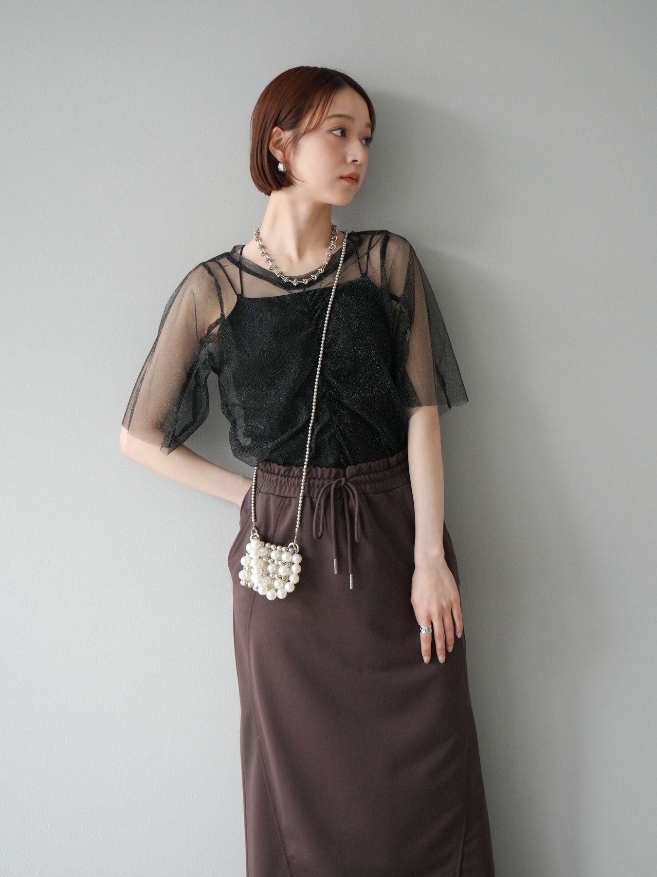 繊細なラメチュールが華やかさを添えるシャーリングプルオーバー。程よい透け感と、フロント&ウエストのドロストギャザーが立体的なシルエットを演出します。レイヤードスタイルに最適で、キャミソールやワンピースの上からさらりと羽織るだけで、旬な着こなしが完成します。デイリーから特別なシーンまで幅広く活躍する一枚です。 ※ボトムス、キャミソール(インナー)以外の商品は一律でインナーは付属していません。