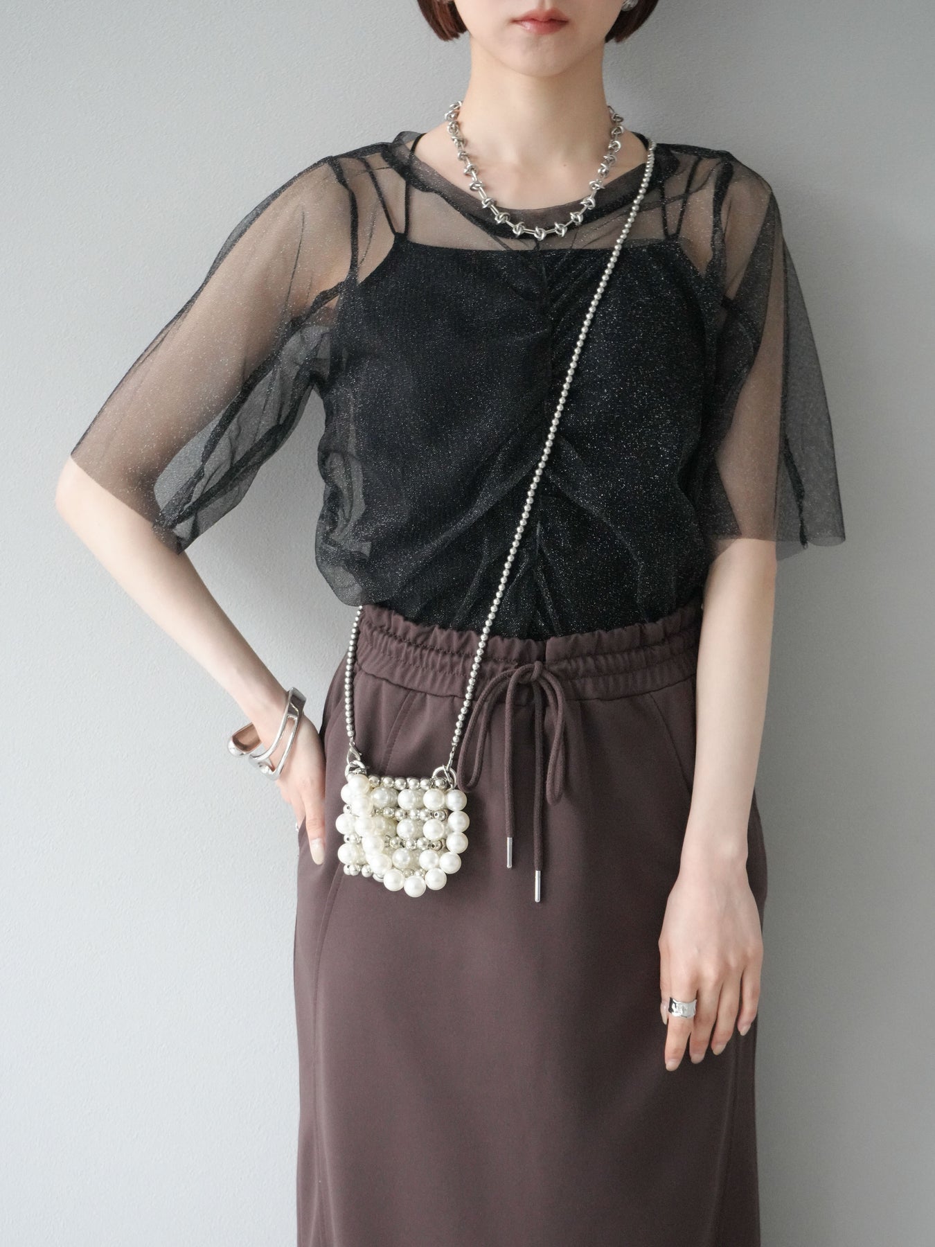 繊細なラメチュールが華やかさを添えるシャーリングプルオーバー。程よい透け感と、フロント&ウエストのドロストギャザーが立体的なシルエットを演出します。レイヤードスタイルに最適で、キャミソールやワンピースの上からさらりと羽織るだけで、旬な着こなしが完成します。デイリーから特別なシーンまで幅広く活躍する一枚です。 ※ボトムス、キャミソール(インナー)以外の商品は一律でインナーは付属していません。