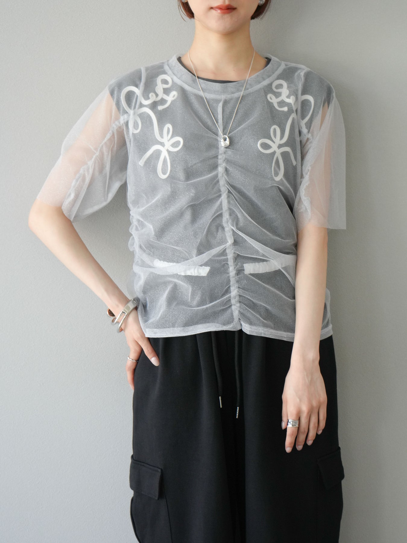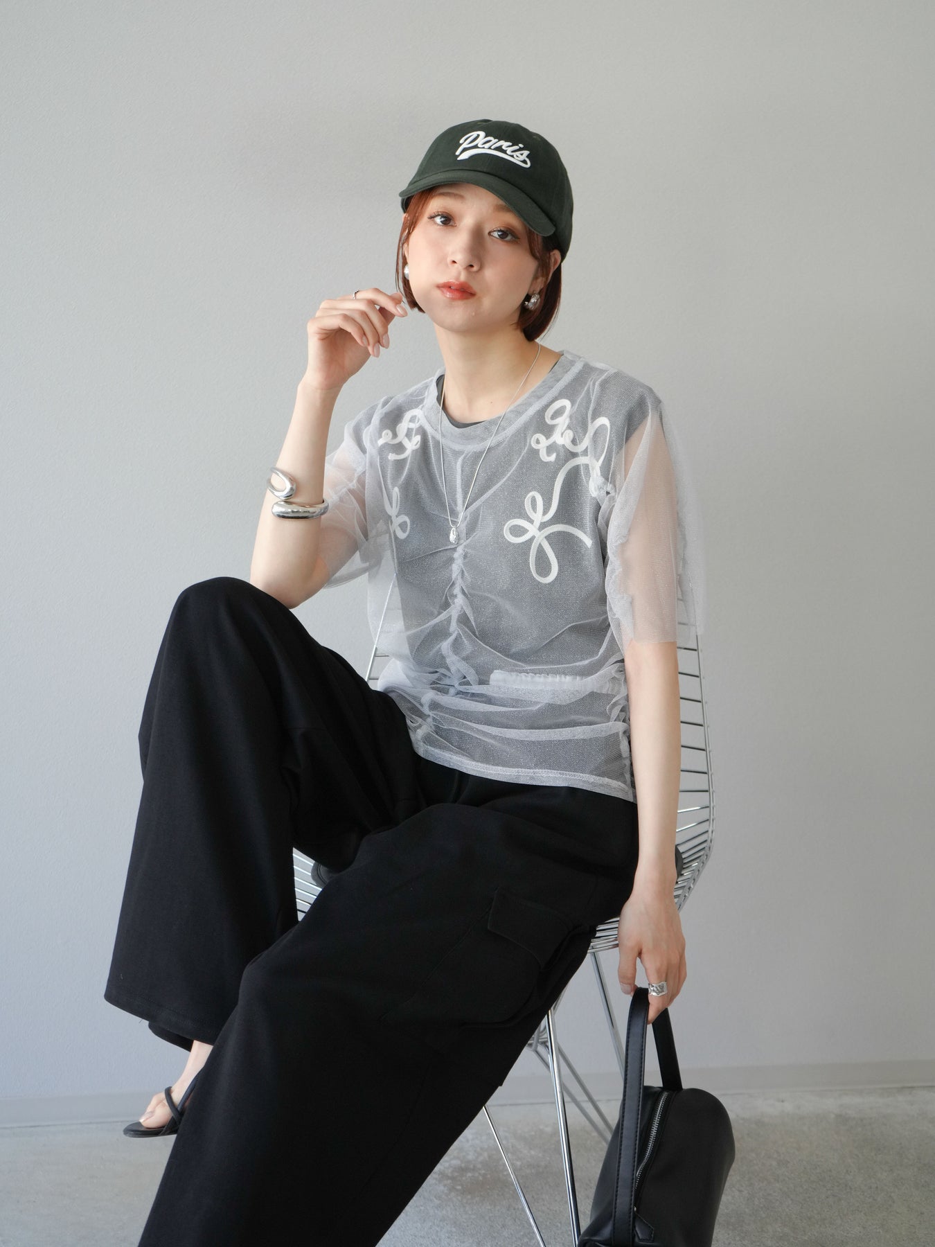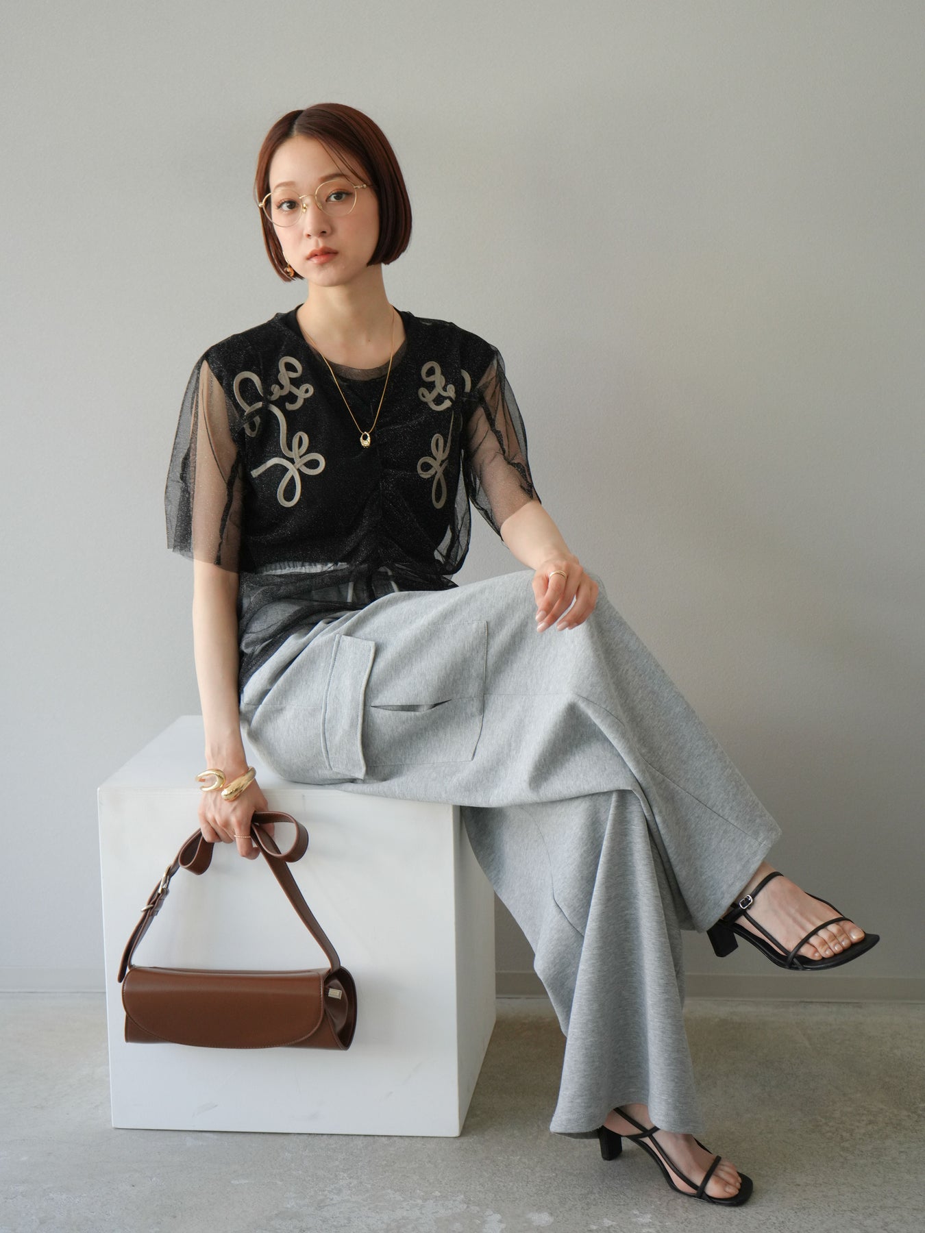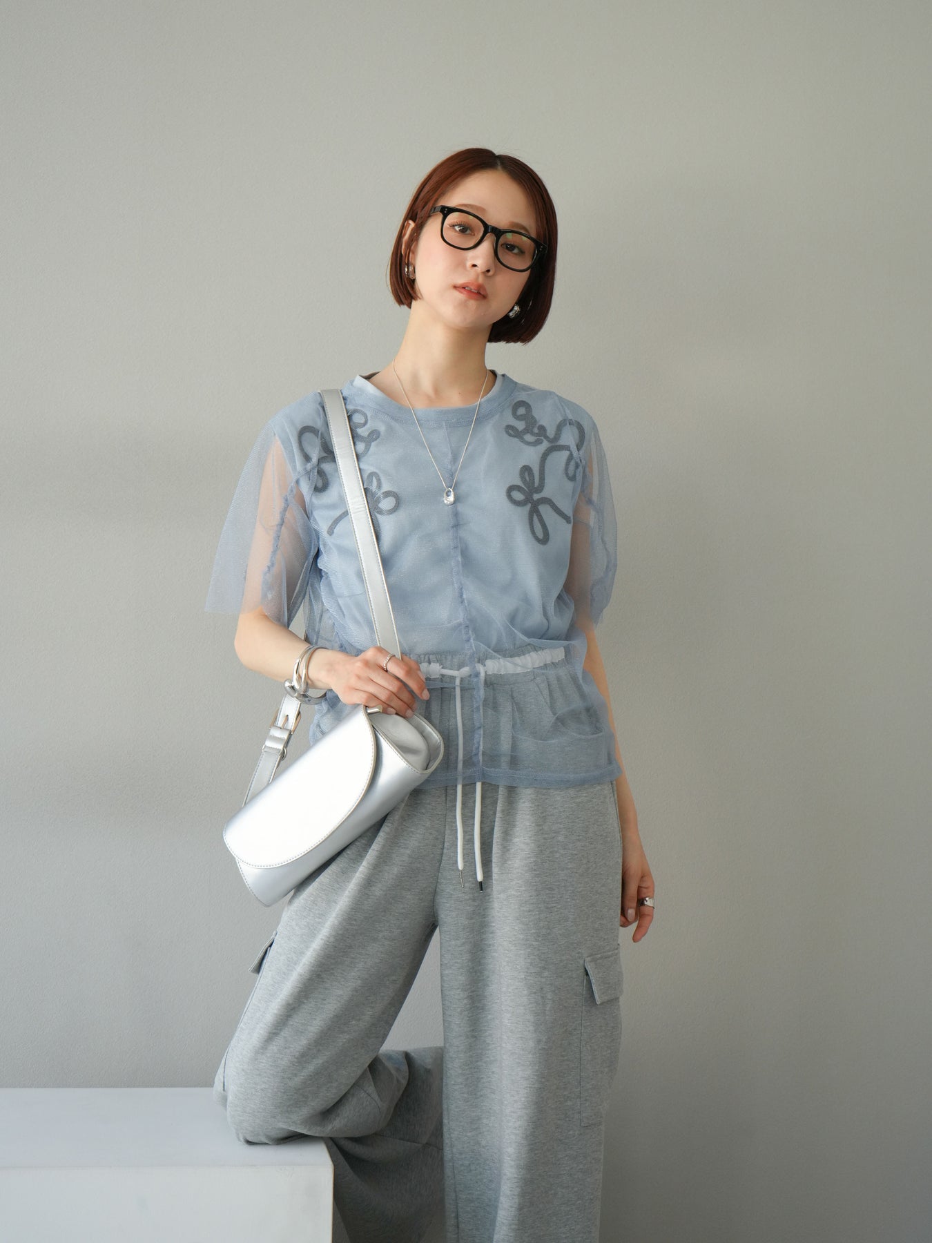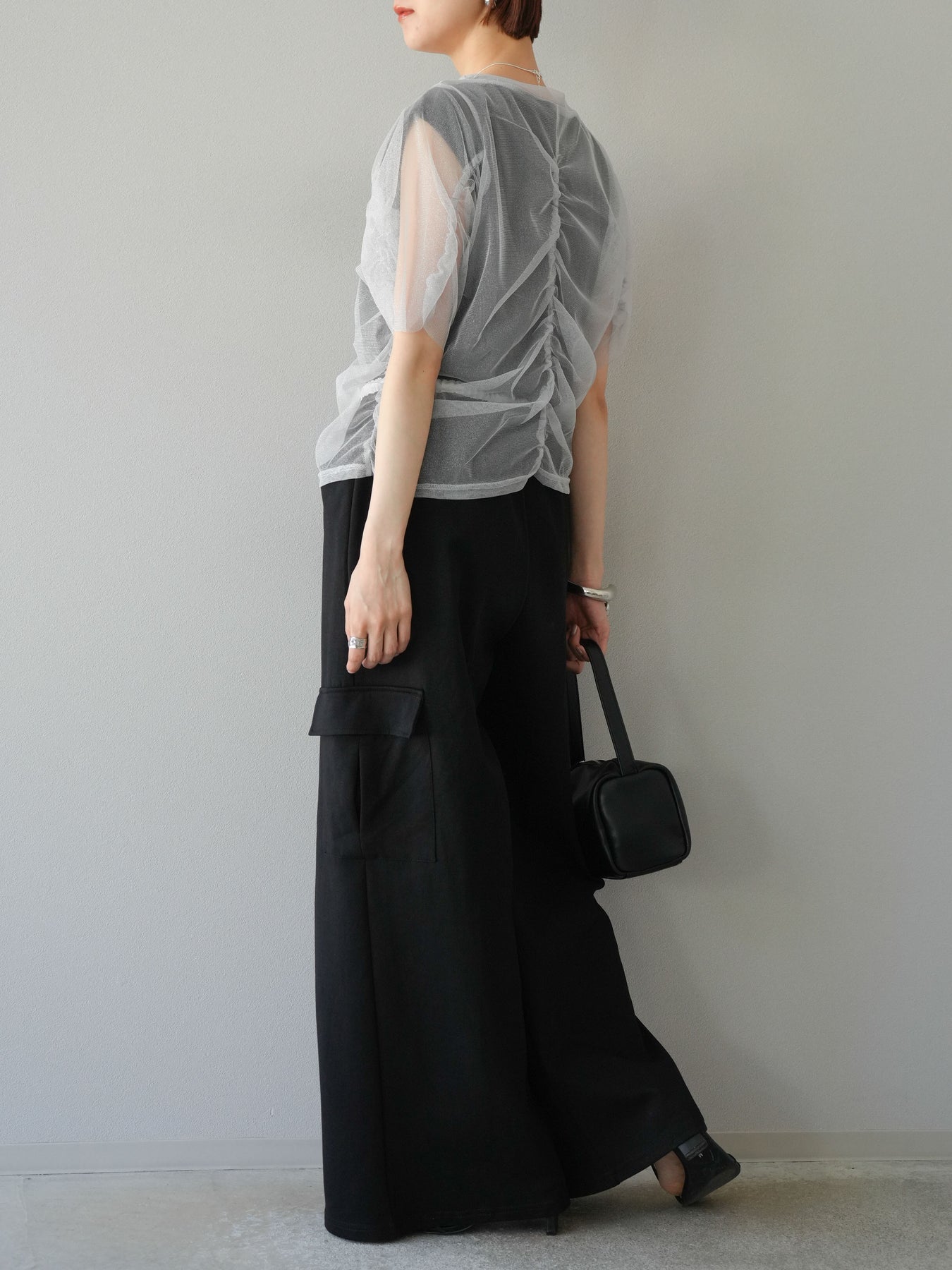 繊細なラメチュールが華やかさを添えるシャーリングプルオーバー。程よい透け感と、フロント&ウエストのドロストギャザーが立体的なシルエットを演出します。レイヤードスタイルに最適で、キャミソールやワンピースの上からさらりと羽織るだけで、旬な着こなしが完成します。デイリーから特別なシーンまで幅広く活躍する一枚です。 ※ボトムス、キャミソール(インナー)以外の商品は一律でインナーは付属していません。