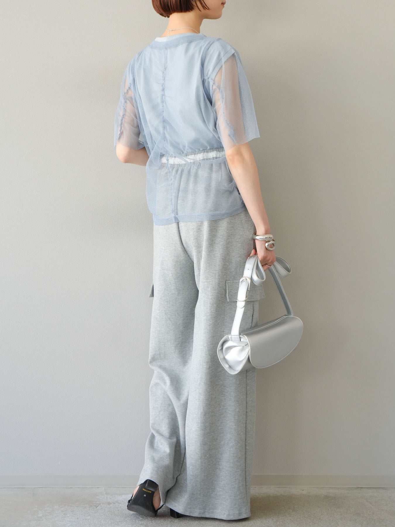 ウエストのドローストリングと異素材切替デザインがアクセントになった、リラクシーな印象のスウェットパンツ。サイドには立体感のあるカーゴポケットを配し、カジュアルながらもデザイン性の高い1本に仕上がっています。ワイドシルエットと柔らかな素材感で穿き心地も抜群。Tシャツやタンクトップと合わせたカジュアルコーデはもちろん、シャツやジャケットを羽織ったミックススタイルにもおすすめです。デイリー使いからワンマイルウェアまで活躍します。