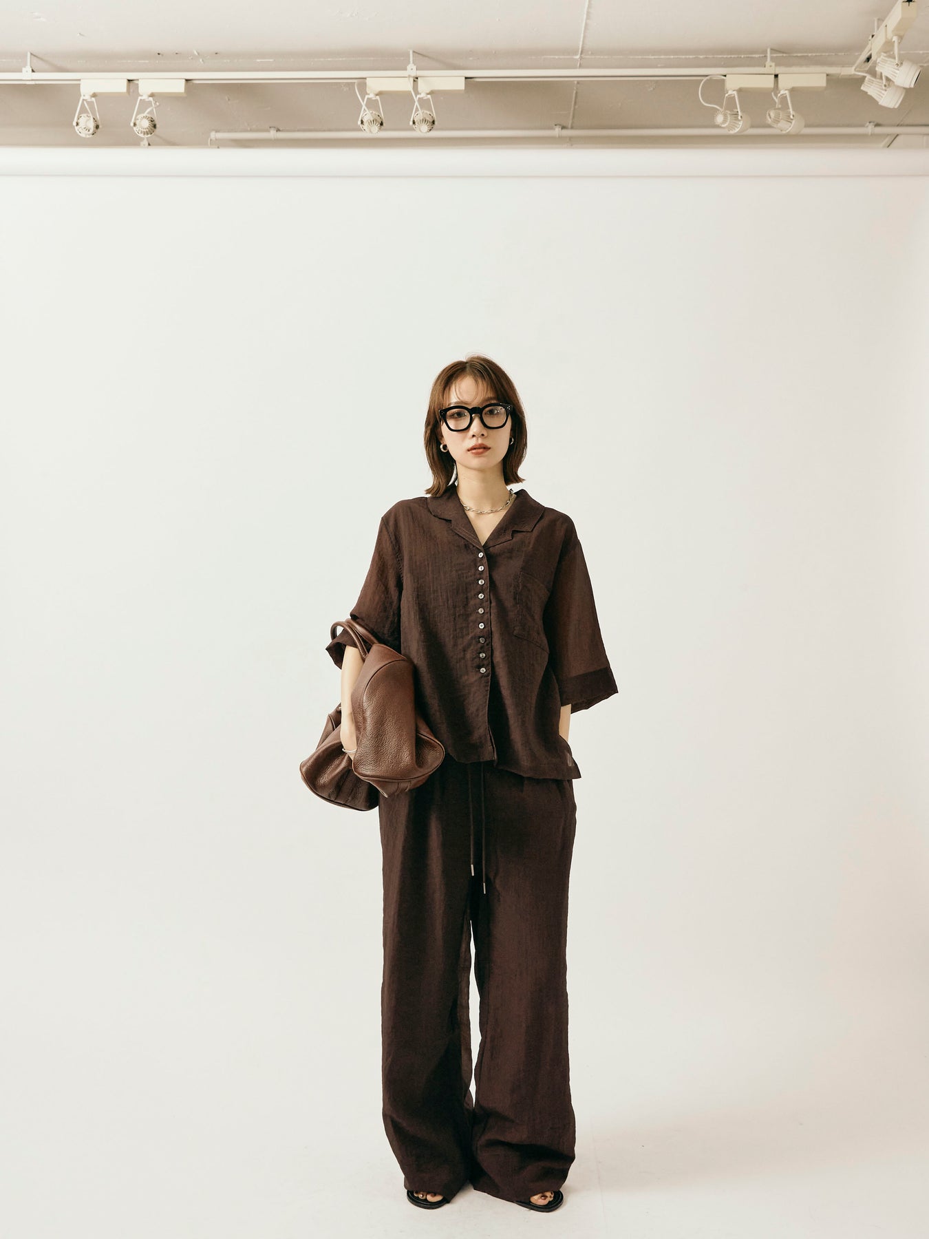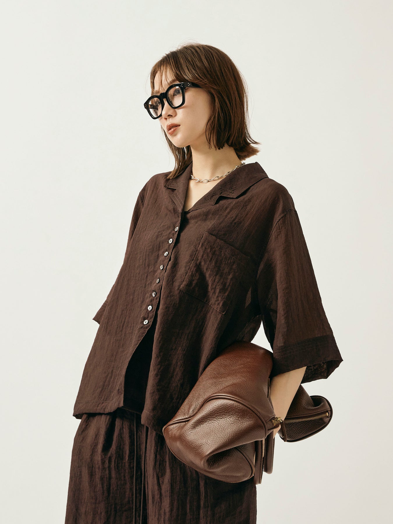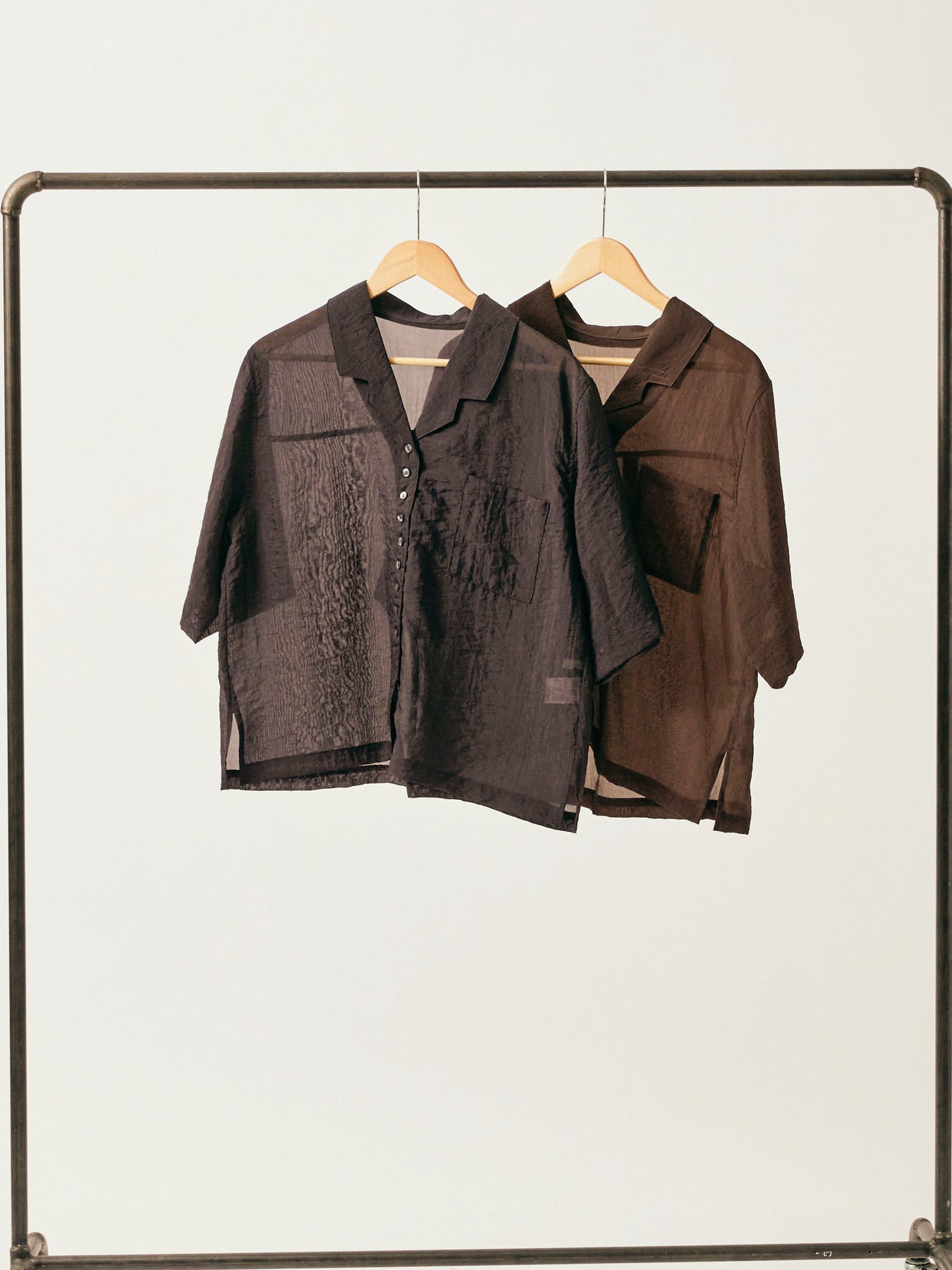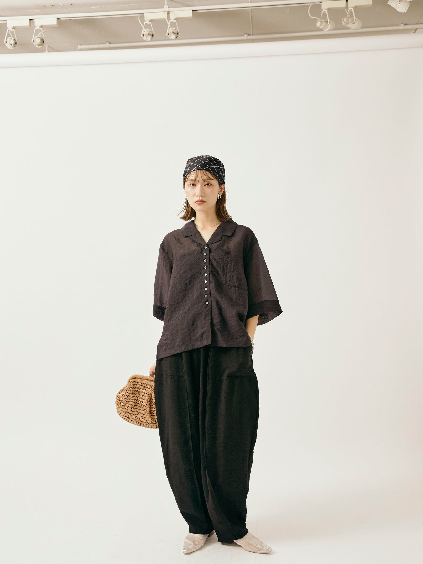 繊細な透け感と光沢が魅力のシャイニースラブ素材を使用した開襟ハーフシャツ。 ほんのりシアーな質感が、軽やかで涼しげな印象を与えてくれます。 ドロップショルダーとややワイドなシルエットで、ラフさと抜け感を演出。 タンクトップやキャミソールとのレイヤードはもちろん、羽織りとしても活躍します。 シンプルながらも洗練された大人のリラックススタイルにぴったりな1着です。 ※ボトムス、キャミソール(インナー)以外の商品は一律でインナーは付属していません。