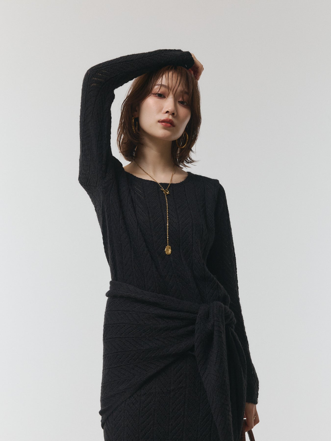 繊細な透かし編み模様が魅力のトップスとスカートに、同素材のウエストリボンを加えた3点セット。トップスはシンプルなクルーネックデザインで着回しやすく、スカートは程よいフレアシルエットが女性らしい印象を与えます。付属のリボンをウエストに巻けば、スタイルにアクセントを加えつつスタイルアップ効果も抜群。リボンを外してシンプルに着こなすこともでき、気分やシーンに合わせてアレンジが楽しめます。セットで着用すれば統一感のある上品なスタイルが完成し、それぞれ単品でも活躍する万能アイテム。デイリーから特別なシーンまで幅広く対応できる一着です。