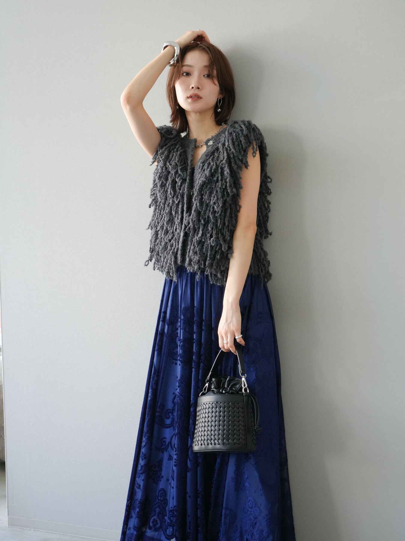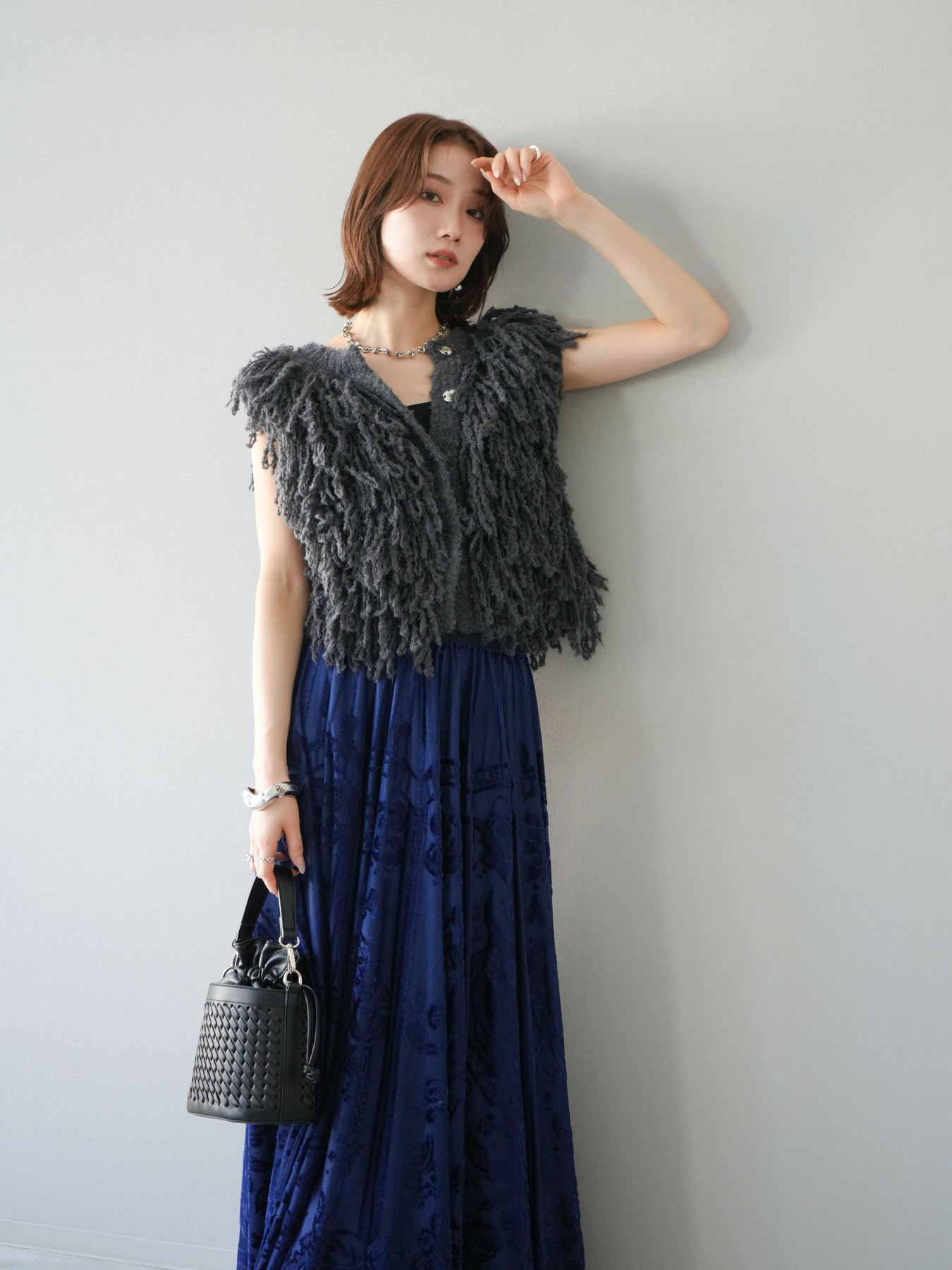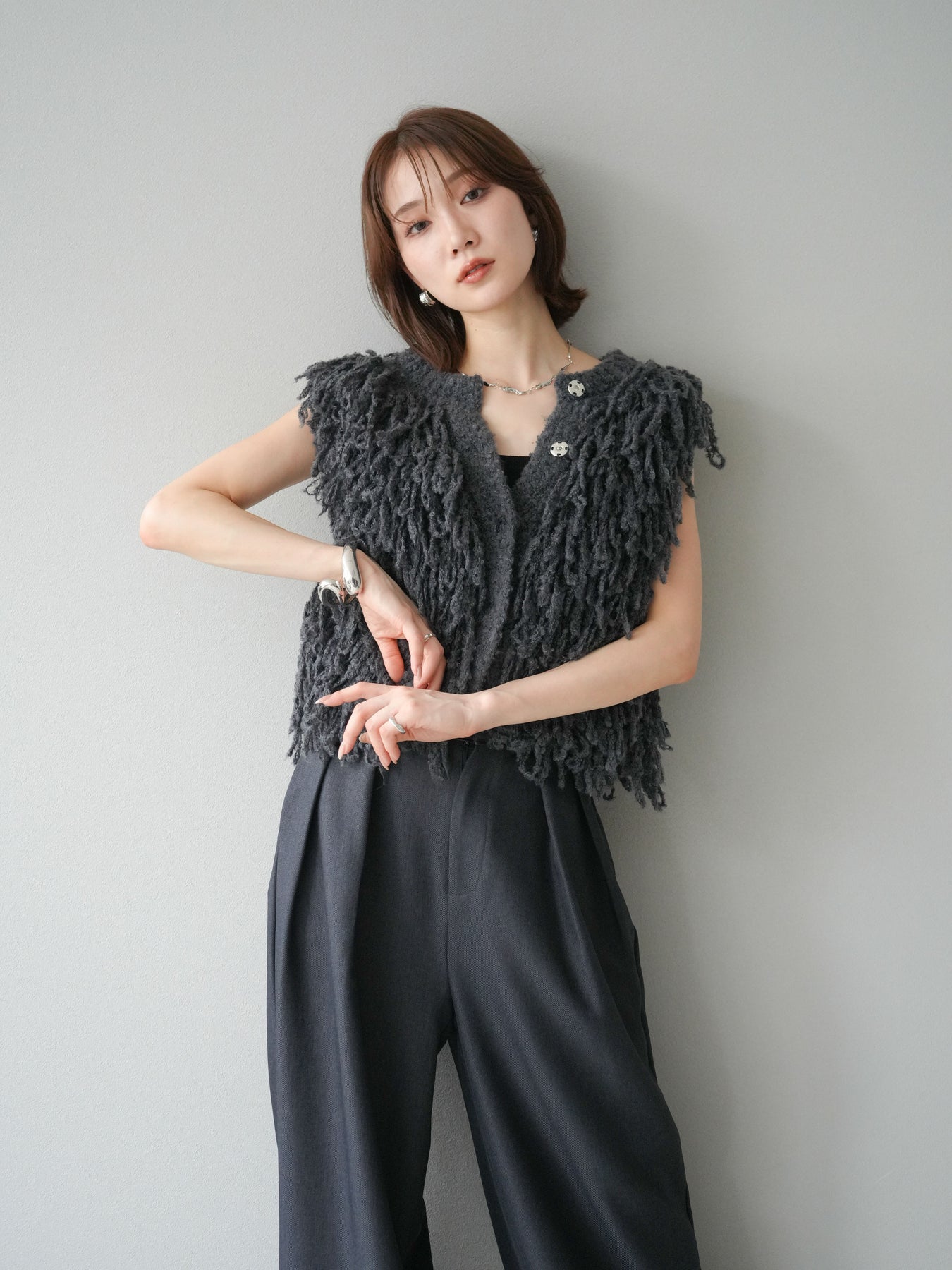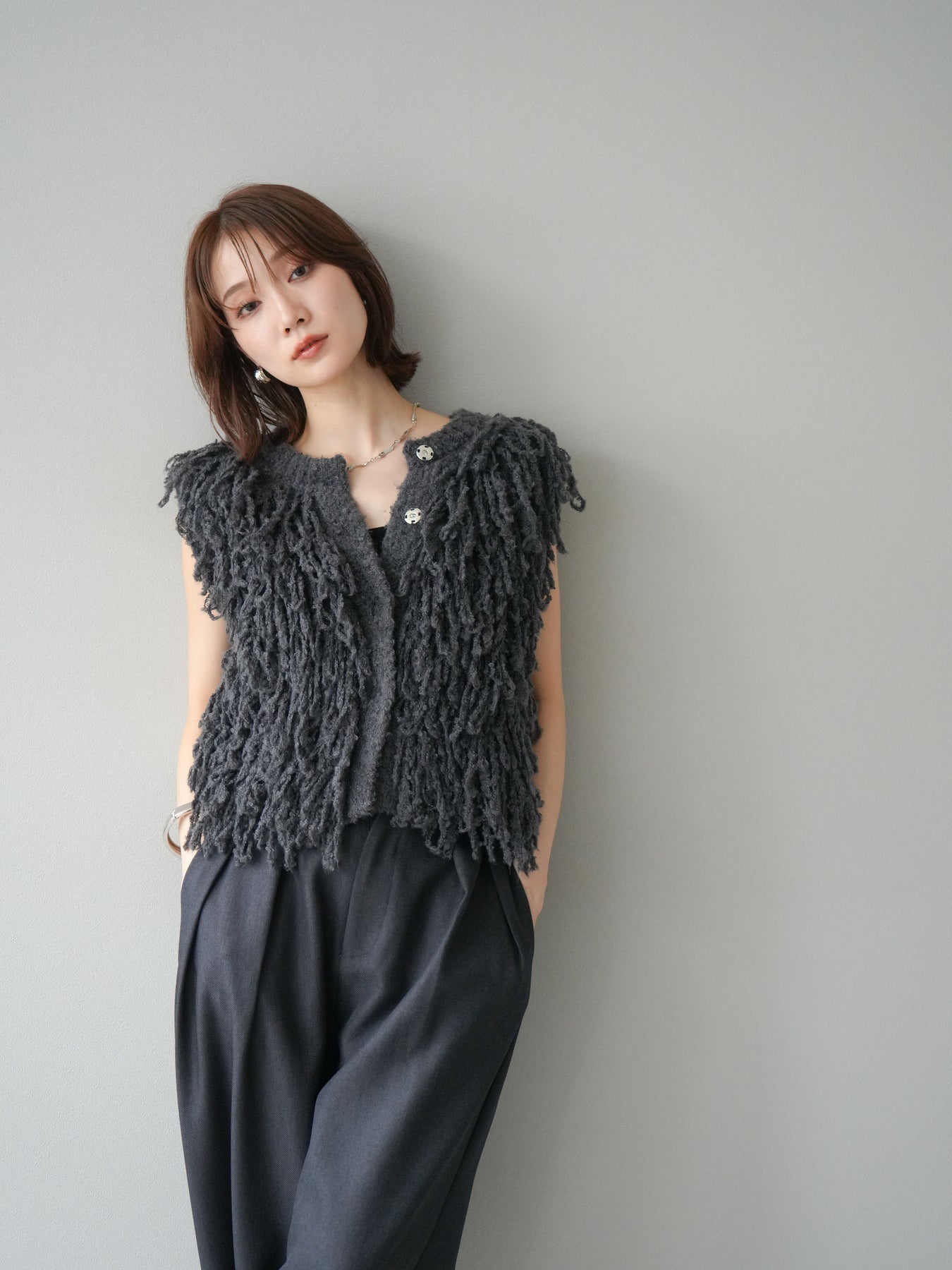 ループ状のフリンジを全体にあしらったデザイン性の高いニットベスト。立体感のある編地が存在感を放ち、シンプルなコーディネートにプラスするだけで華やぎを与えてくれます。程よくコンパクトな丈感でボトムスとのバランスが取りやすく、パンツスタイルにもスカートにも好相性。シャツやカットソーにレイヤードすることで季節を問わず活躍し、トレンド感あふれるスタイリングが完成します。軽やかな着心地で、アクセサリーとの相性も良く、着こなしをアップデートしてくれる一枚です。 ※ボトムス、キャミソール(インナー)以外の商品は一律でインナーは付属していません。