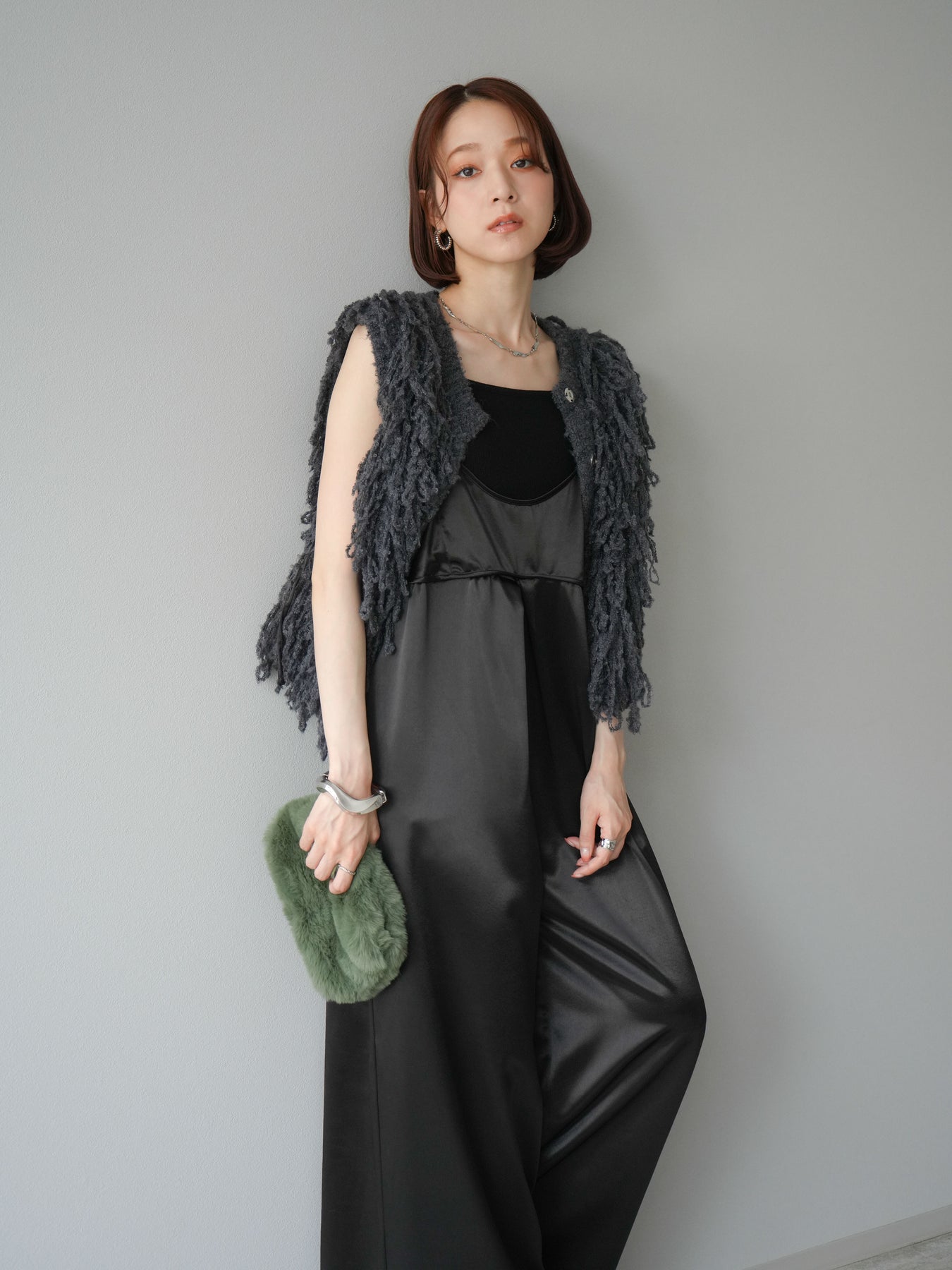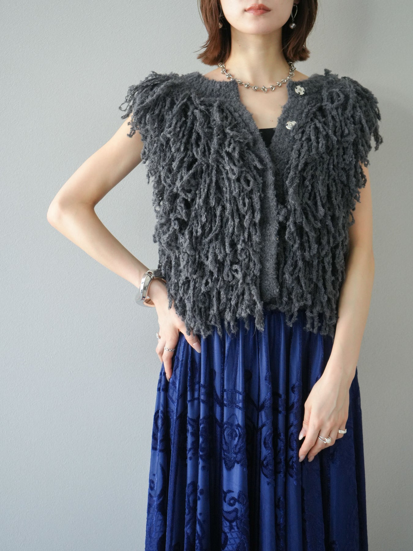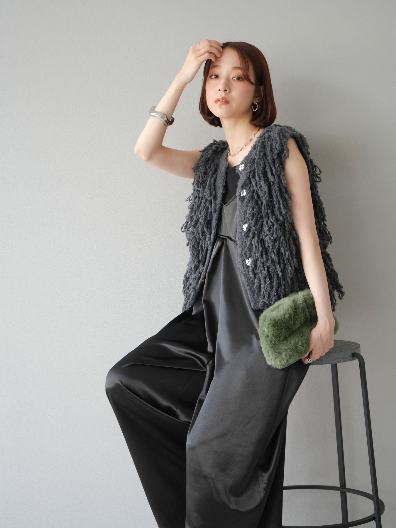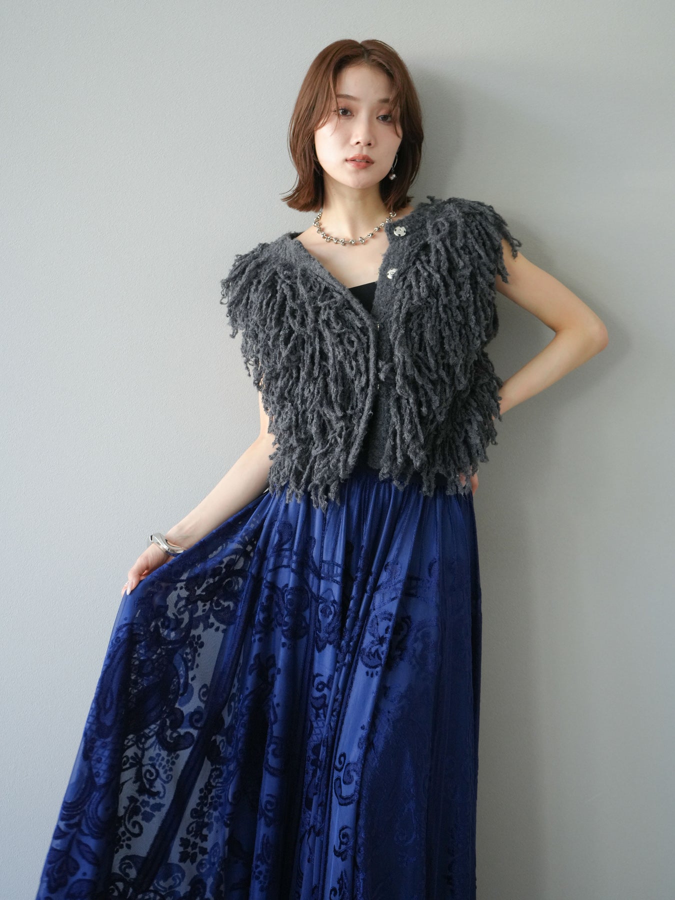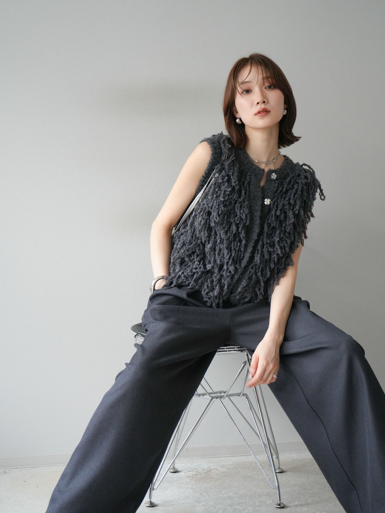 ループ状のフリンジを全体にあしらったデザイン性の高いニットベスト。立体感のある編地が存在感を放ち、シンプルなコーディネートにプラスするだけで華やぎを与えてくれます。程よくコンパクトな丈感でボトムスとのバランスが取りやすく、パンツスタイルにもスカートにも好相性。シャツやカットソーにレイヤードすることで季節を問わず活躍し、トレンド感あふれるスタイリングが完成します。軽やかな着心地で、アクセサリーとの相性も良く、着こなしをアップデートしてくれる一枚です。 ※ボトムス、キャミソール(インナー)以外の商品は一律でインナーは付属していません。