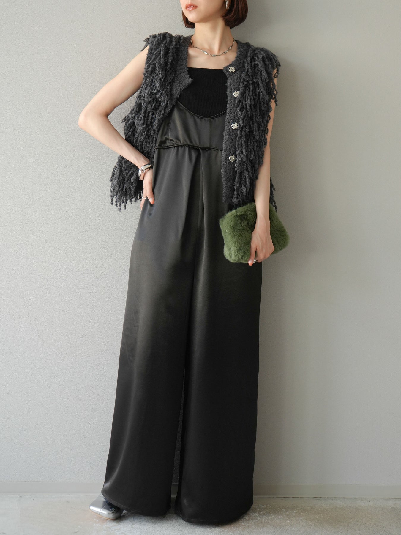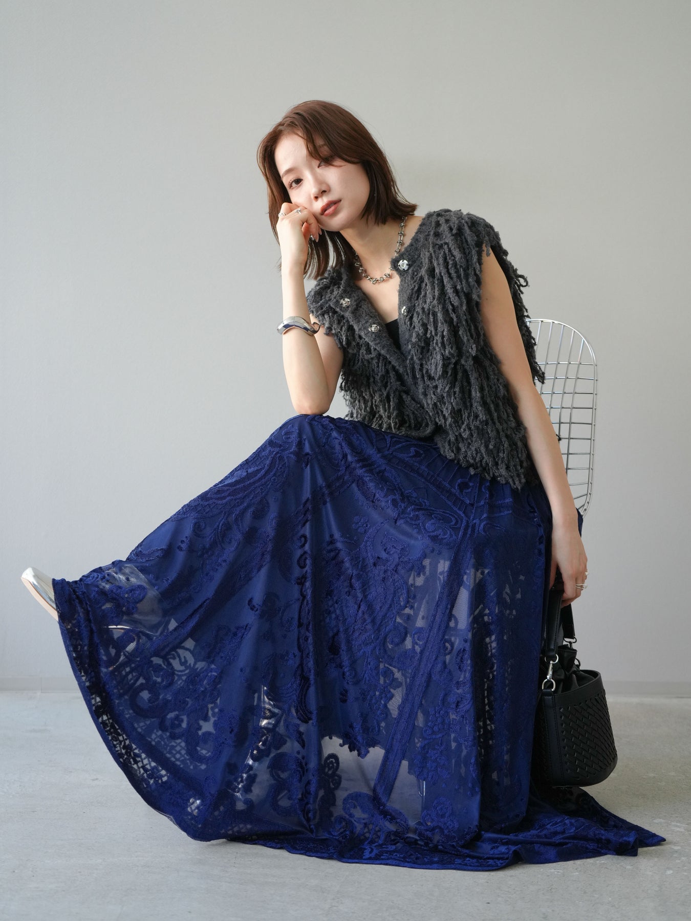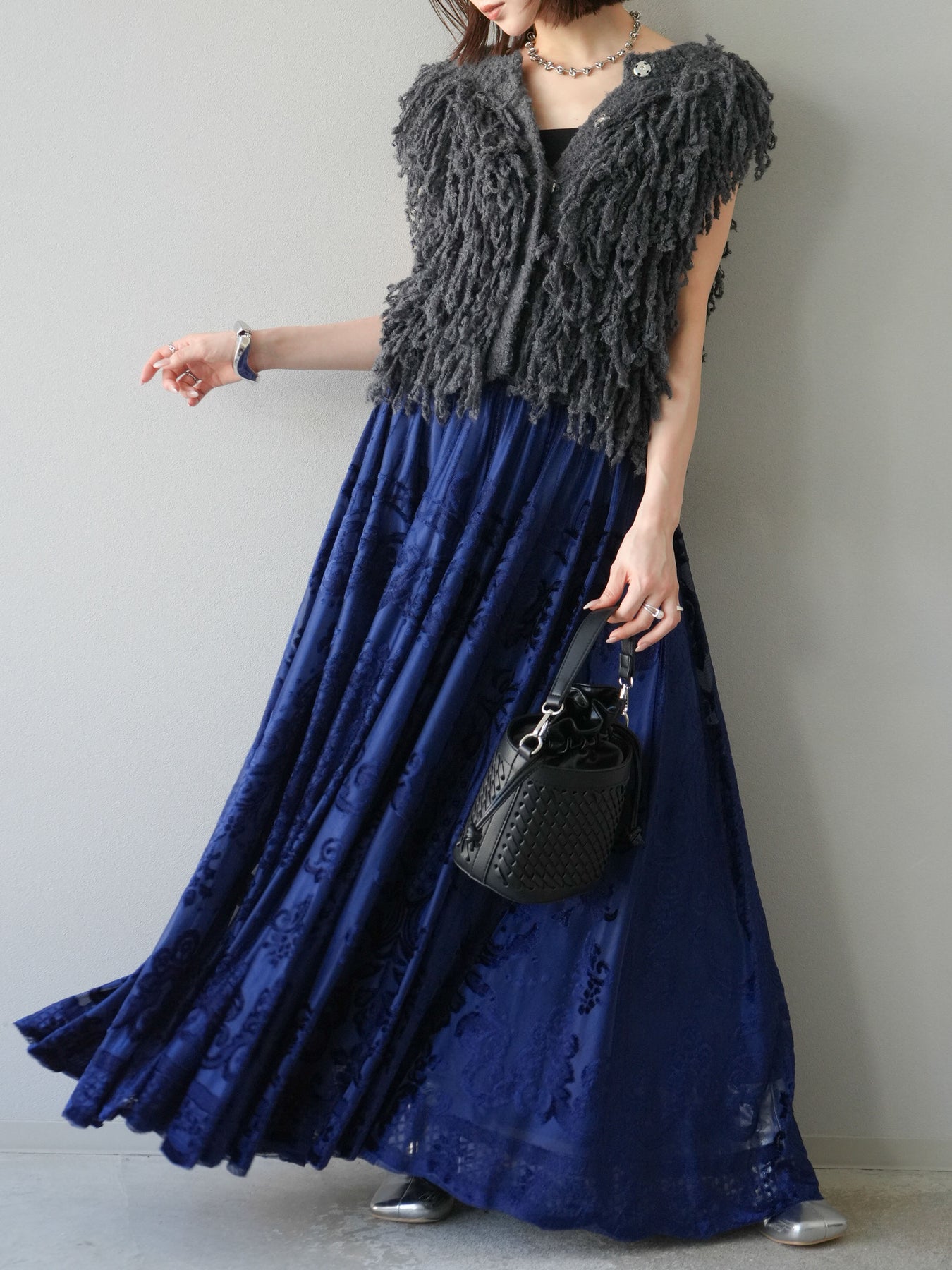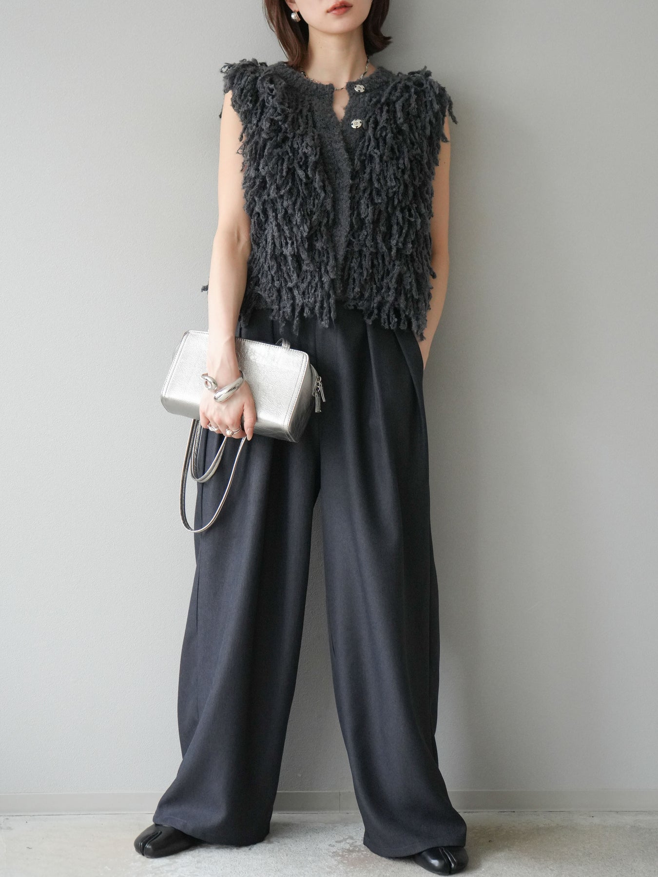 ループ状のフリンジを全体にあしらったデザイン性の高いニットベスト。立体感のある編地が存在感を放ち、シンプルなコーディネートにプラスするだけで華やぎを与えてくれます。程よくコンパクトな丈感でボトムスとのバランスが取りやすく、パンツスタイルにもスカートにも好相性。シャツやカットソーにレイヤードすることで季節を問わず活躍し、トレンド感あふれるスタイリングが完成します。軽やかな着心地で、アクセサリーとの相性も良く、着こなしをアップデートしてくれる一枚です。 ※ボトムス、キャミソール(インナー)以外の商品は一律でインナーは付属していません。