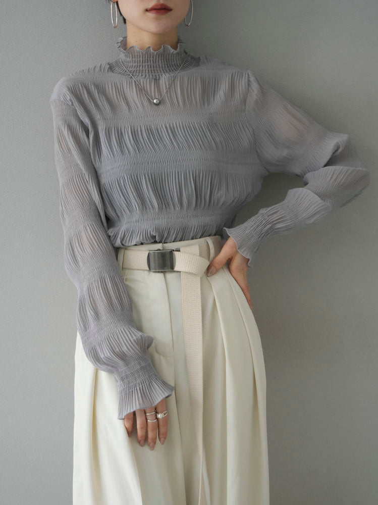シャーリングをボーダー状に施したハイネックプルオーバー。セミシアーなシフォン素材がエレガントな雰囲気を高め、透け感が抜けを演出してくれます。ネック部分や袖口のフリルが大人可愛いアクセントに。中にキャミソールを合わせたり、ニットやワンピースの中に仕込んだりと、一枚あれば様々なレイヤードスタイルをお楽しみいただけます。