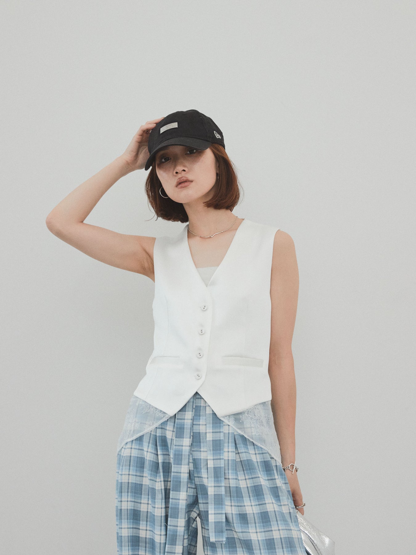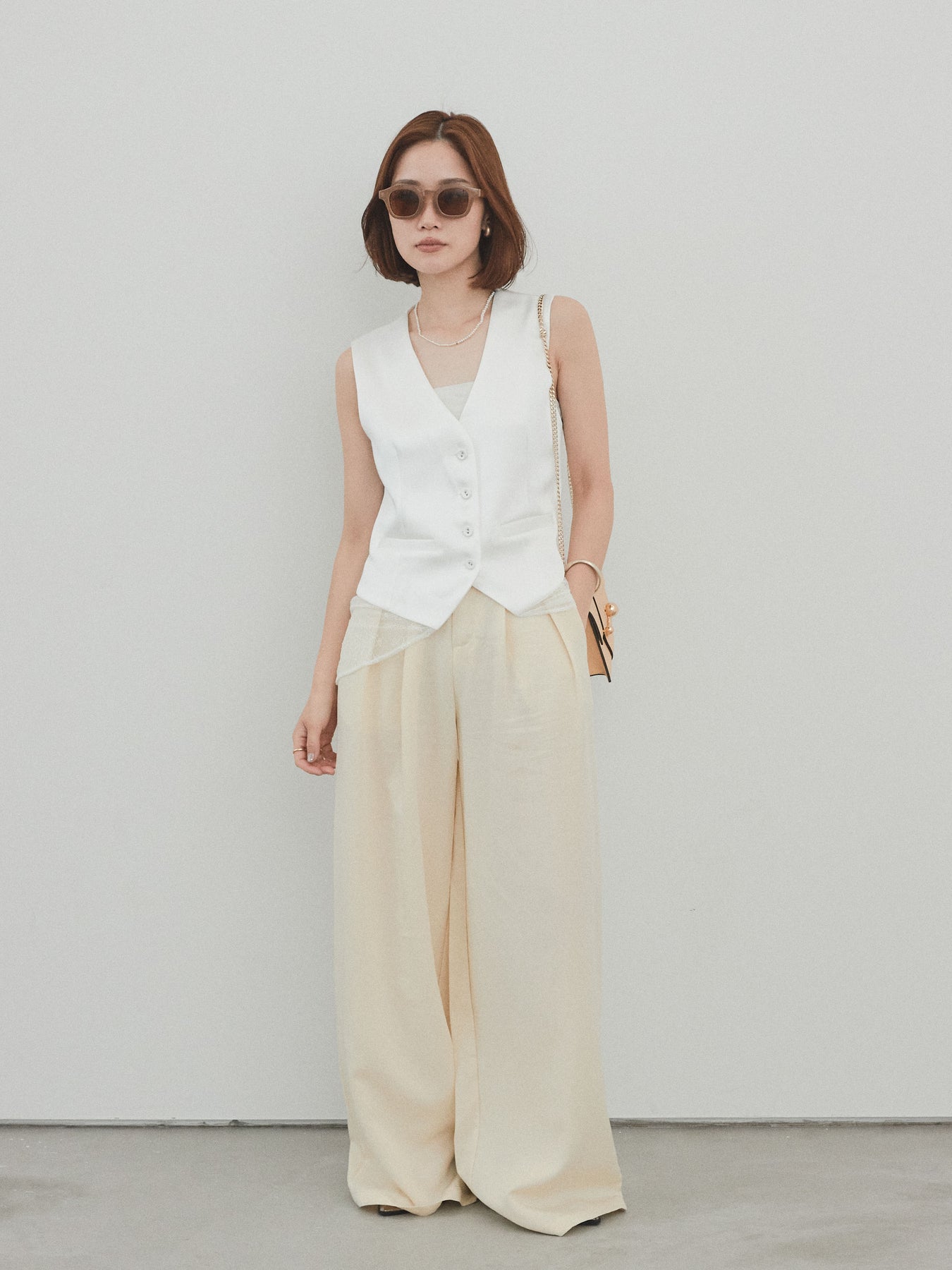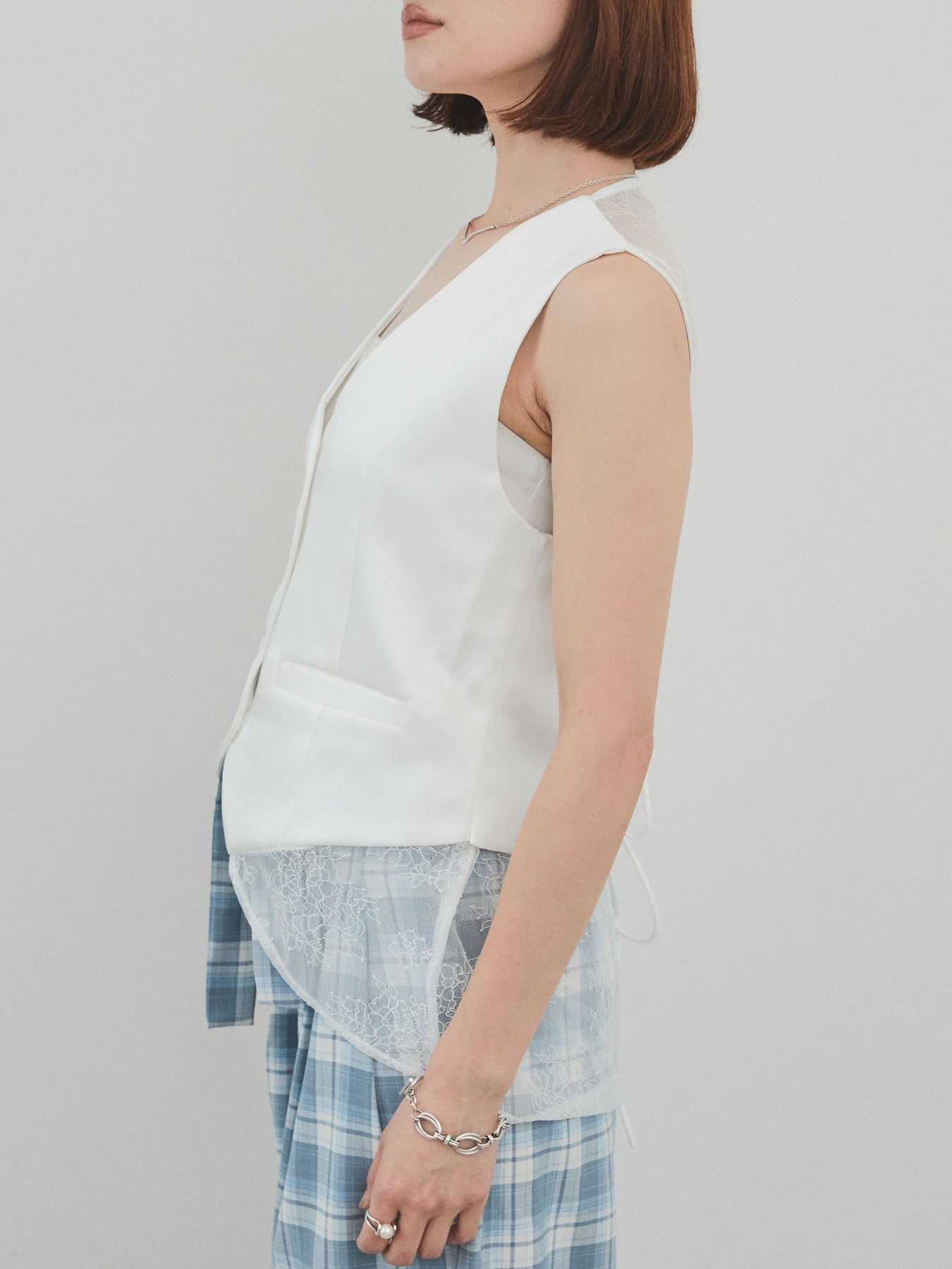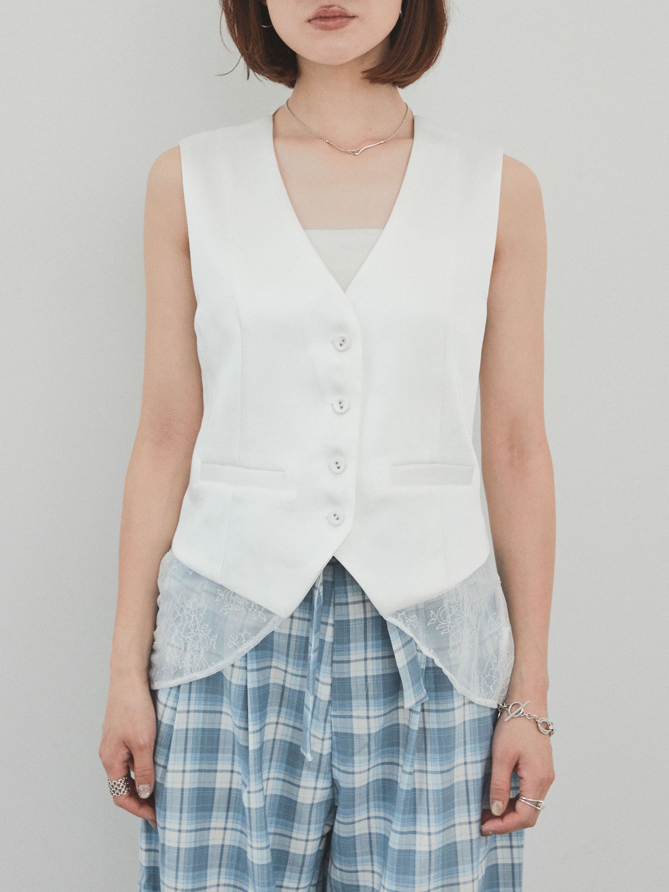 上品な光沢感が魅力のサテン素材に、繊細なレースを切り替えたデザインベスト。モード感漂うVネックシルエットと、裾からのぞくレースがスタイリングに女性らしさをプラスしてくれます。前を留めて1枚着風に着こなすのはもちろん、Tシャツやシアートップスとのレイヤードスタイルもおすすめ。きれいめにもカジュアルにも合わせやすく、コーディネートの主役として活躍してくれる一着です。 ※ボトムス、キャミソール(インナー)以外の商品は一律でインナーは付属していません。