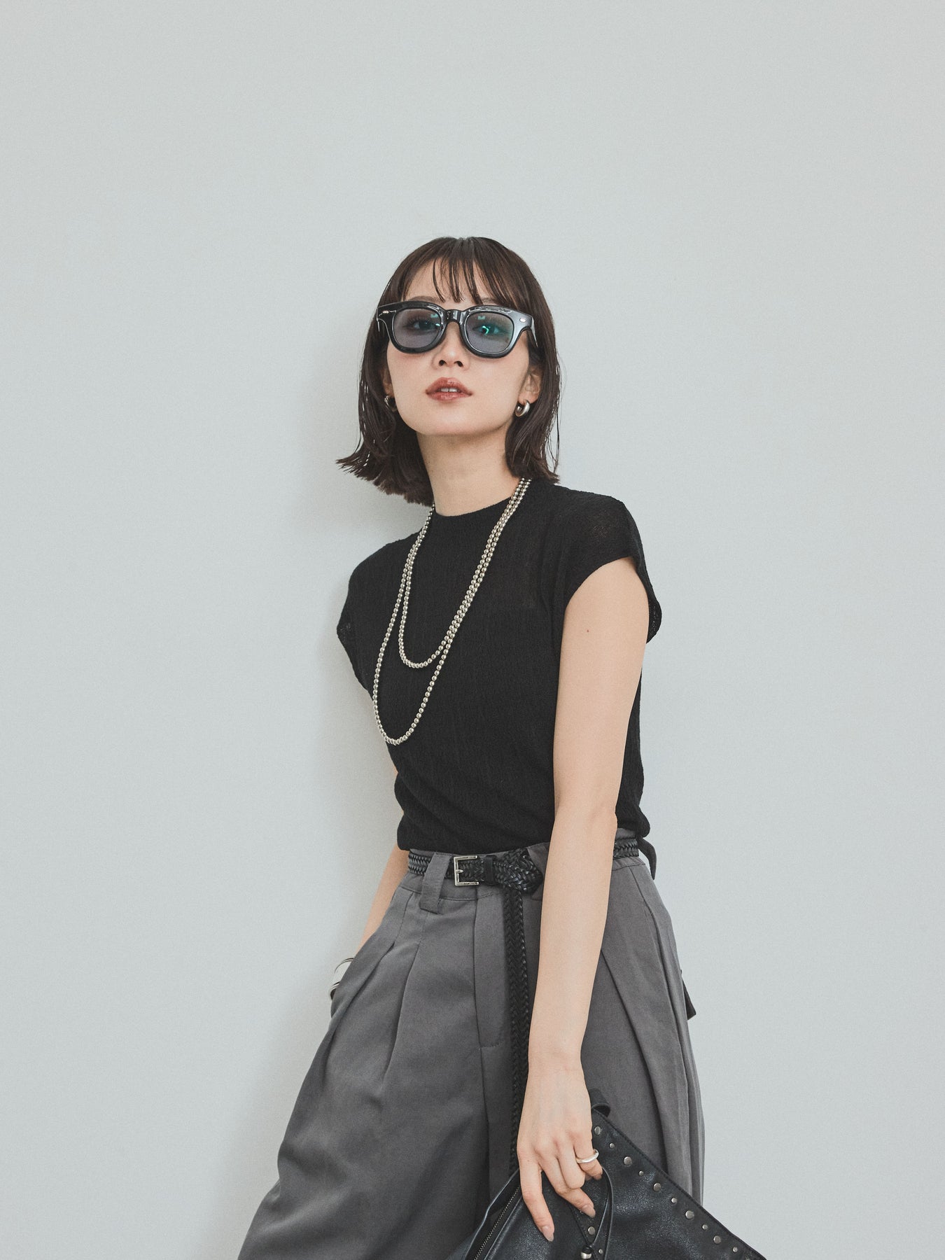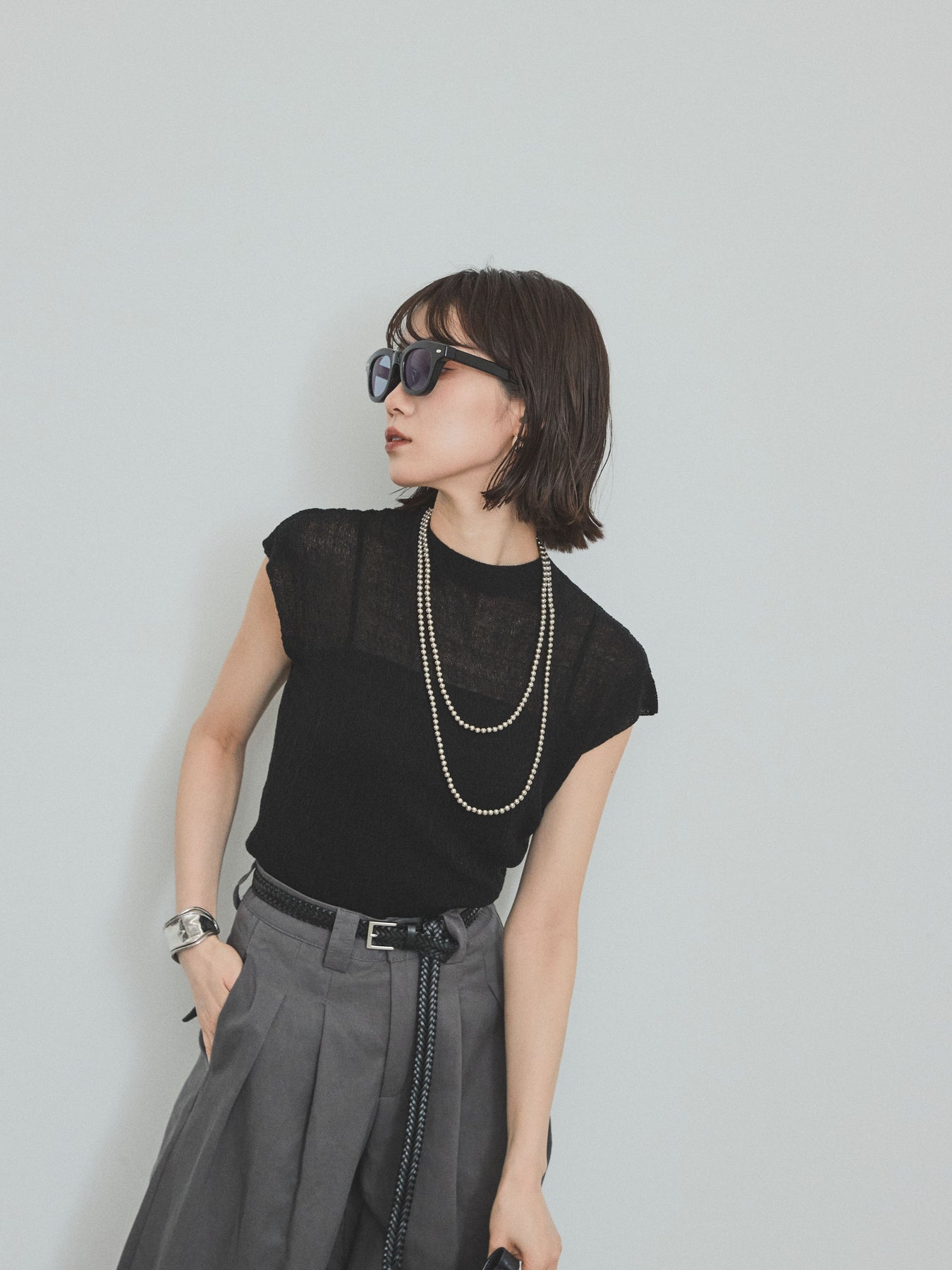 ほどよい透け感が涼しげな印象を与える、フレンチスリーブのシアーニットトップス。柔らかく伸縮性のある素材で、軽やかな着心地が魅力の一枚です。コンパクトながらもボディラインを拾いすぎない絶妙なシルエットで、どんなボトムともバランス良く着こなせます。シンプルながらもニュアンスのある表情があり、インナーとのレイヤードを楽しめるのもポイント。デイリーからオフィスカジュアルまで幅広く活躍する、着回し力抜群のアイテムです。 ※ボトムス、キャミソール(インナー)以外の商品は一律でインナーは付属していません。