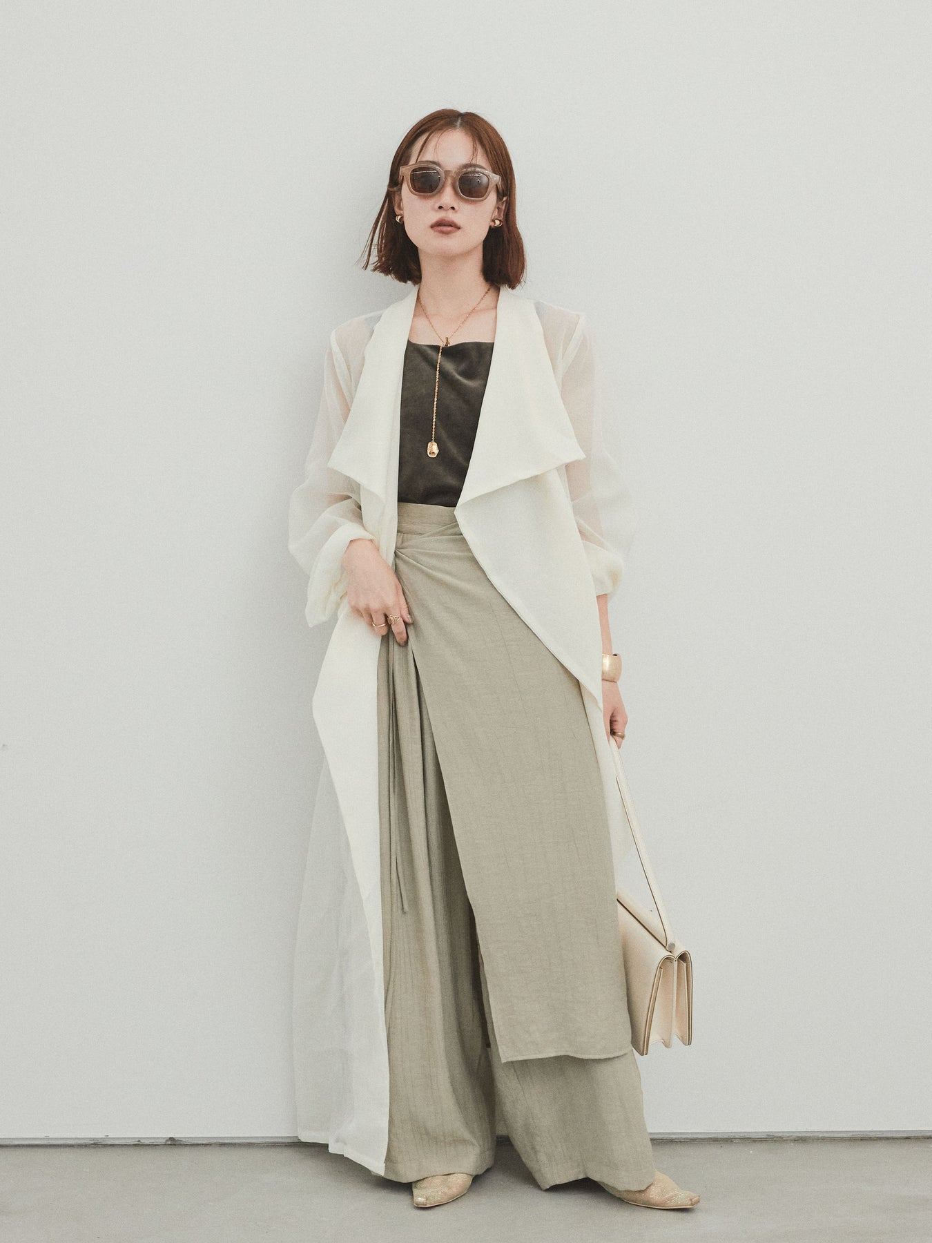 一見スカートのように見えるデザインが特徴的な、ワッシャーサテンレイヤードスカートパンツ。軽やかで落ち感のある素材を使用し、動くたびにふんわりと揺れるシルエットが女性らしさを演出します。パンツの上からレイヤードされた生地がモード感をプラスしつつ、ウエストはゴム仕様でストレスフリーな穿き心地。カジュアルからきれいめまで、幅広いスタイリングにマッチします。セットアップとしての着用はもちろん、単品でもコーディネートの主役になる一着です。
