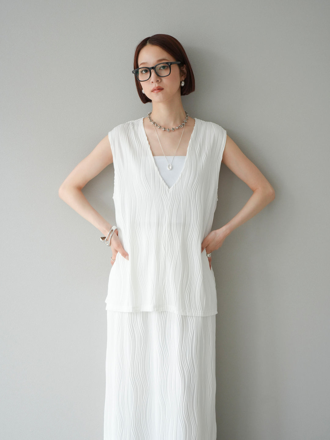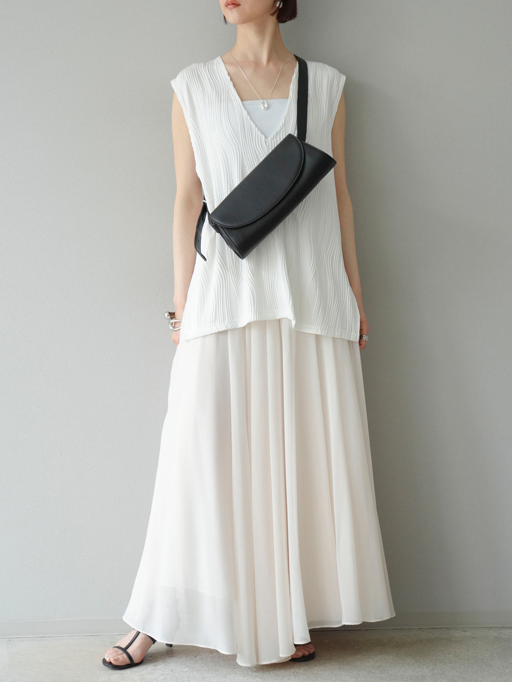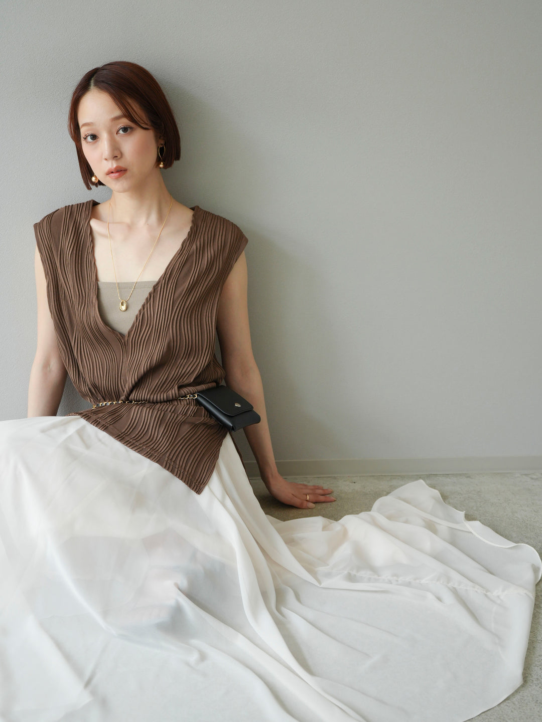 [SET]ウェーブパイピングVネックベスト+シフォンフレアスカート(2set)