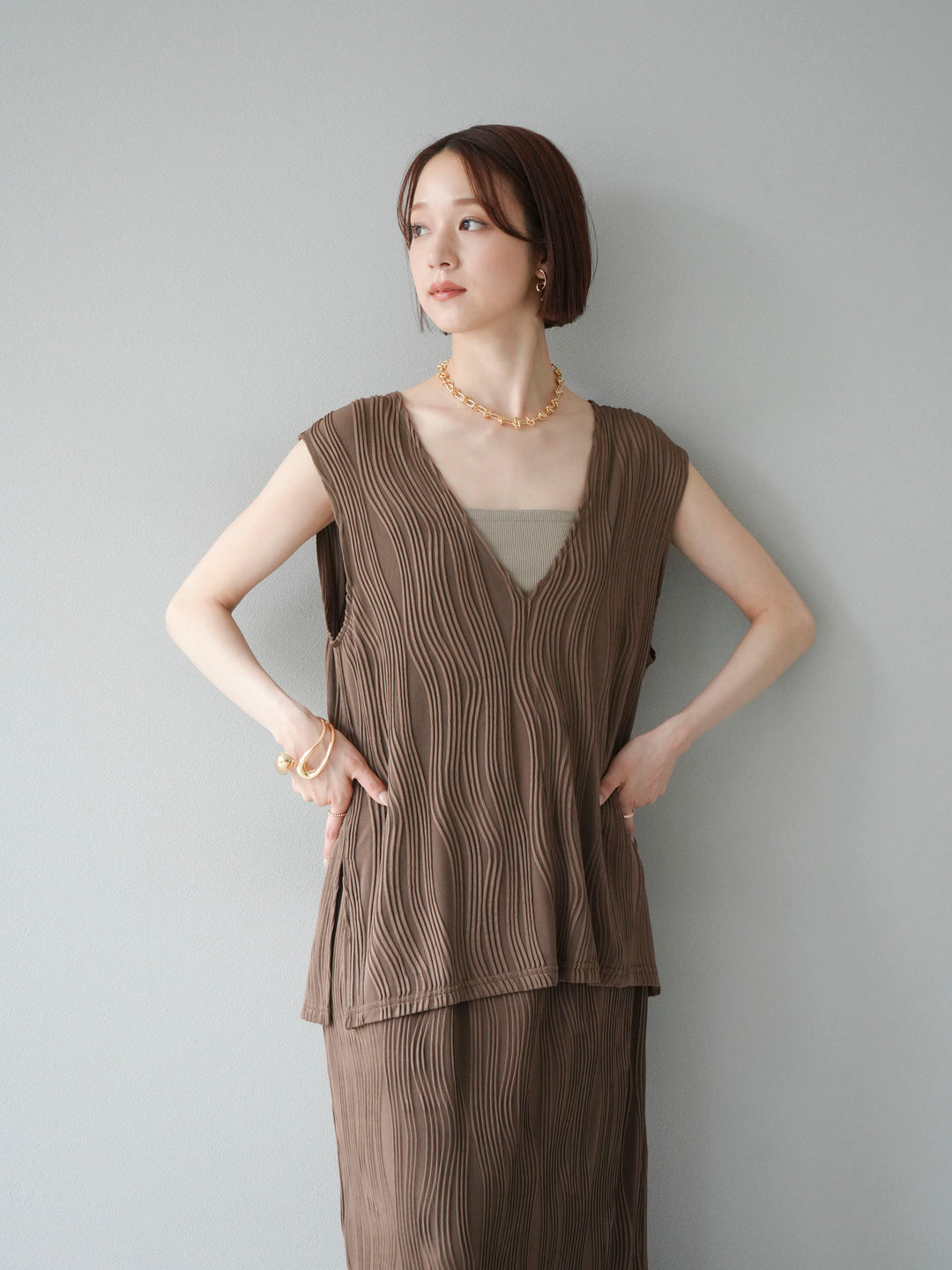 [SET]ウェーブパイピングVネックベスト+カップ付テレコリブベアキャミソール(2set)