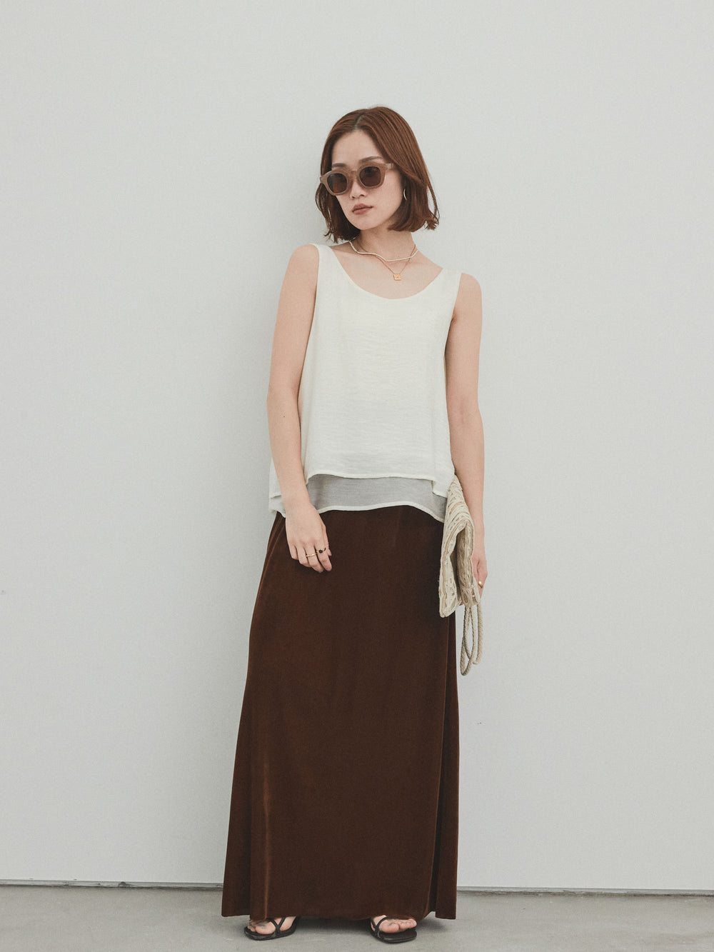 [SET]ワッシャーサテンシアーレイヤードタンクトップ+ベロアナロースカート(2set)